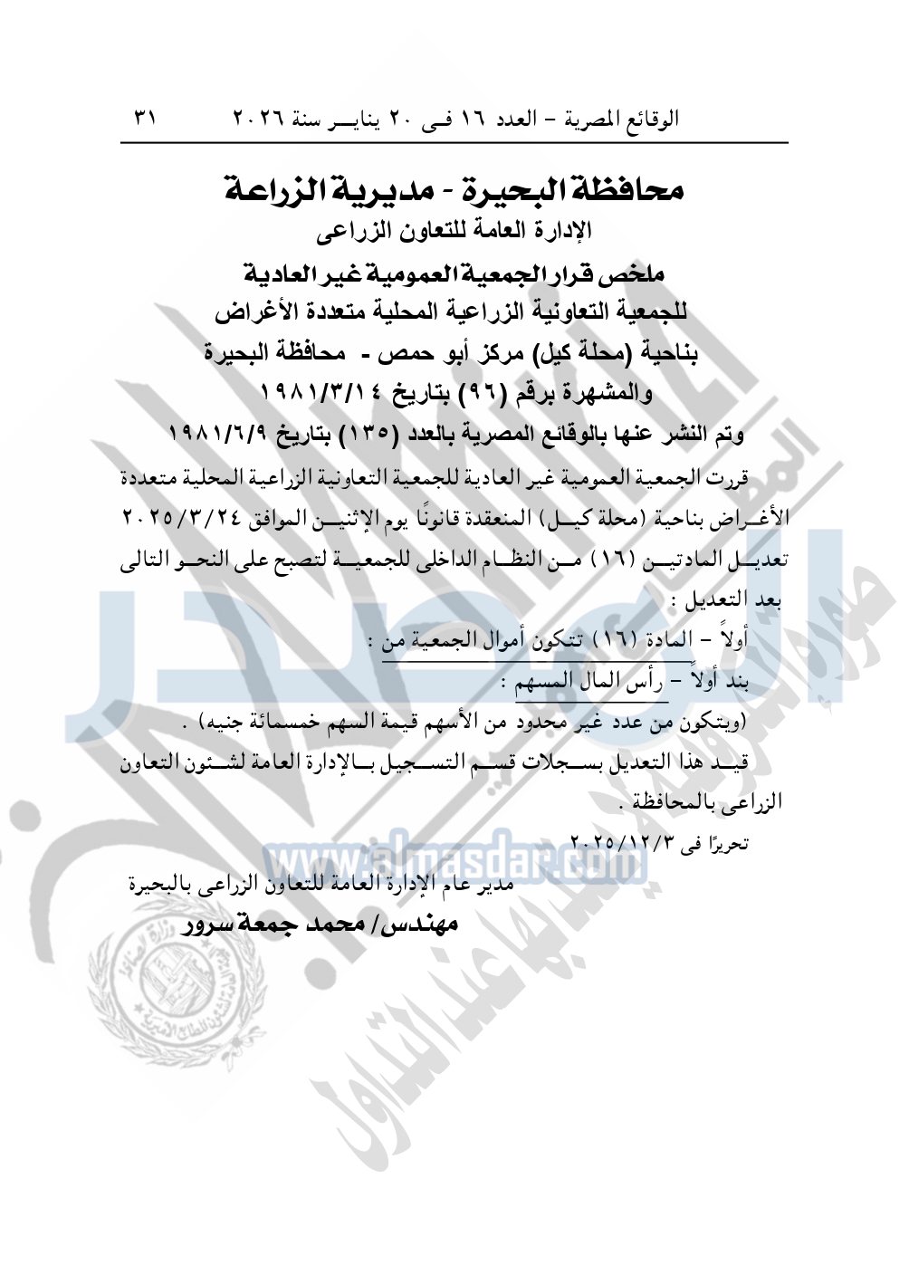 نشرت الوقائع المصرية في العدد 16 الصادر في 20 يناير سنة 2026، محافظة البحيرة – مديرية الزراعة، الإدارة العامة للتعاون الزراعي، ملخص قرار الجمعية العمومية غير العادية للجمعية التعاونية الزراعية المحلية متعددة الأغراض بناحية "محلة كيل" مركز أبو حمص – محافظة البحيرة والمشهرة برقم "96" بتاريخ 14-3-1981.