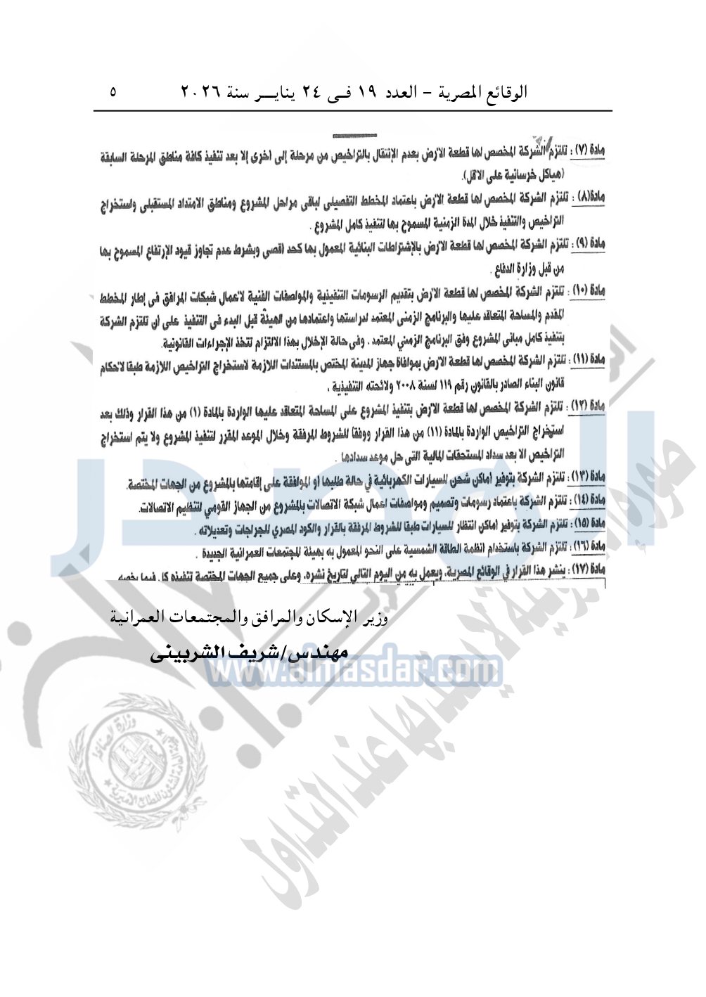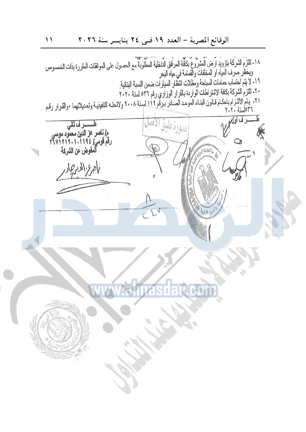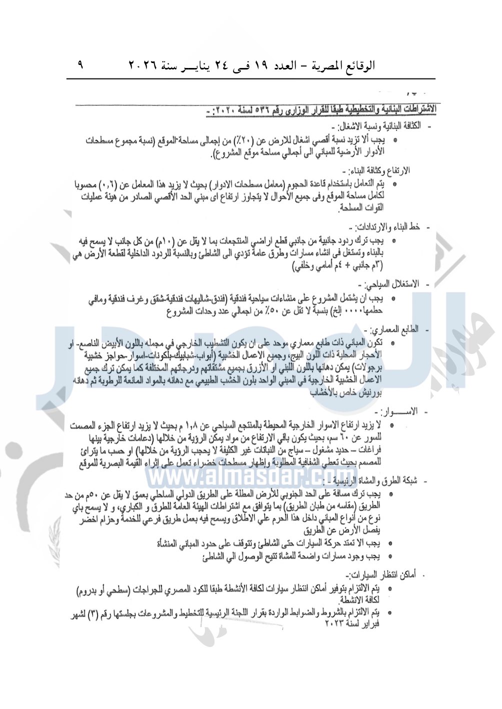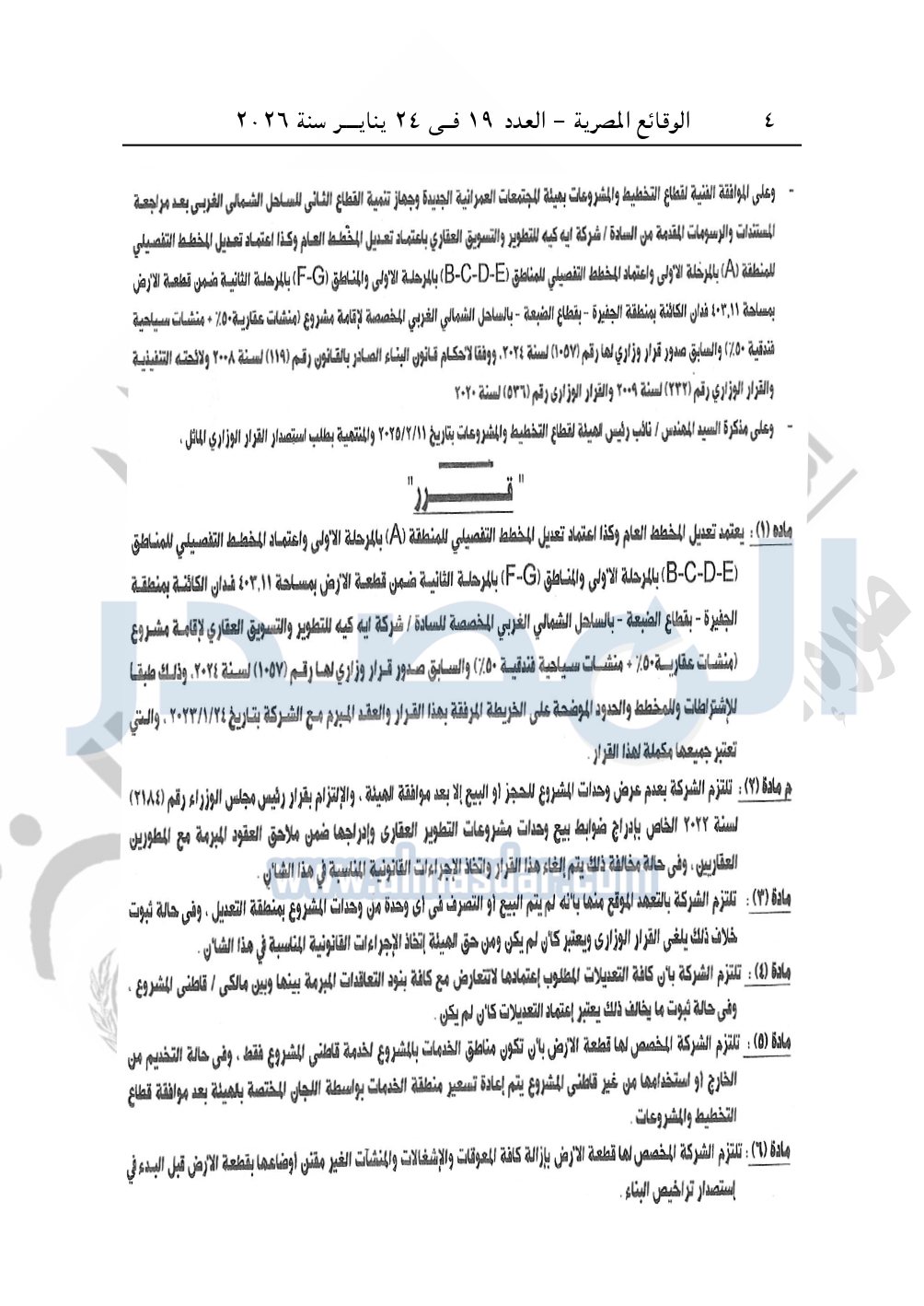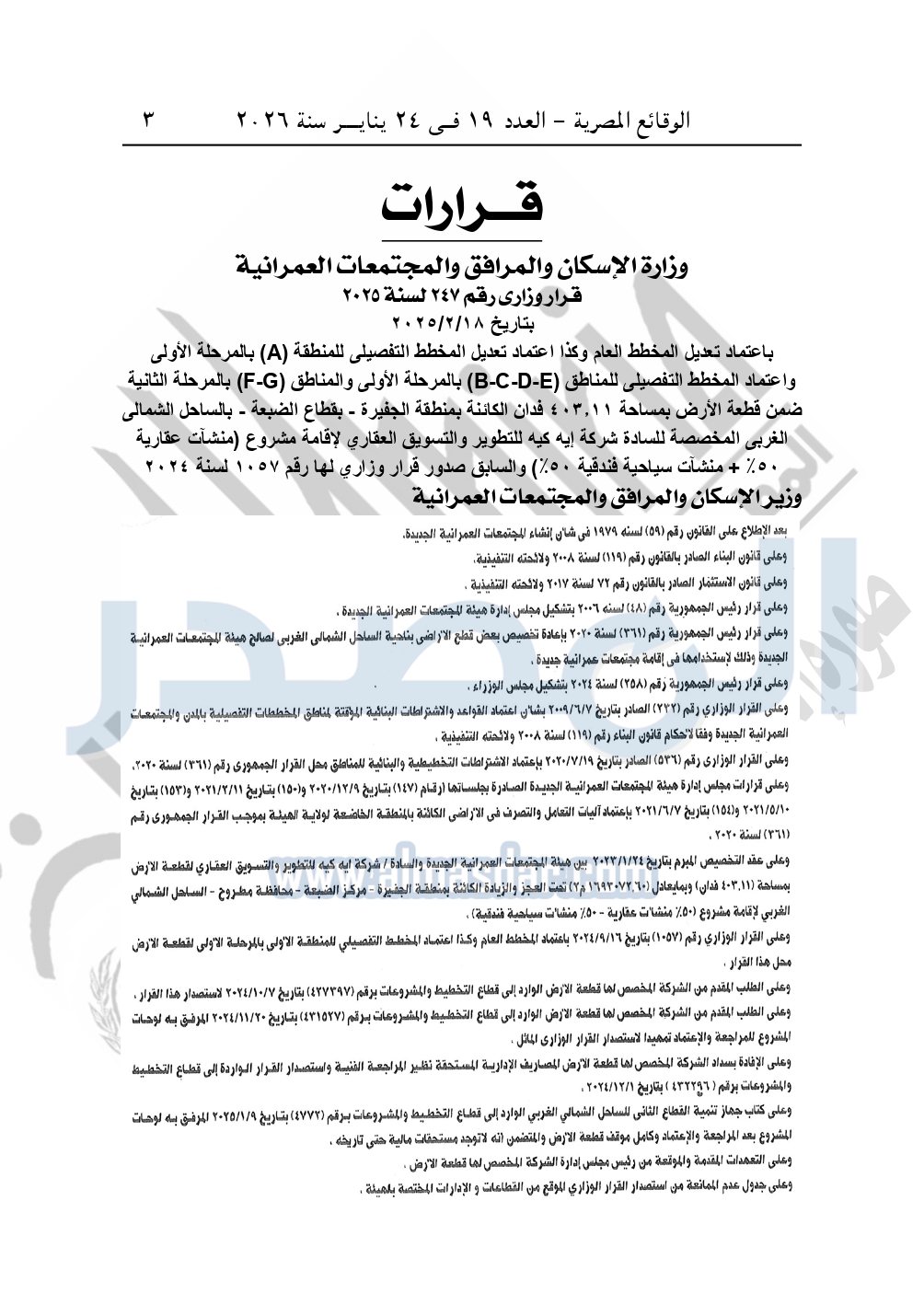 نشرت الوقائع المصرية، في العدد 19، الصادر في 24 يناير سنة 2026، قرار وزارة الإسكان والمرافق والمجتمعات العمرانية، قرار وزاري رقم 247 لسنة 2025، بتاريخ 18-2-2025، بشأن اعتماد تعديل مخطط قطعة أرض بالساحل الشمالي الغربى المخصصة لشركة إيه كيه للتطوير والتسويق العقاري لإقامة مشروع "منشآت عقارية 50% + منشآت سياحية فندقية 50%".