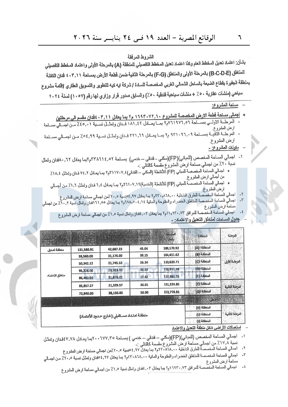 يعتمد تعديل المخطط العام وكذا اعتماد تعديل المخطط التفصيلي للمنطقة "A" بالمرحلة الأولى واعتماد المخطط التفصيلي للمناطق "B-C-D-E" بالمرحلة الأولى والمناطق "F-G" بالمرحلة الثانية ضمن قطعة الأرض بمساحة 403.11 فدان الكائنة بمنطقة الجفيرة - بقطاع الضبعة - بالساحل الشمالي الغربى المخصصة لشركة إيه كيه للتطوير والتسويق العقاري لإقامة مشروع "منشآت عقارية 50% + منشآت سياحية فندقية 50%" والسابق صدور قرار وزاري لها رقم 1057 لسنة 2024، وذلك طبقا للإشتراطات وللمخطط والحدود الموضحة على الخريطة المرفقة بهذا القرار والعقد المبرم مع الشركة بتاريخ 24-1-2023، والتي تعتبر جميعها مكملة لهذا القرار.