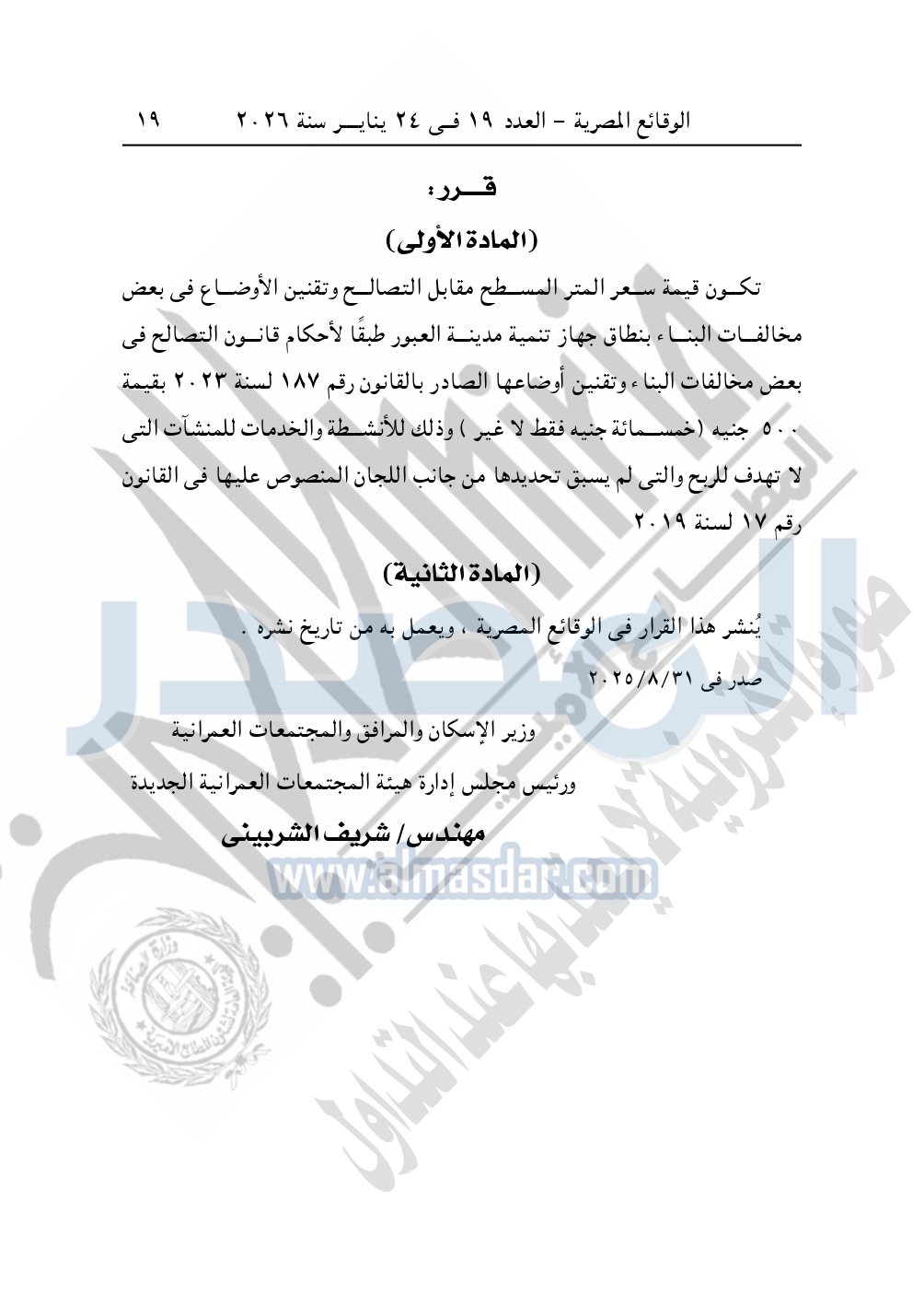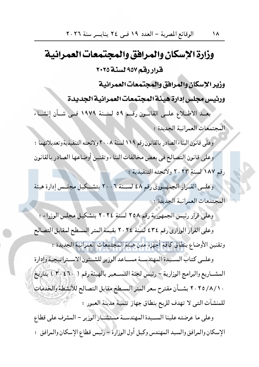 نشرت الوقائع المصرية، في العدد 19، الصادر في 24 يناير سنة 2026، قرار وزارة الإسكان والمرافق والمجتمعات العمرانية، قرار وزاري رقم 957 لسنة 2025، بشأن تحديد مقابل التصالح في مخالفات البناء وتقنين الأوضاع بمدينة العبور.