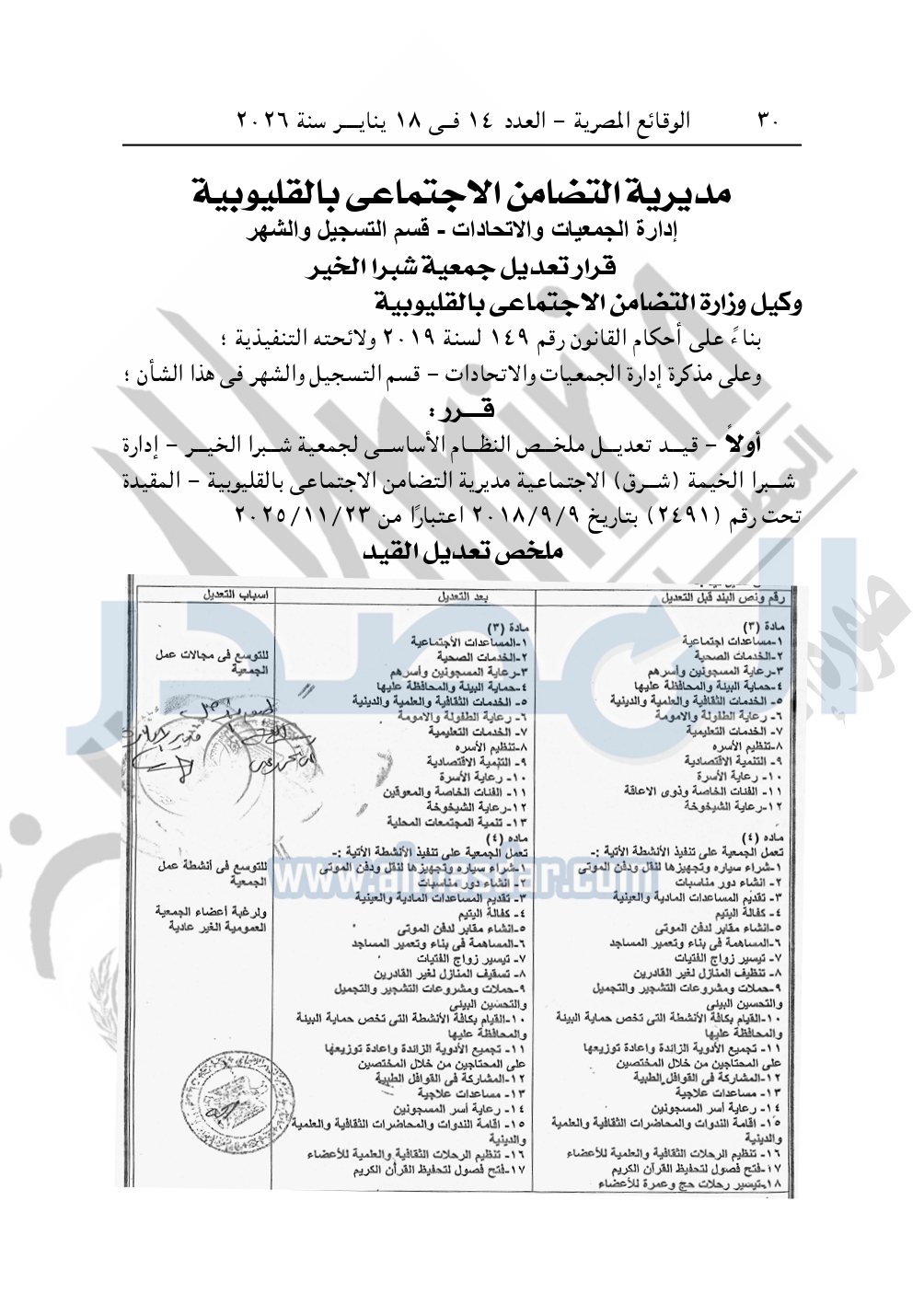 نشرت الوقائع المصرية، في العدد 14، بتاريخ 18 يناير 2026، قرار مديرية التضامن الاجتماعي بالقليوبية، بشأن تعديل قيد جمعية شبرا الخير.