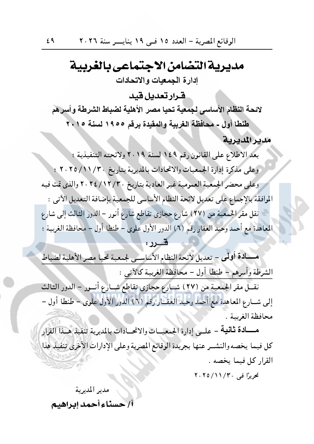 كما نشرت الوقائع المصرية، في العدد 15، بتاريخ 19 يناير 2026، قرار مديرية التضامن الاجتماعي بالغربية، رقم 1955 لسنة 2015، بشأن تعديل قيد جمعية تحيا مصر الأهلية لضباط الشرطة وأسرهم طنطا أول – محافظة الغربية.