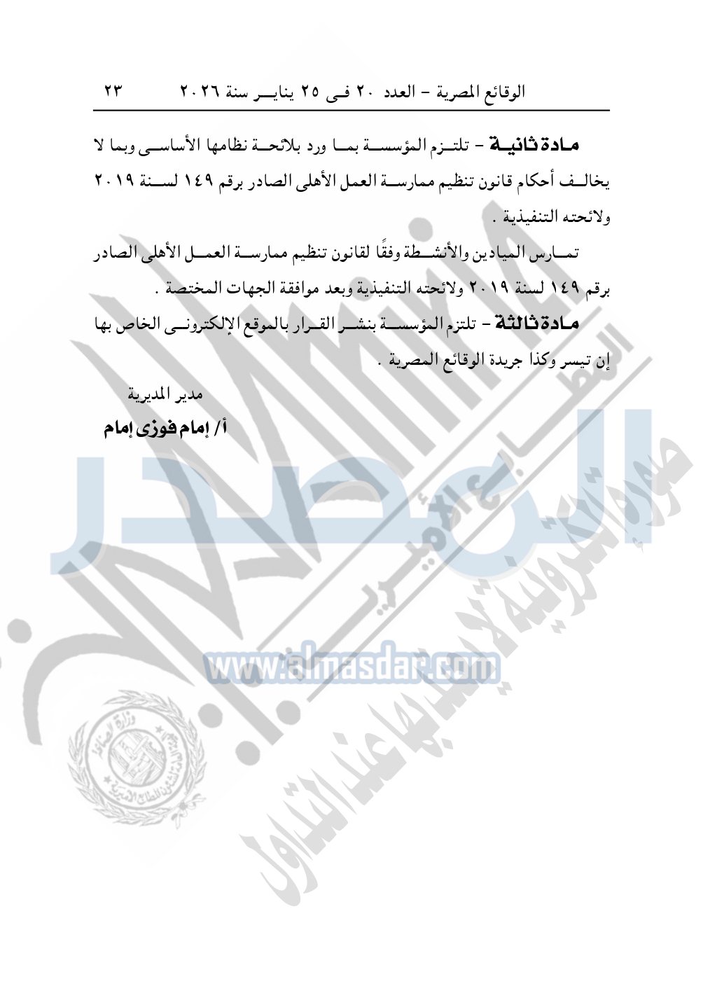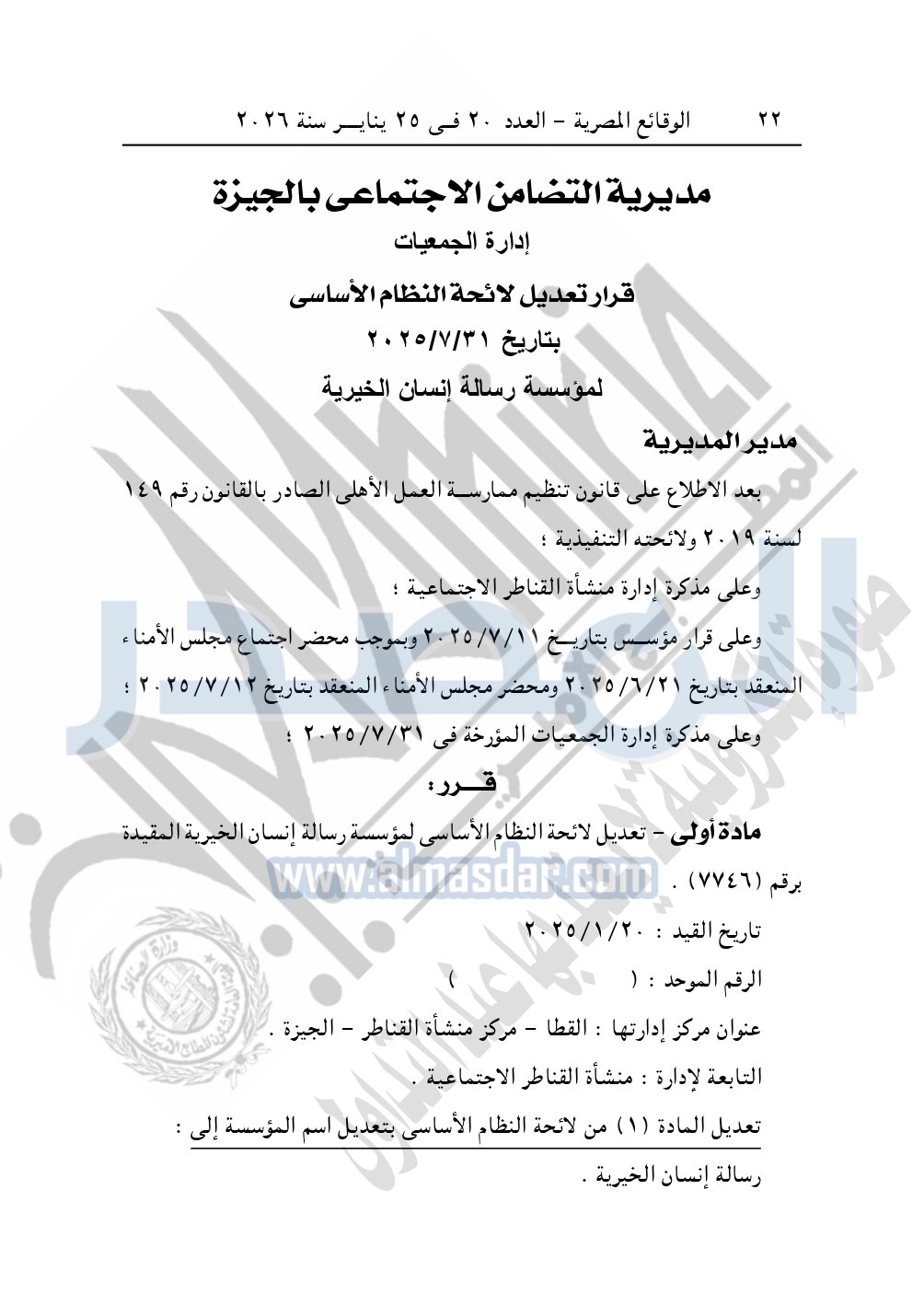 وأيضا نشرت الوقائع المصرية، في العدد 20، بتاريخ 25 يناير 2026، قرار مديرية التضامن الاجتماعي بالجيزة، رقم 7746، بتاريخ 31-7-2025، بشأن تعديل قيد مؤسسة رسالة إنسان الخيرية.