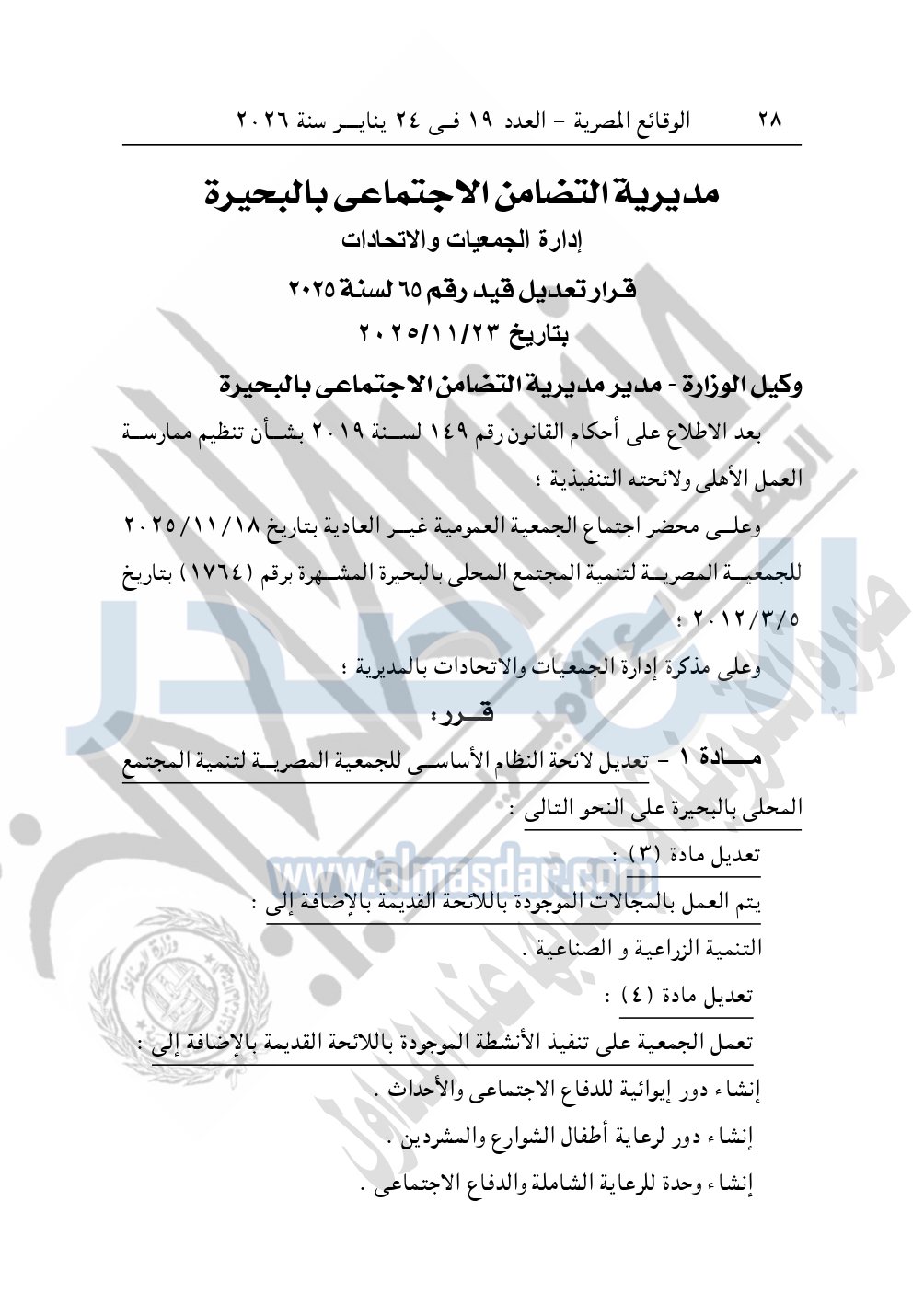 ونشرت الوقائع المصرية، في العدد 19، بتاريخ 24 يناير 2026، قرار مديرية التضامن الاجتماعي بالبحيرة، رقم 65 لسنة 2025، بتاريخ 23-11-2025، بشأن تعديل قيد الجمعية المصرية لتنمية المجتمع المحلي بالبحيرة.