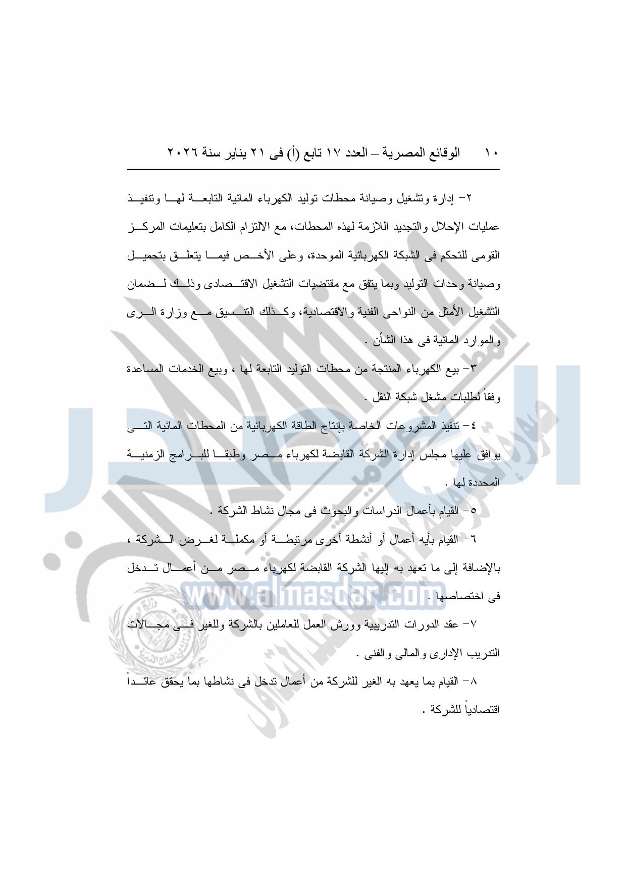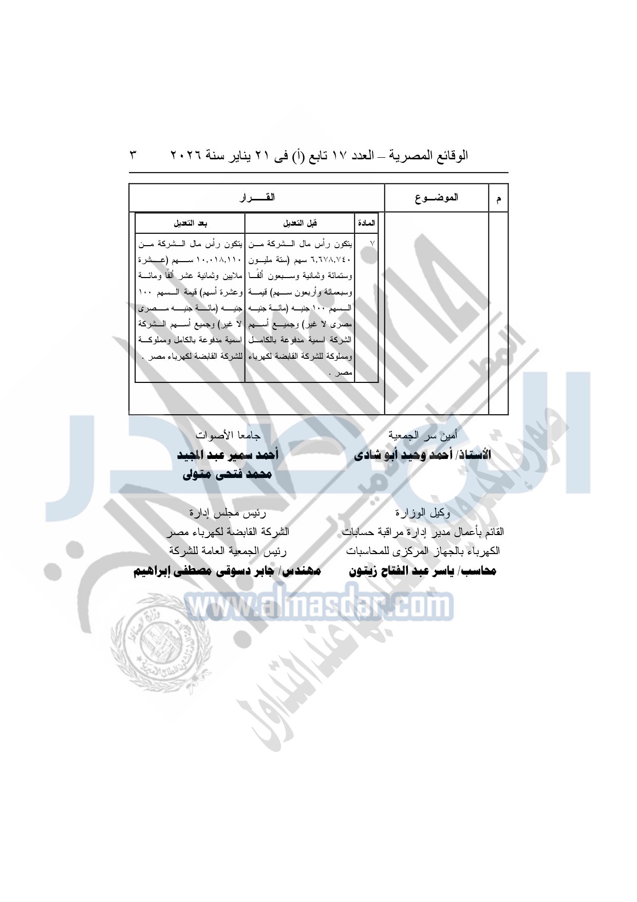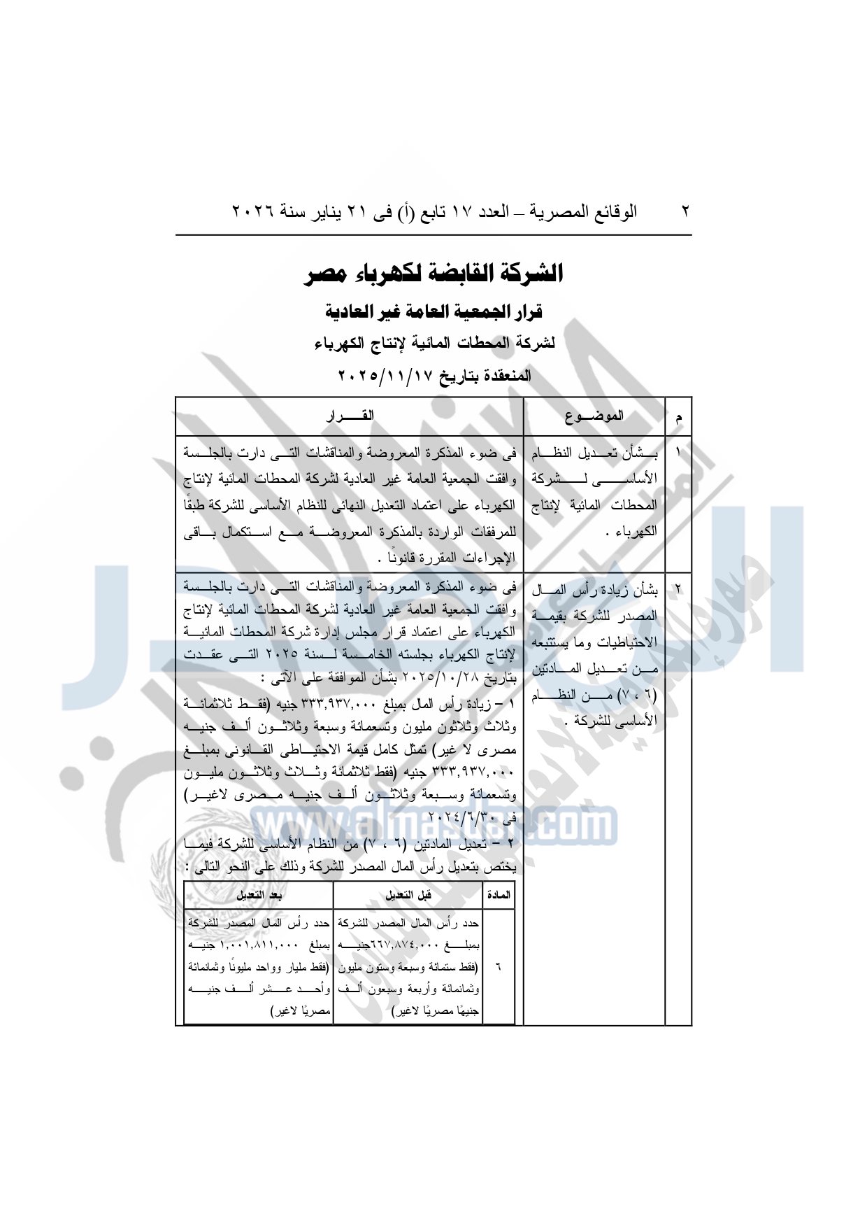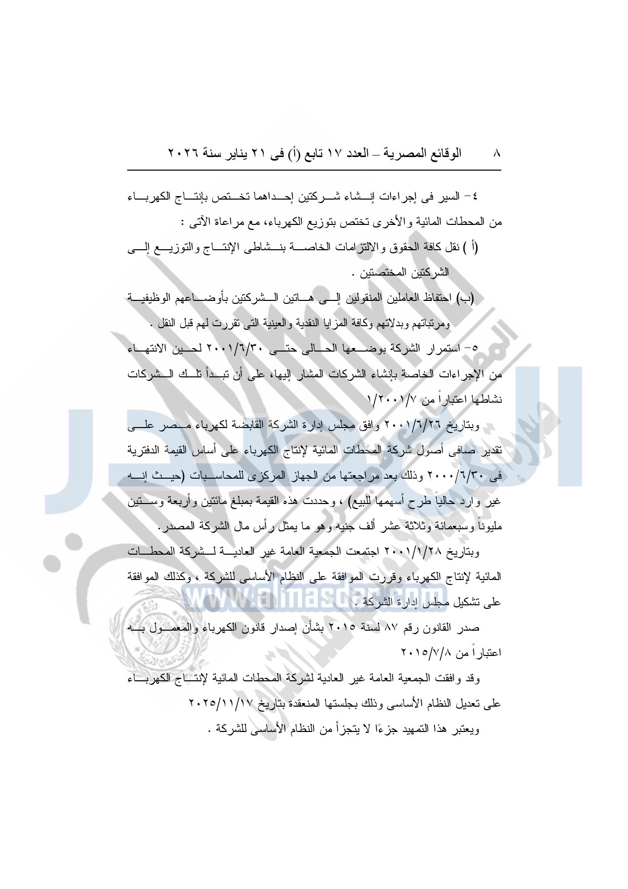 نشرت الوقائع المصرية، في العدد 17 تابع "أ"، الصادر فى 21 يناير سنة 2026، قرار الشركة القابضة لكهرباء مصر، قرار الجمعية العامة غير العادية، لشركة المحطات المائية لإنتاج الكهرباء، المنعقدة بتاريخ 17-11-2025، بشأن تعديل النظام الأساسي لشركة المحطات المائية لإنتاج الكهرباء.