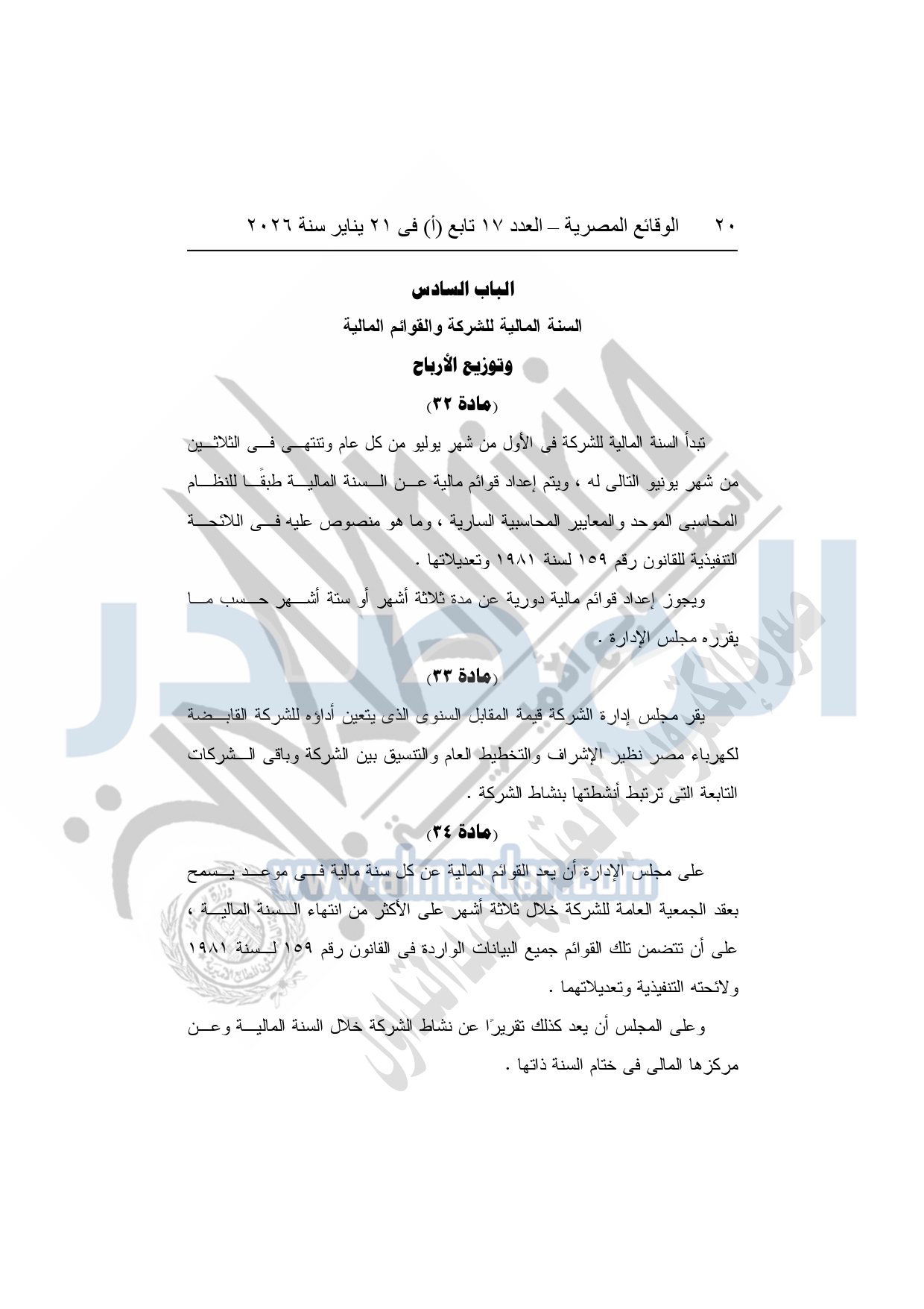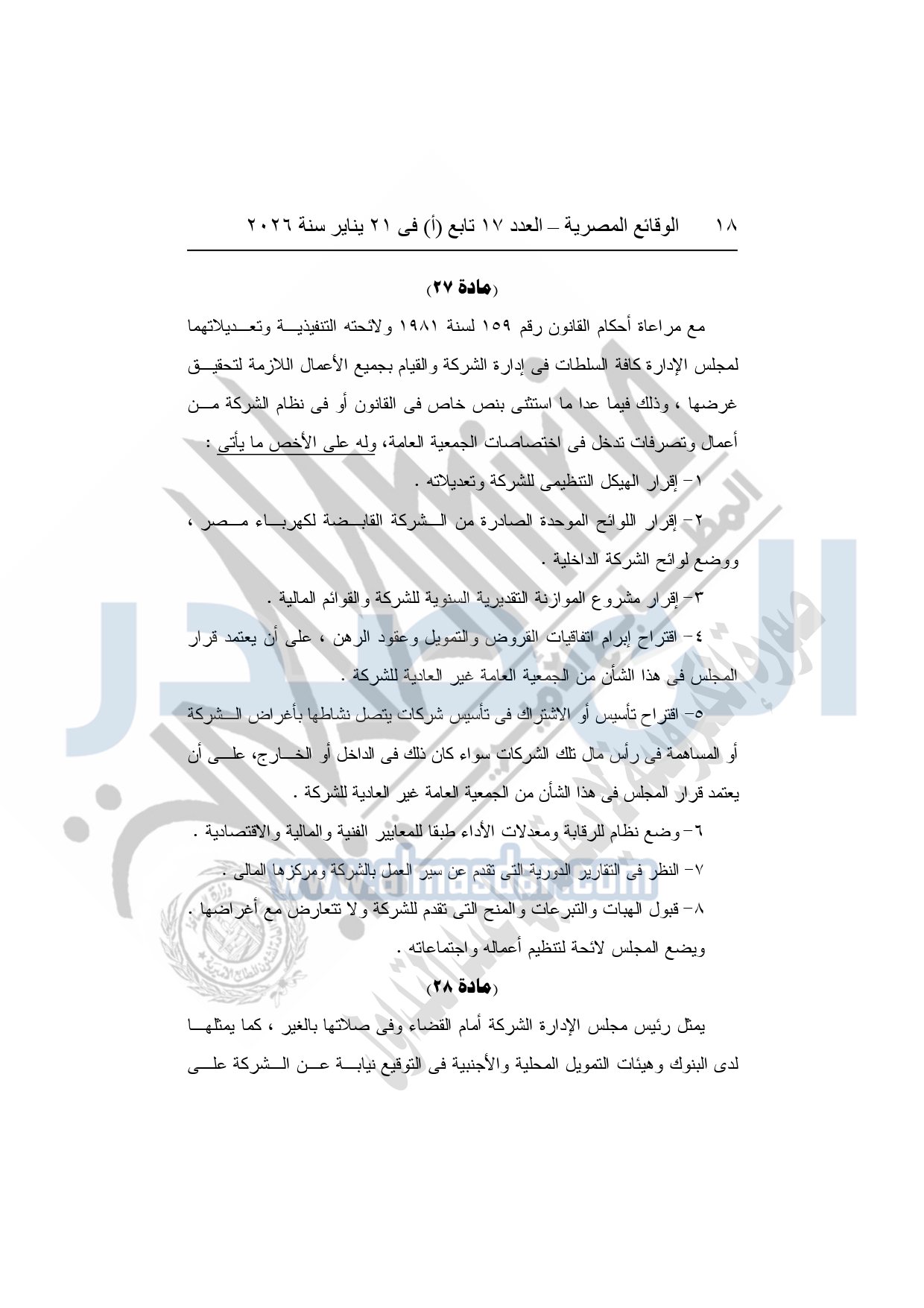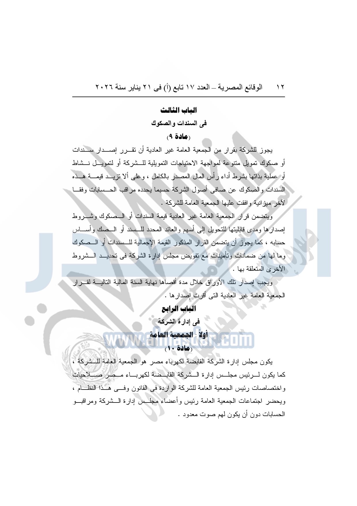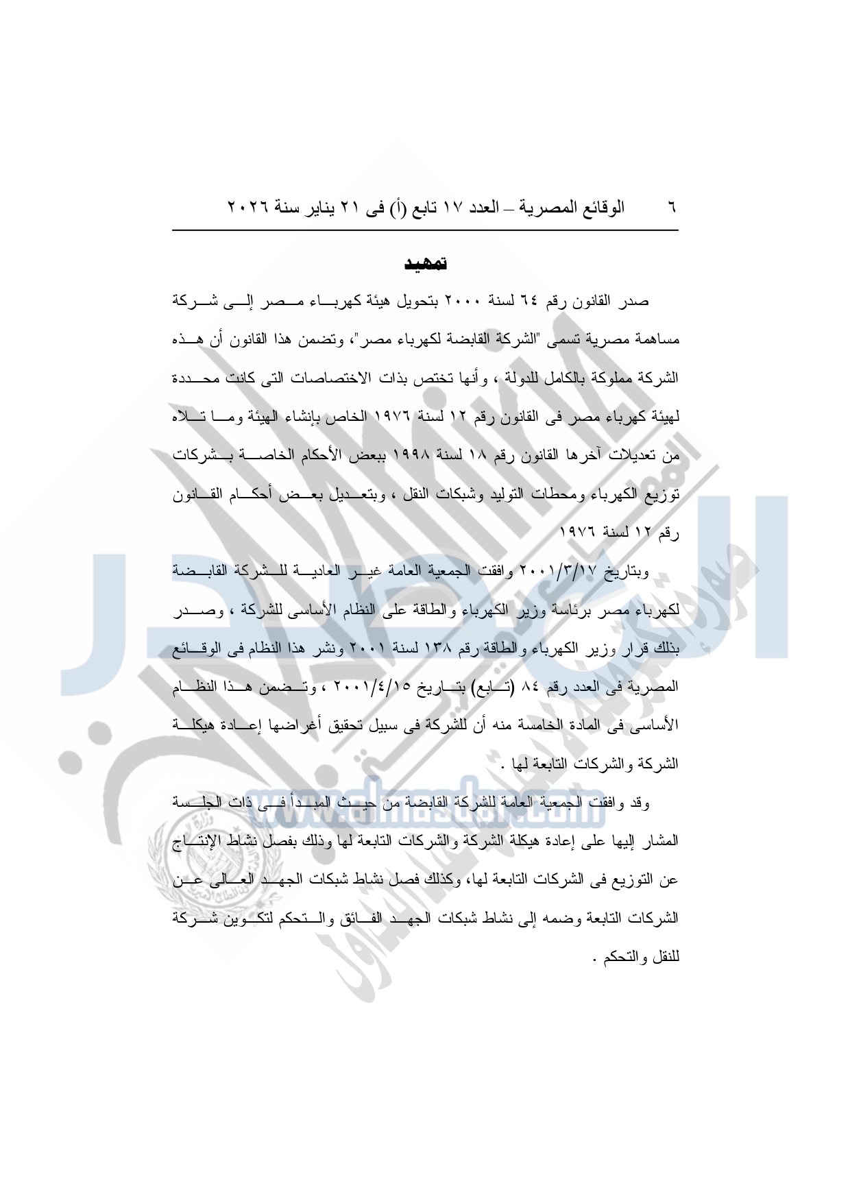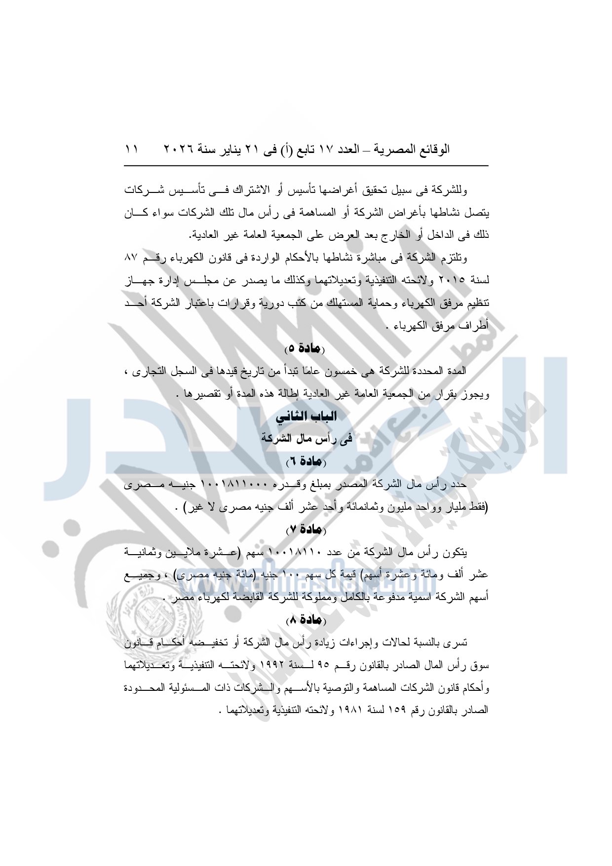 نشرت الوقائع المصرية، في العدد 17 تابع "أ"، الصادر فى 21 يناير سنة 2026، قرار الشركة القابضة لكهرباء مصر، قرار الجمعية العامة غير العادية، لشركة المحطات المائية لإنتاج الكهرباء، المنعقدة بتاريخ 17-11-2025، بشأن تعديل النظام الأساسي لشركة المحطات المائية لإنتاج الكهرباء.