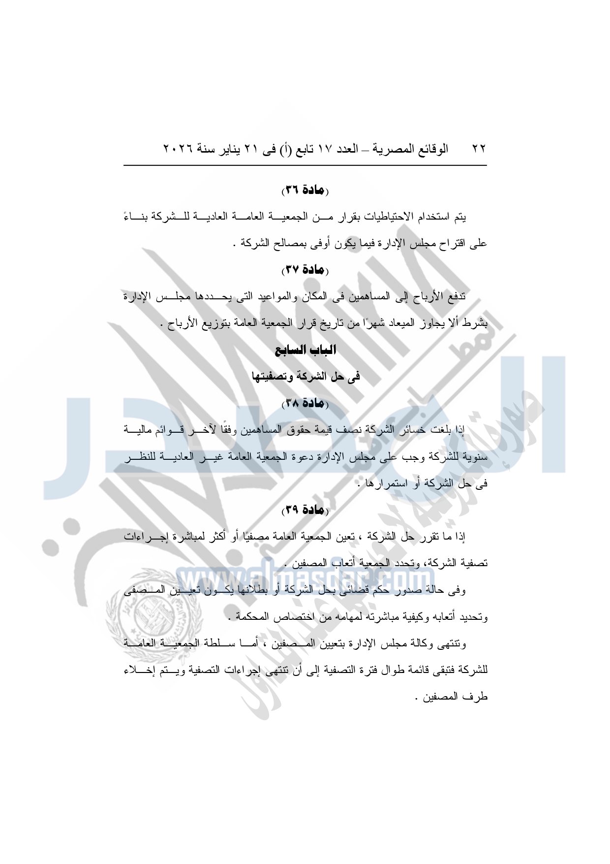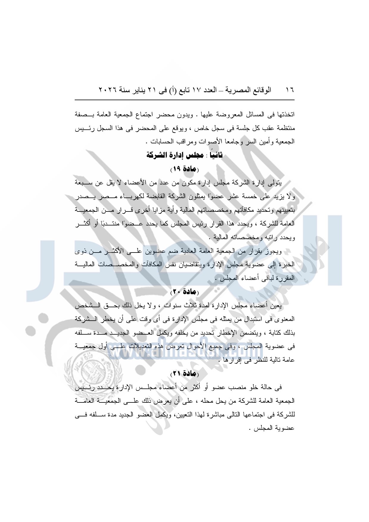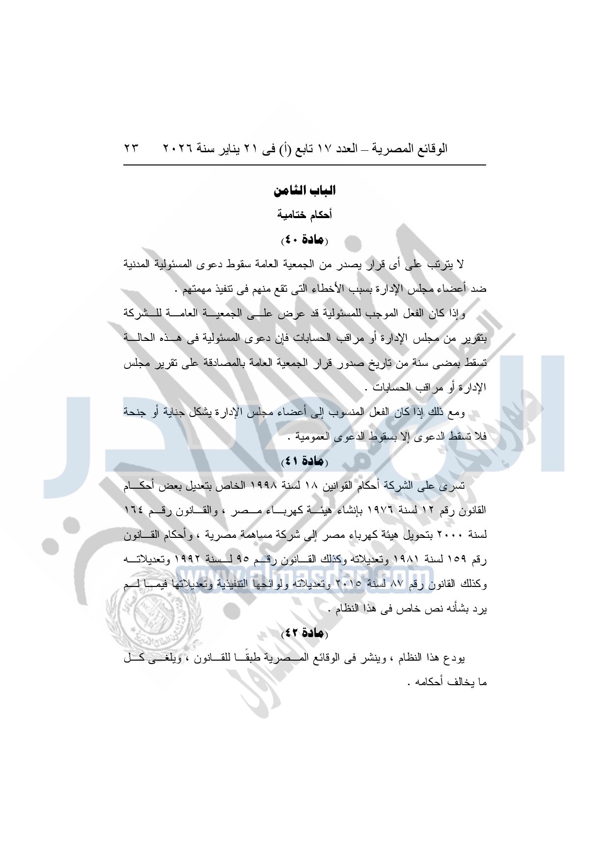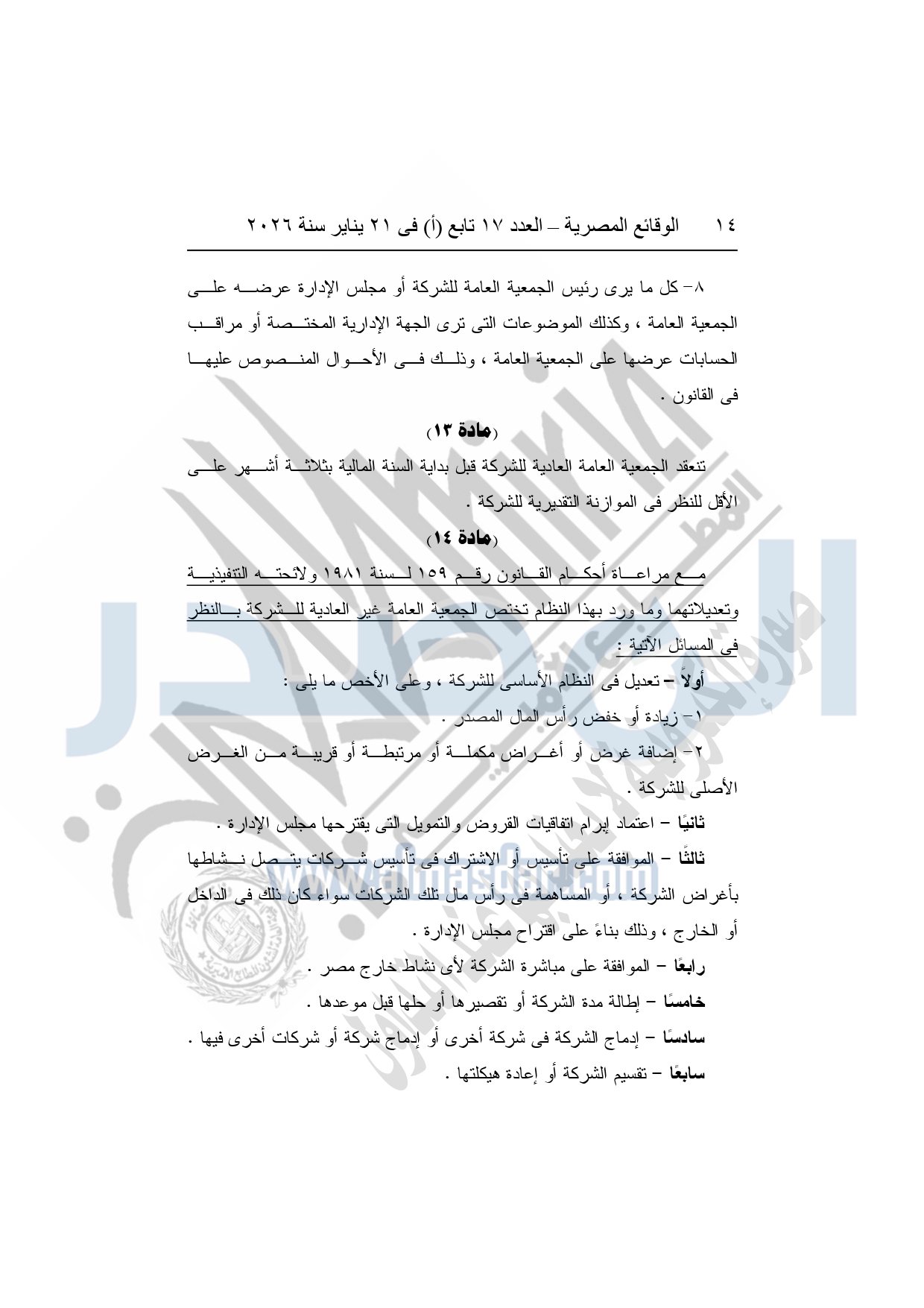 نشرت الوقائع المصرية، في العدد 17 تابع "أ"، الصادر فى 21 يناير سنة 2026، قرار الشركة القابضة لكهرباء مصر، قرار الجمعية العامة غير العادية، لشركة المحطات المائية لإنتاج الكهرباء، المنعقدة بتاريخ 17-11-2025، بشأن تعديل النظام الأساسي لشركة المحطات المائية لإنتاج الكهرباء.