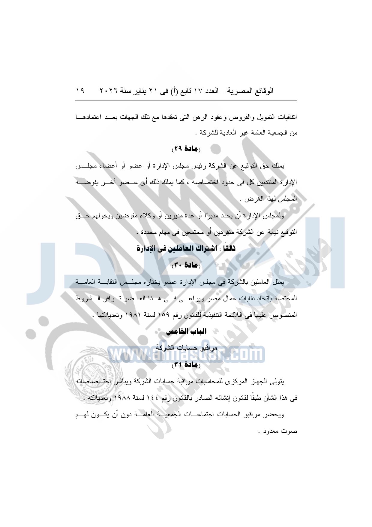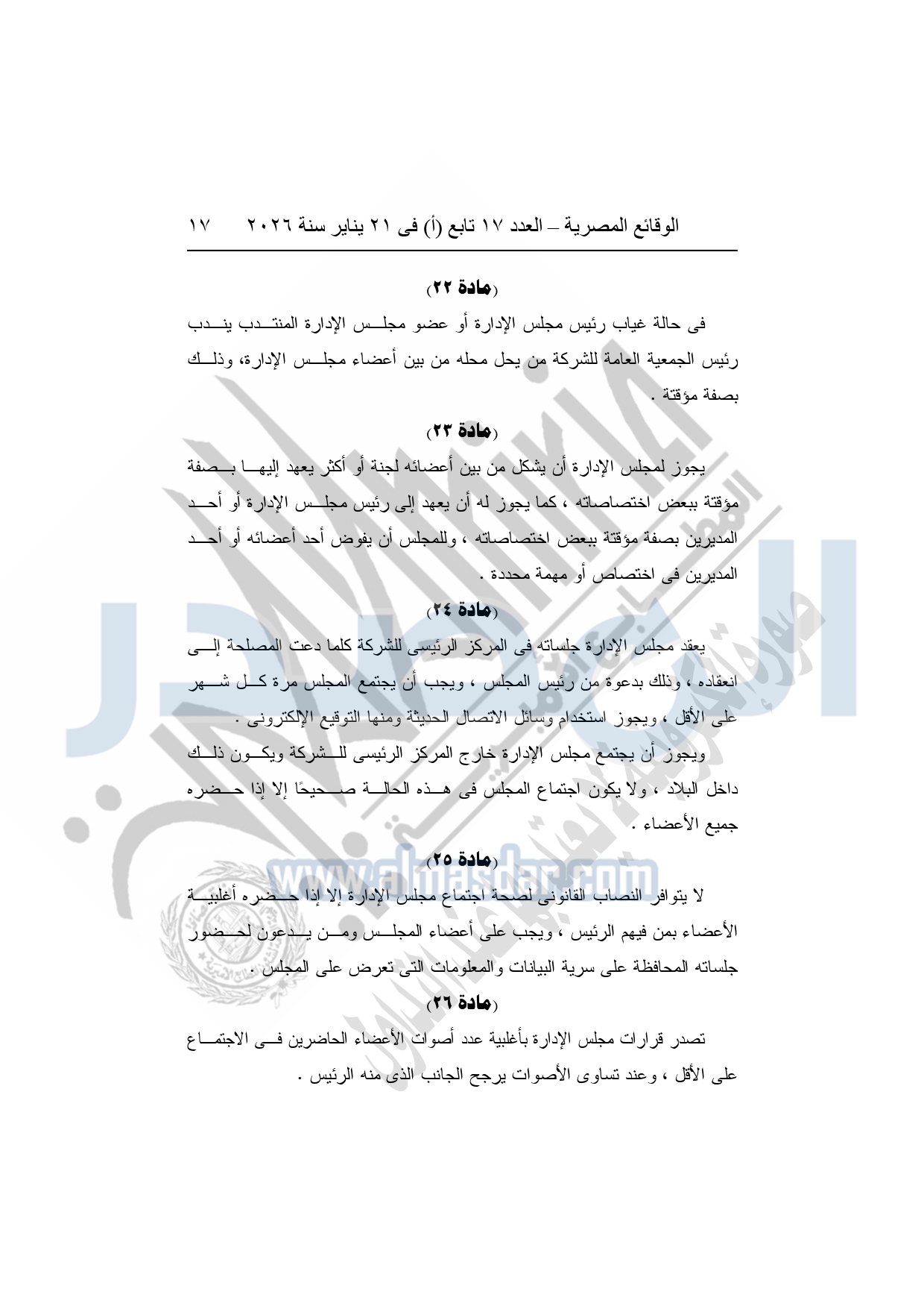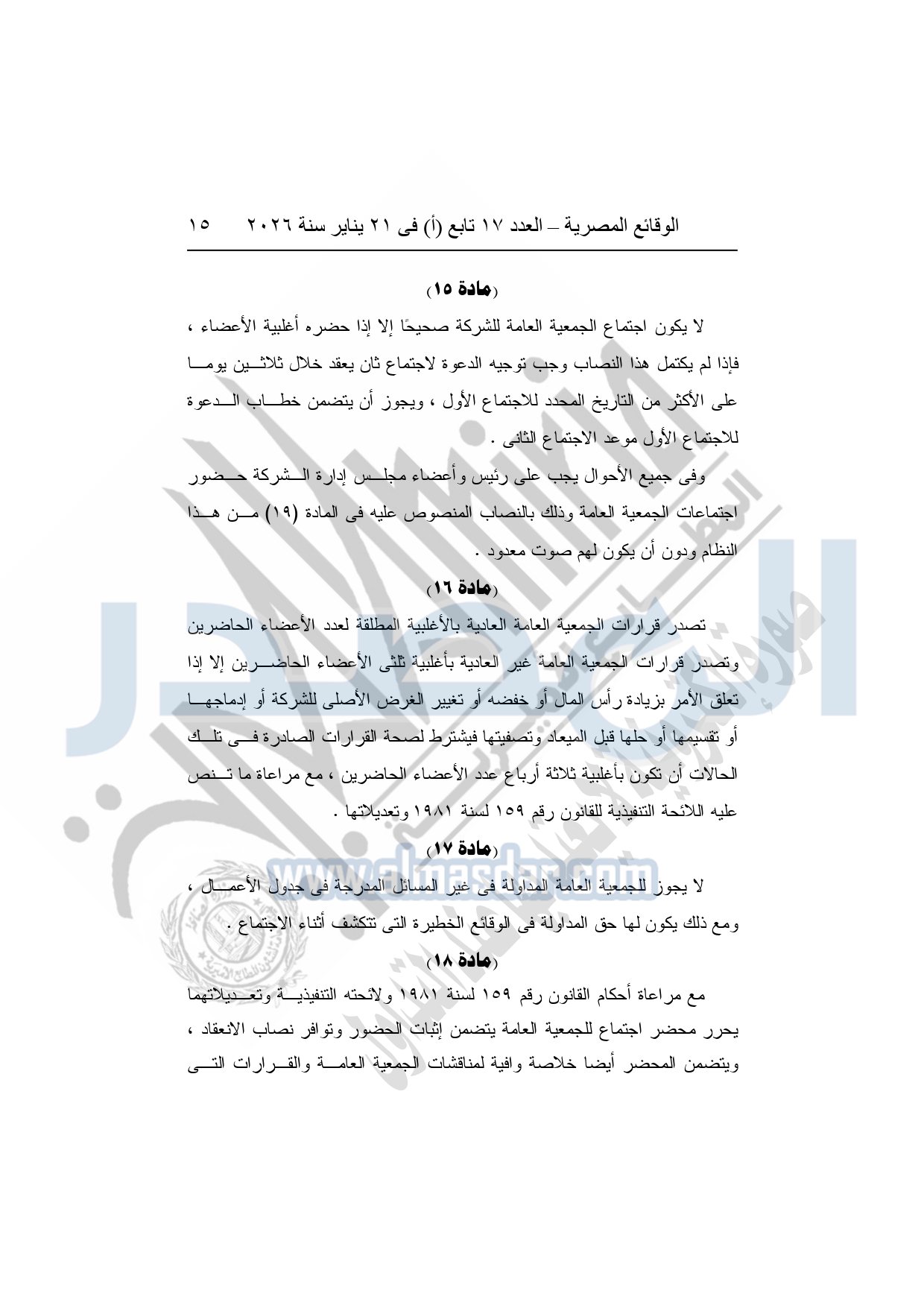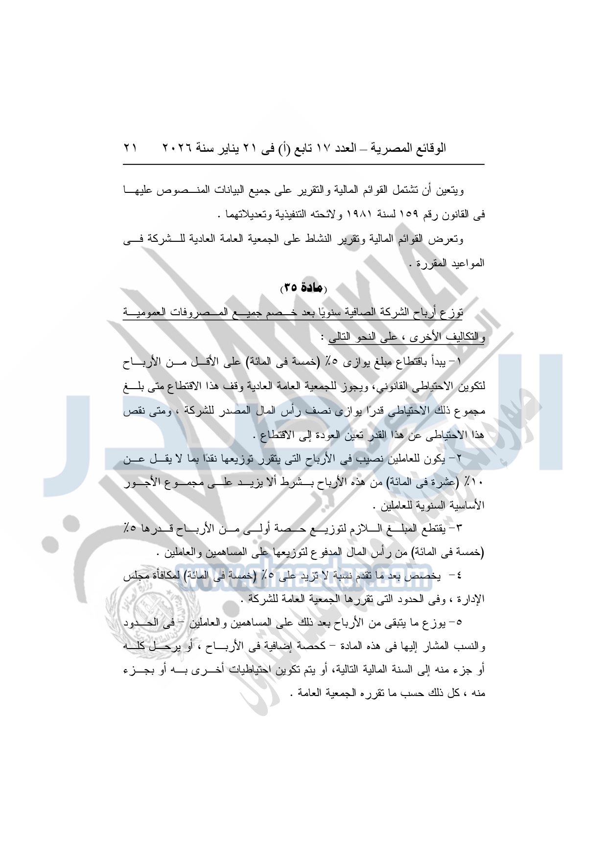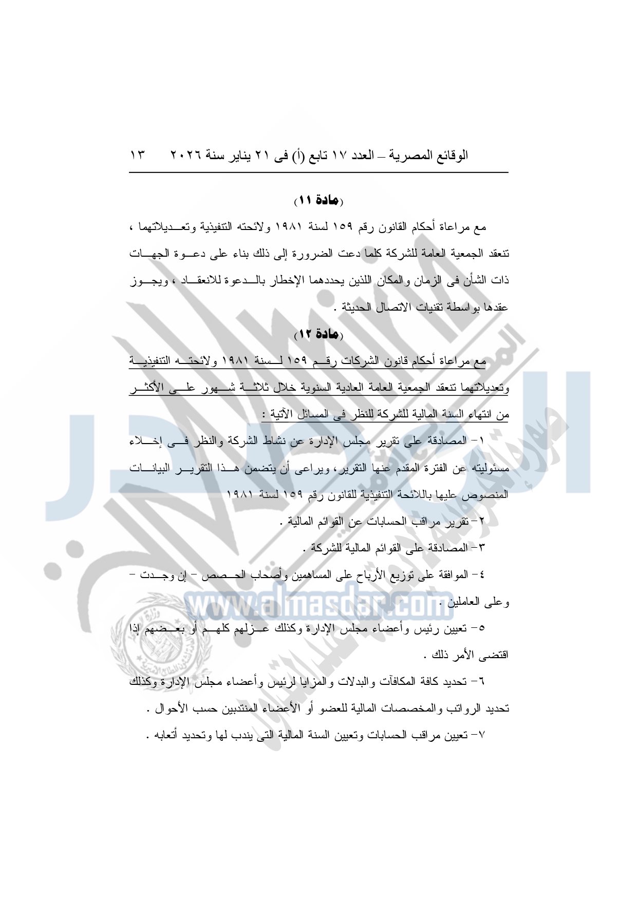 نشرت الوقائع المصرية، في العدد 17 تابع "أ"، الصادر فى 21 يناير سنة 2026، قرار الشركة القابضة لكهرباء مصر، قرار الجمعية العامة غير العادية، لشركة المحطات المائية لإنتاج الكهرباء، المنعقدة بتاريخ 17-11-2025، بشأن تعديل النظام الأساسي لشركة المحطات المائية لإنتاج الكهرباء.