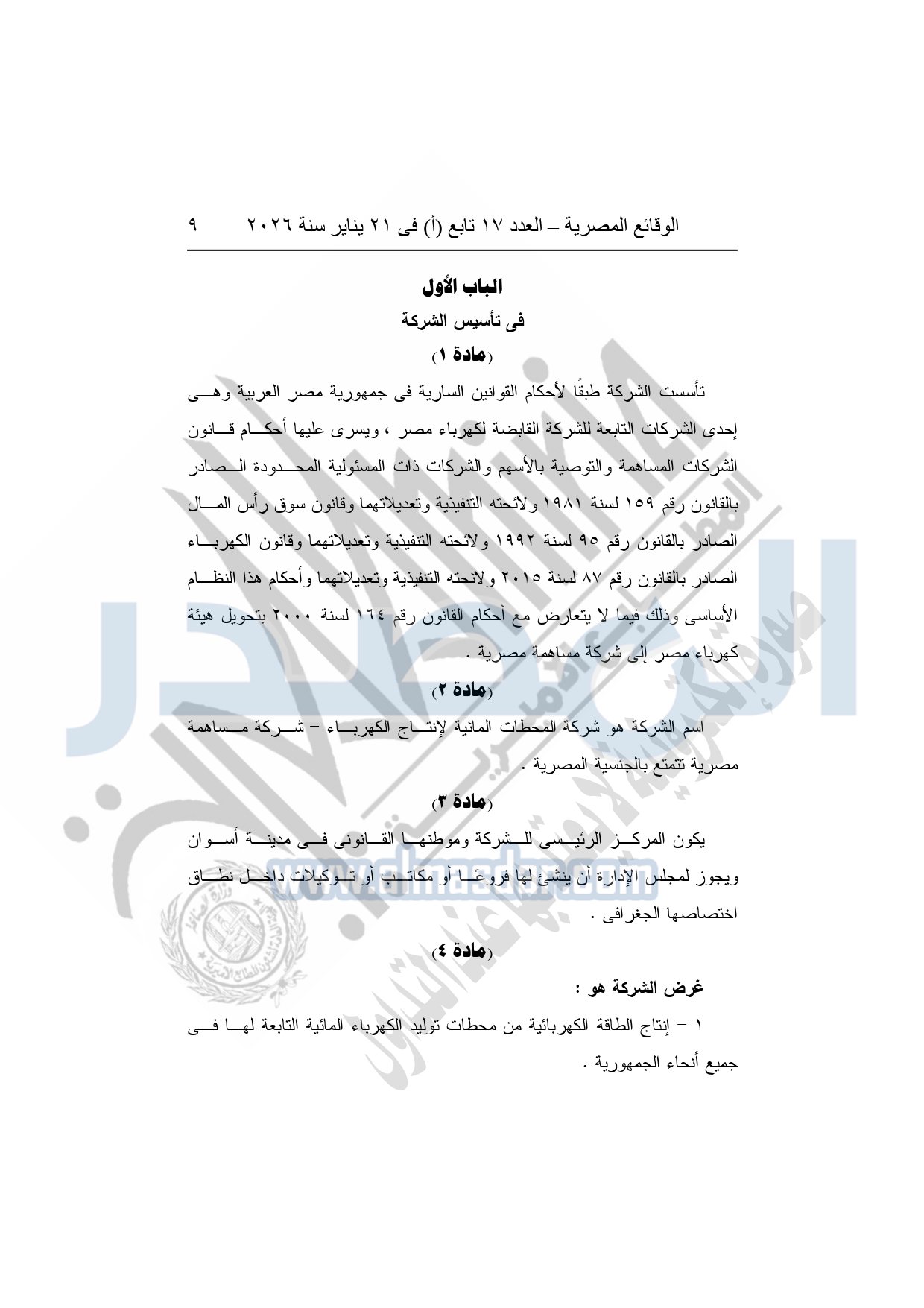 1- بشأن تعديل النظام الأساسي لشركة المحطات المائية لإنتاج الكهرباء.