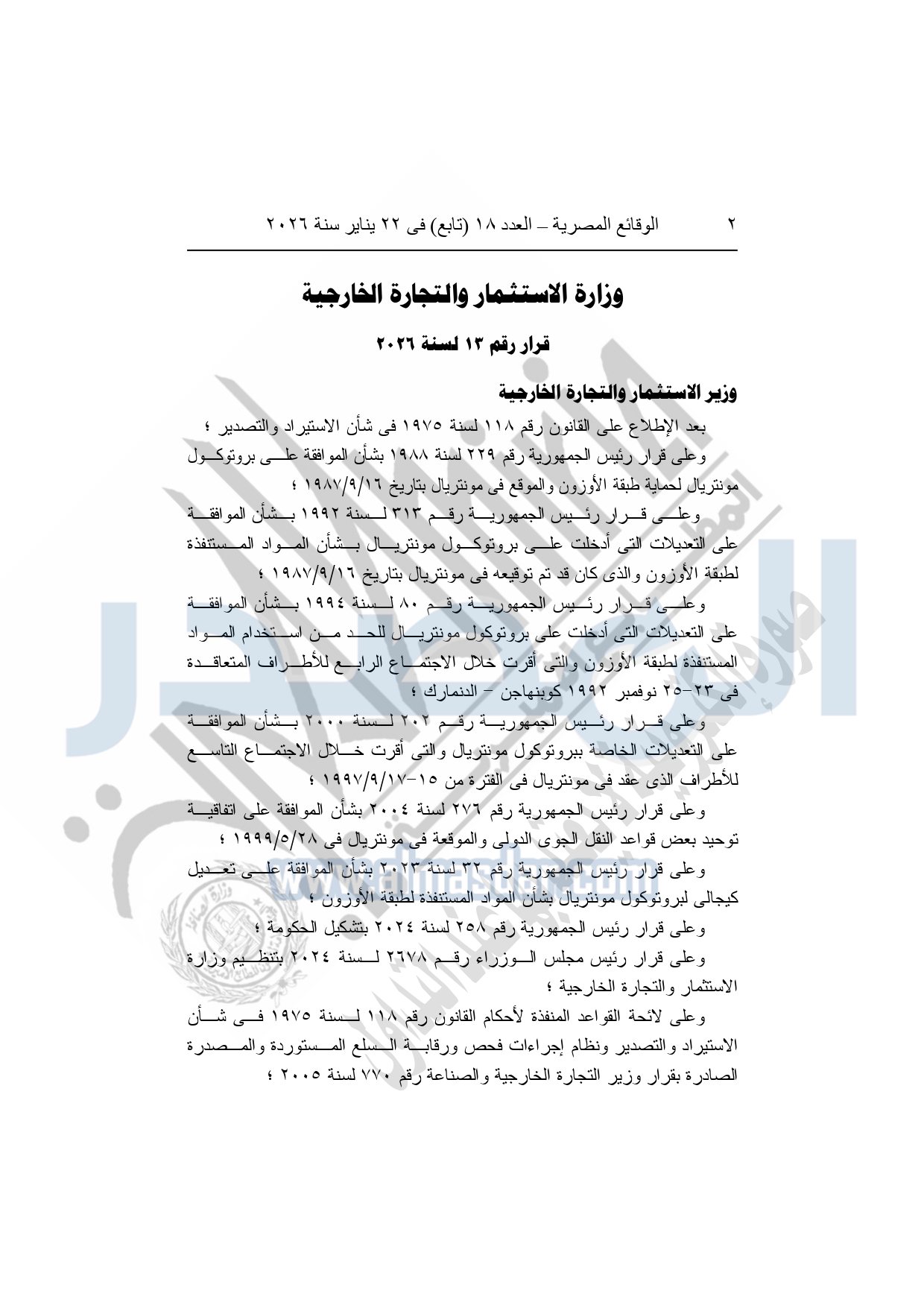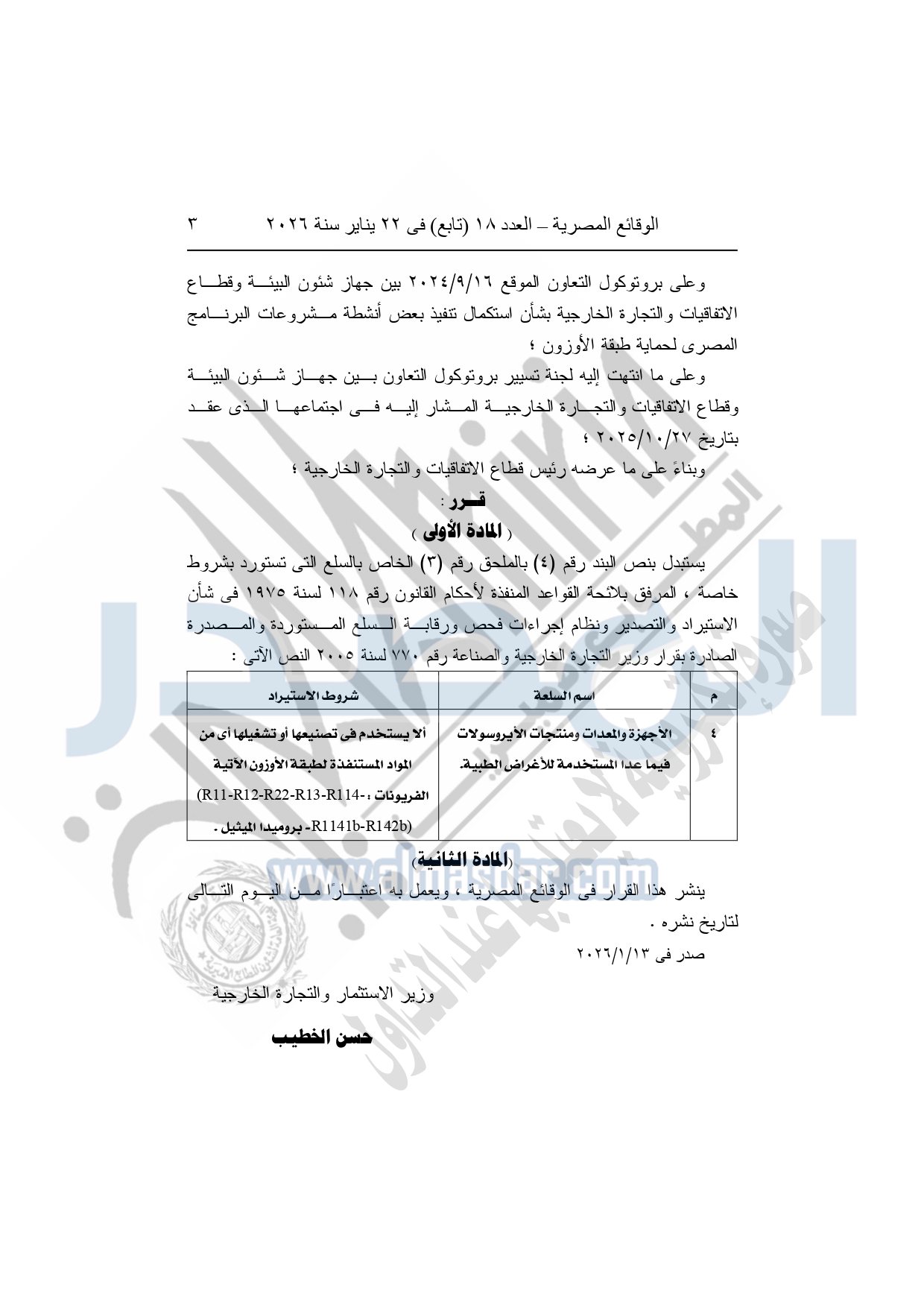 نشرت الوقائع المصرية، في العدد 18 "تابع"، الصادر في 22 يناير سنة 2026، قرار وزارة الاستثمار والتجارة الخارجية، رقم 13 لسنة 2026، بشأن تعديل شروط استيراد الأجهزة والمعدات ومنتجات الأيروسولات.