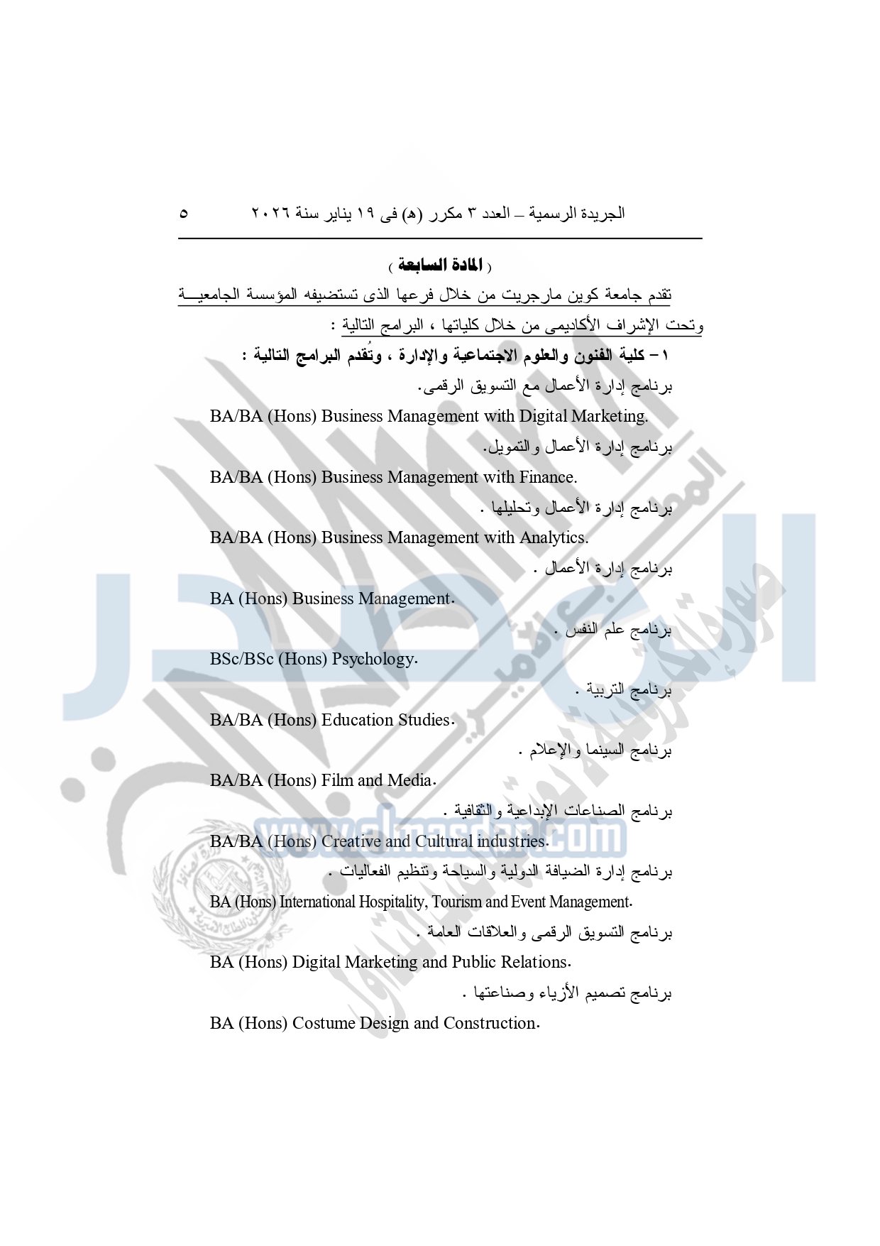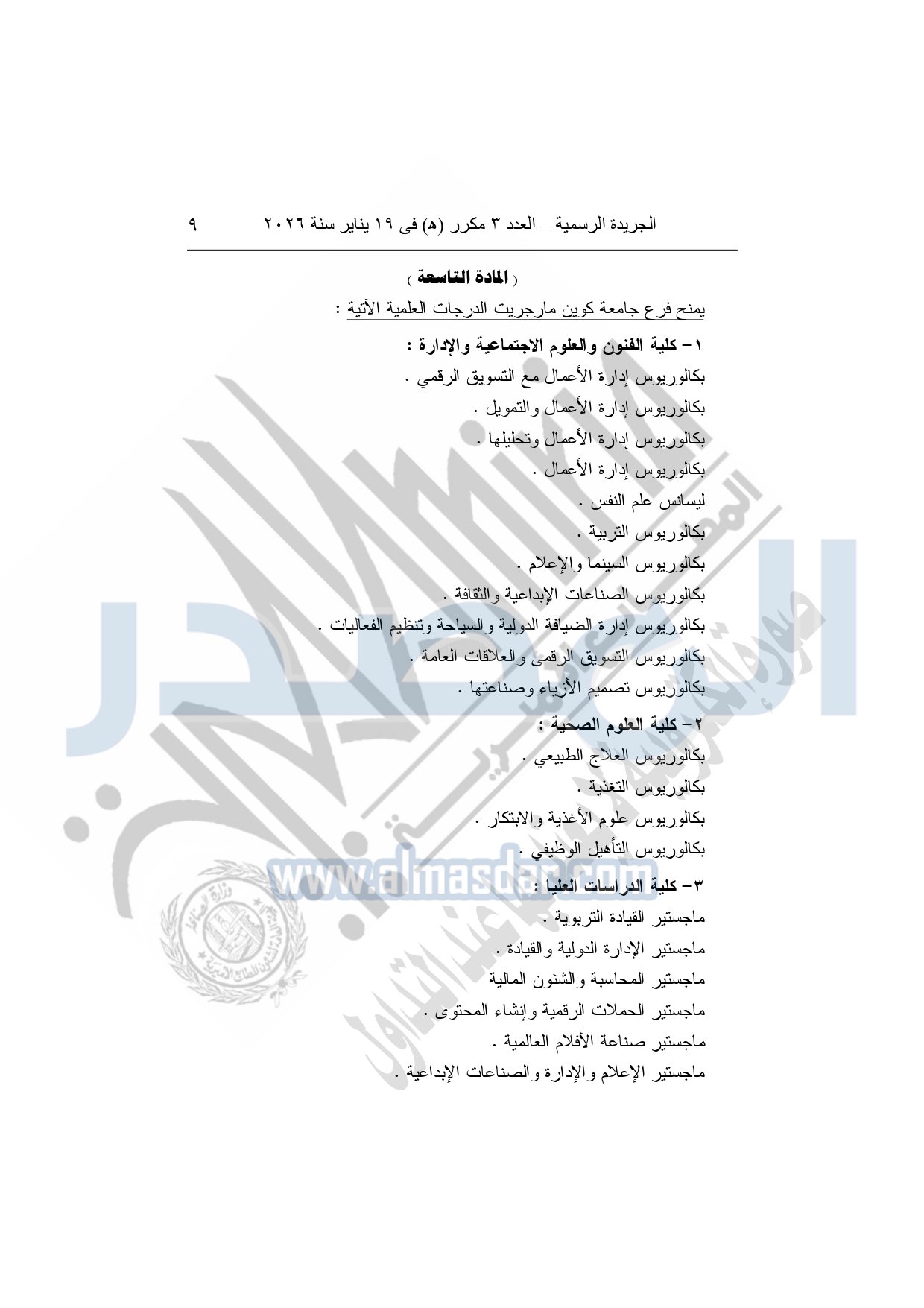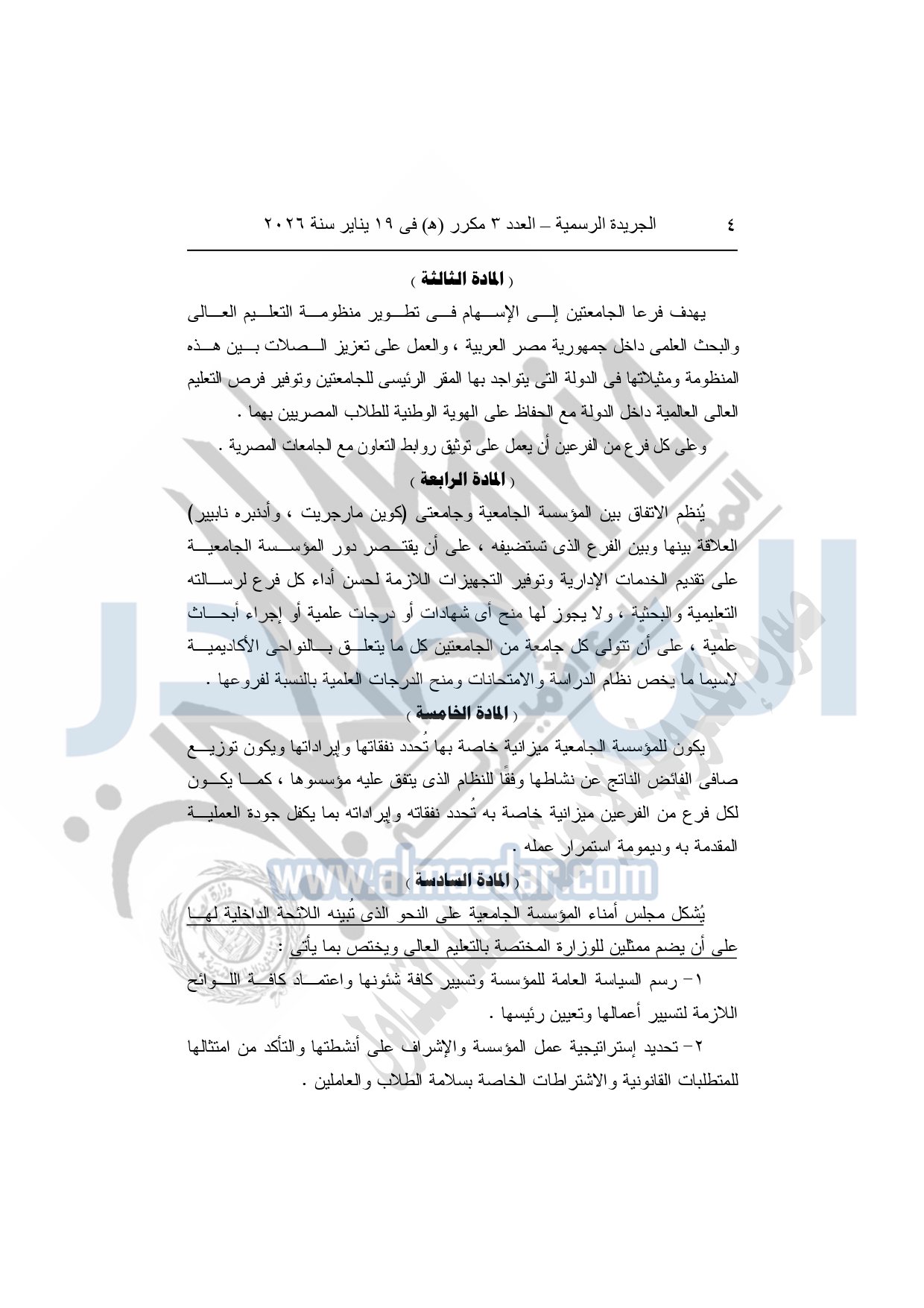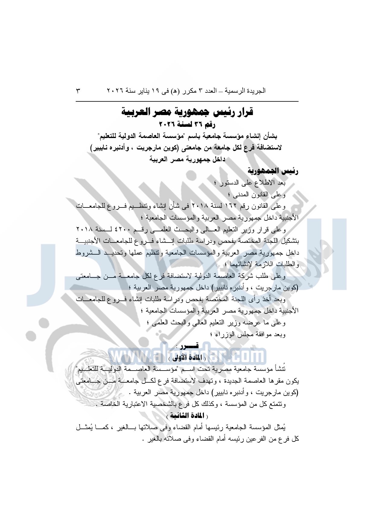 نشرت الجريدة الرسمية، في العدد 3 مكرر "هـ"، الصادر في 19 يناير سنة 2026، قرار رئيس جمهورية مصر العربية، رقم 36 لسنة 2026، بشأن إنشاء مؤسسة جامعية باسم "مؤسسة العاصمة الدولية للتعليم" لاستضافة فرع لكل جامعة من جامعتي "كوين مارجريت، وأدنبره نابيير" داخل جمهورية مصر العربية.