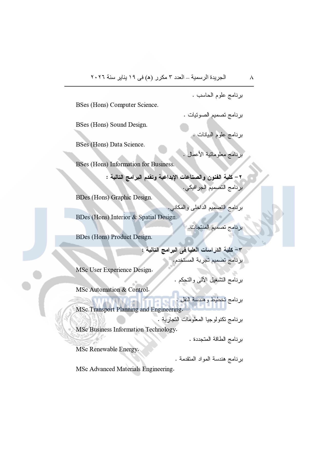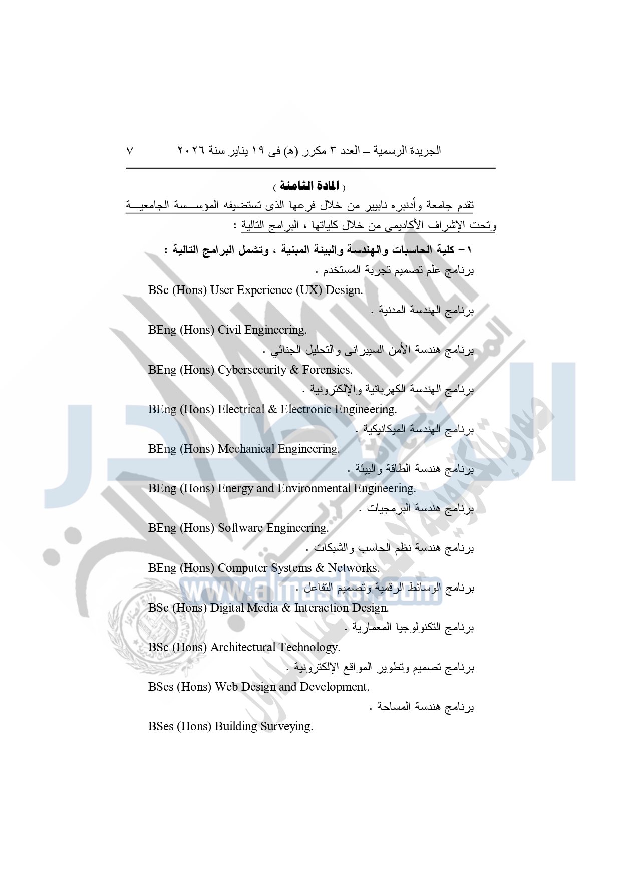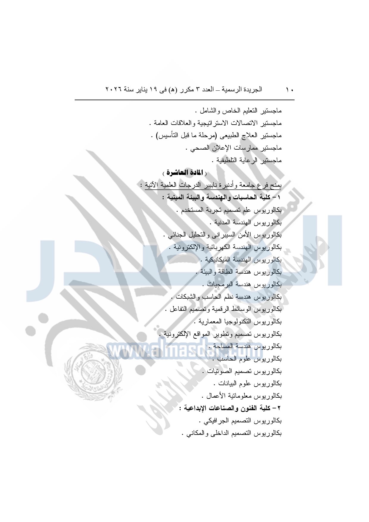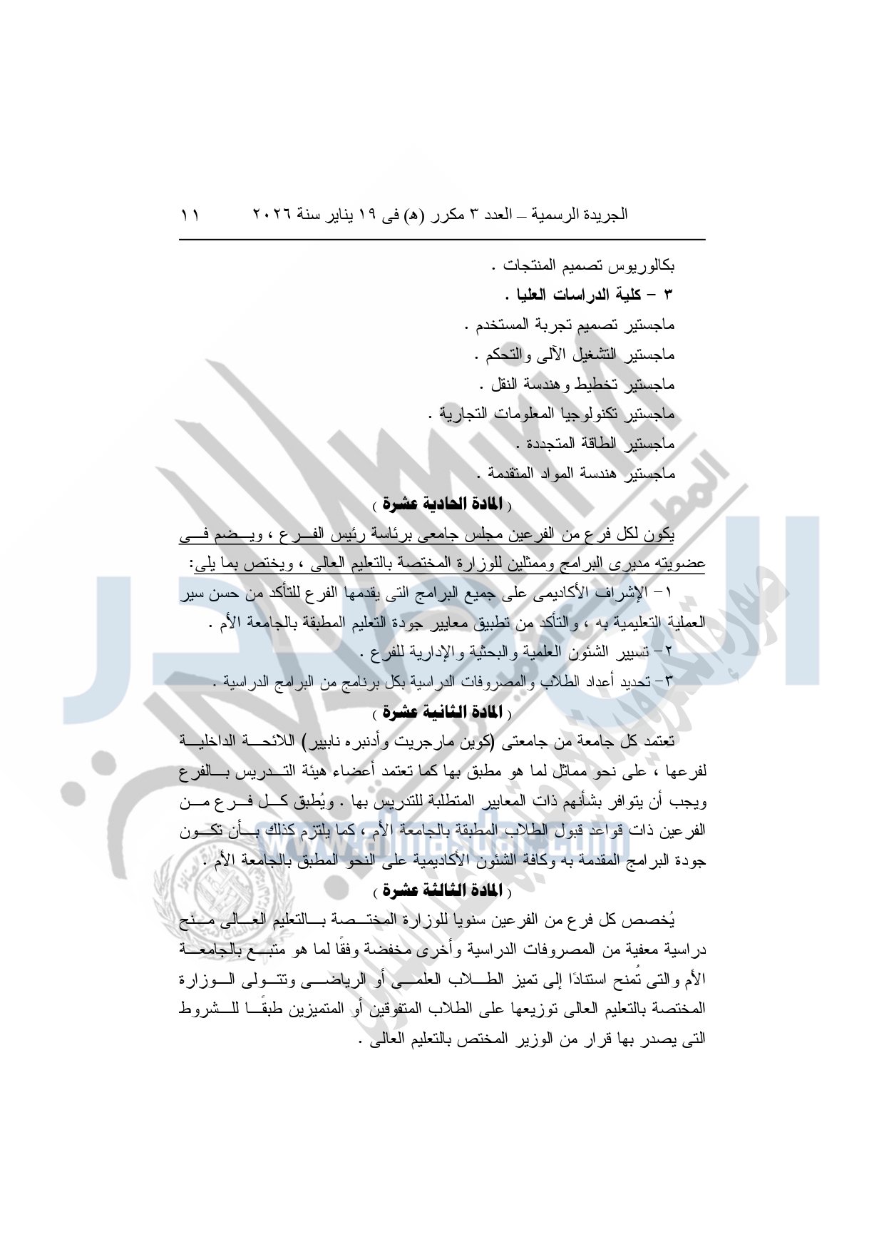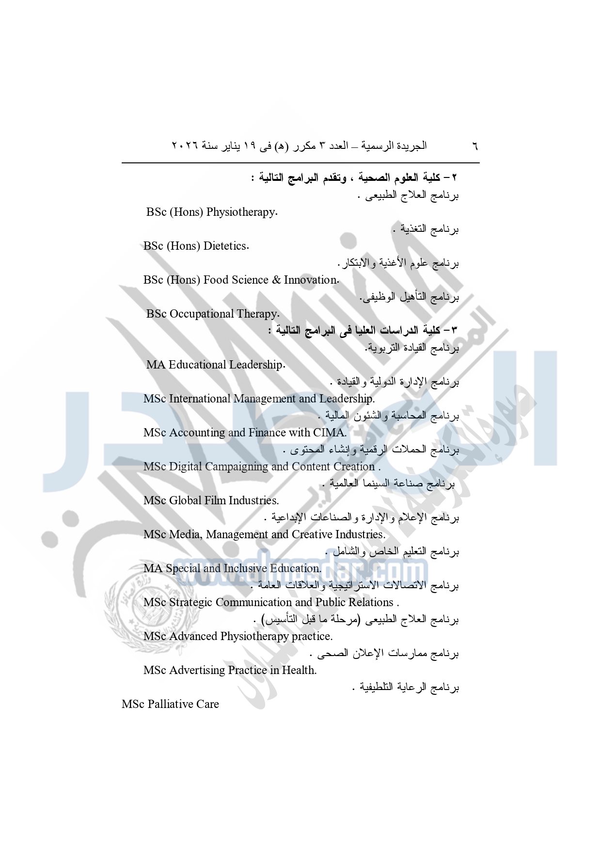 نشرت الجريدة الرسمية، في العدد 3 مكرر "هـ"، الصادر في 19 يناير سنة 2026، قرار رئيس جمهورية مصر العربية، رقم 36 لسنة 2026، بشأن إنشاء مؤسسة جامعية باسم "مؤسسة العاصمة الدولية للتعليم" لاستضافة فرع لكل جامعة من جامعتي "كوين مارجريت، وأدنبره نابيير" داخل جمهورية مصر العربية.