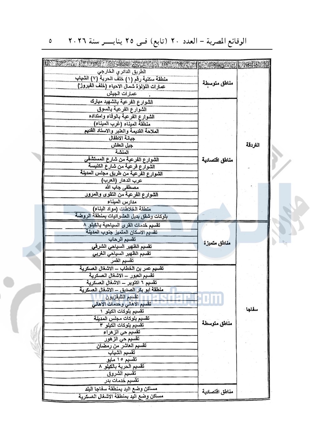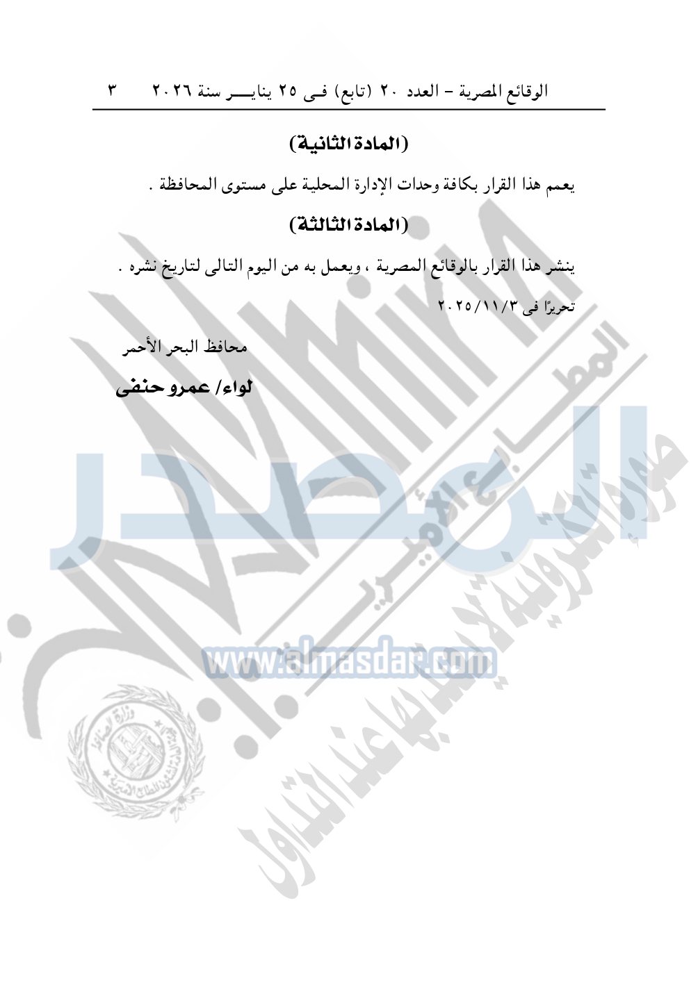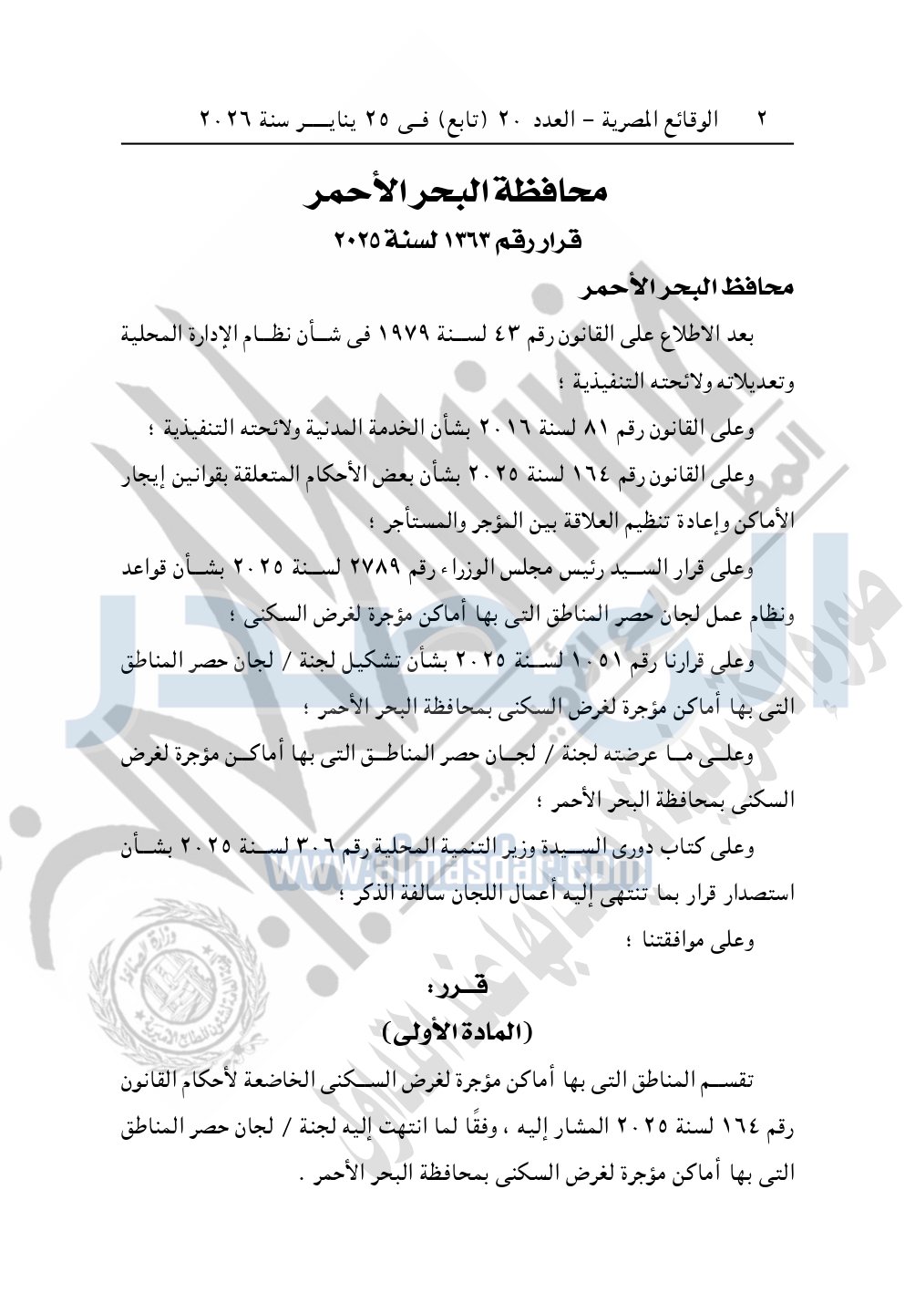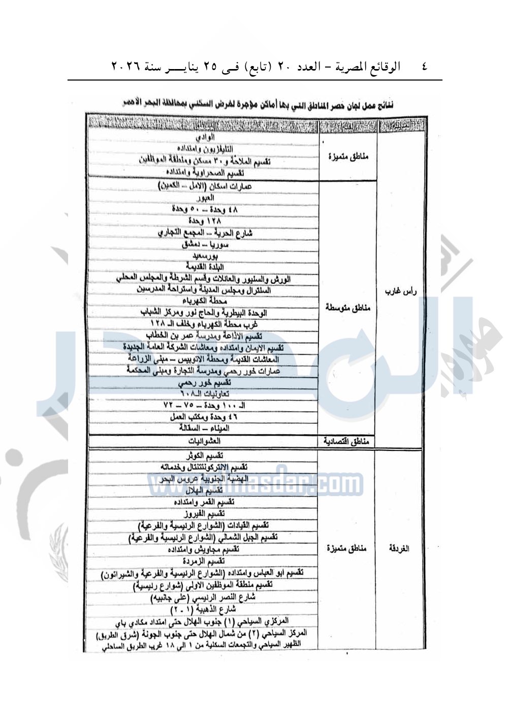 نشرت الوقائع المصرية، في العدد 20 "تابع"، الصادر في 25 يناير سنة 2026، قرار محافظة البحر الأحمر، رقم 1363 لسنة 2025، بشأن تقسيم المناطق التي بها أماكن مؤجرة لغرض السكني بمحافظة البحر الأحمر.