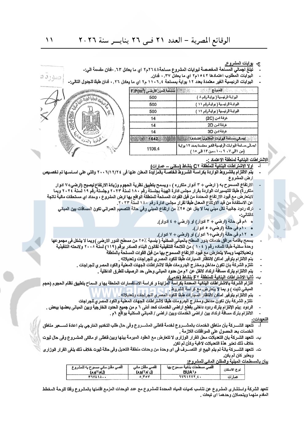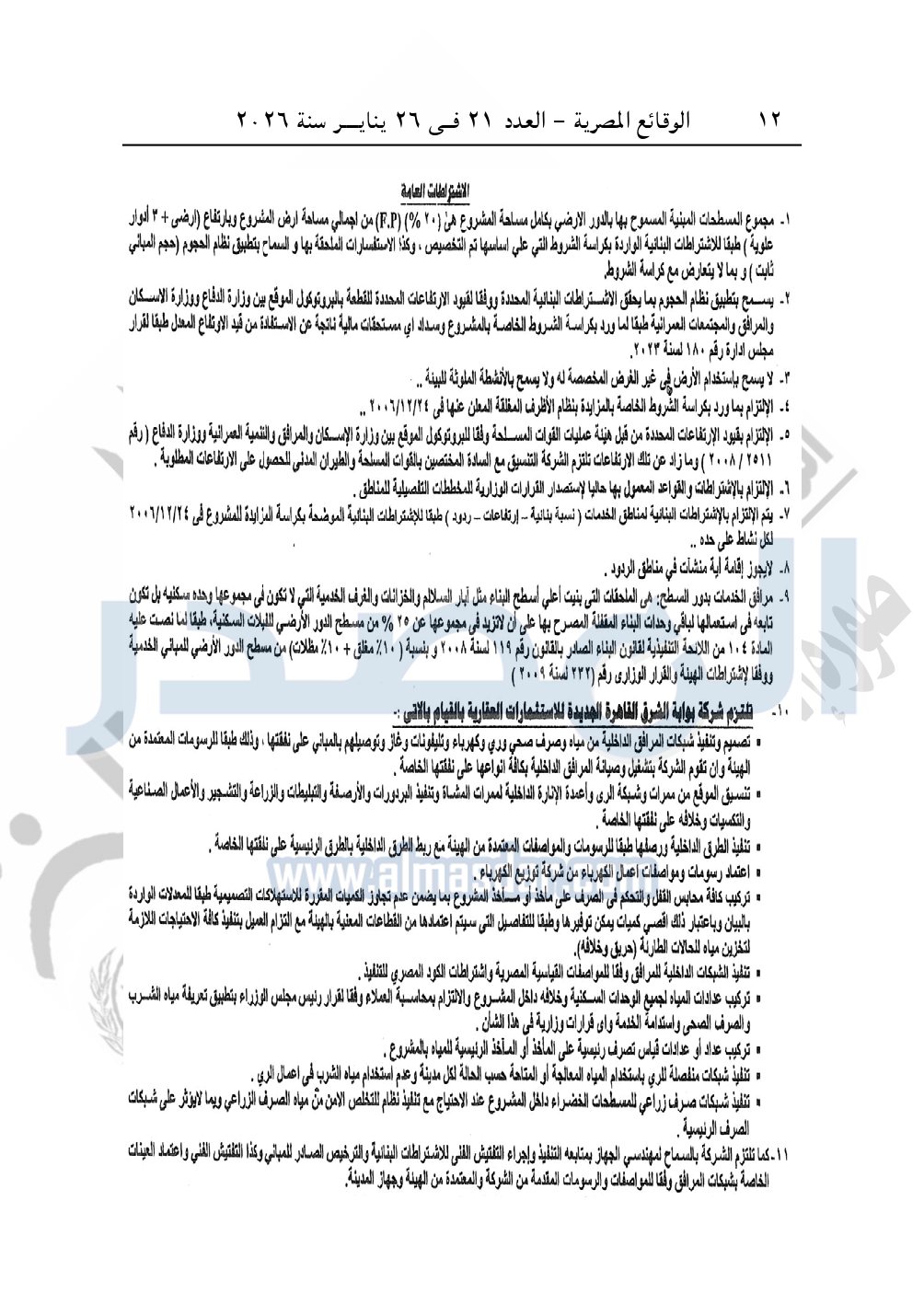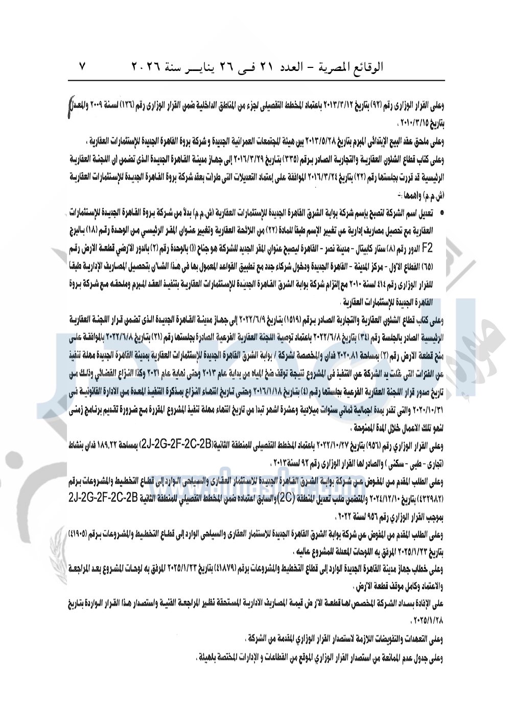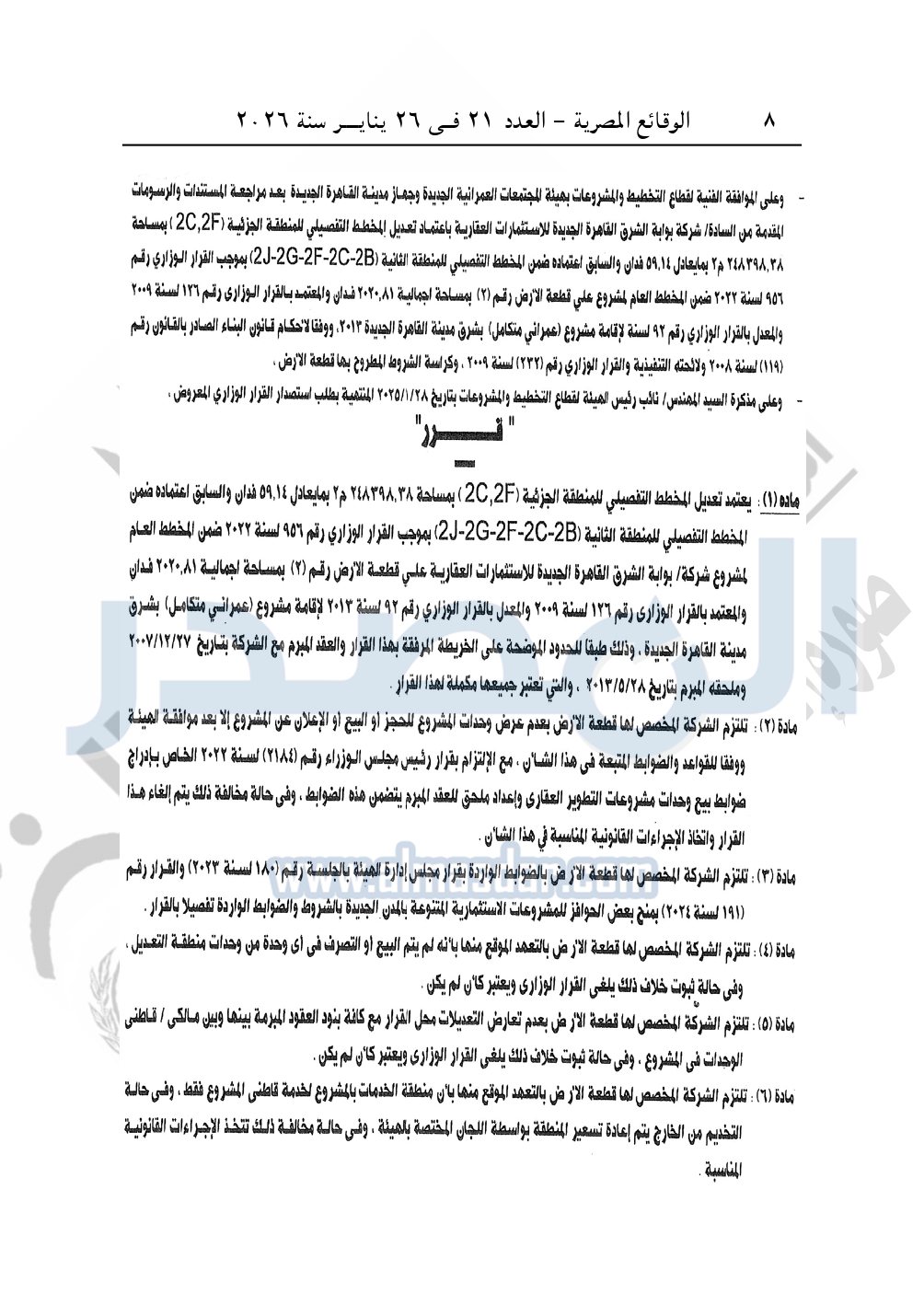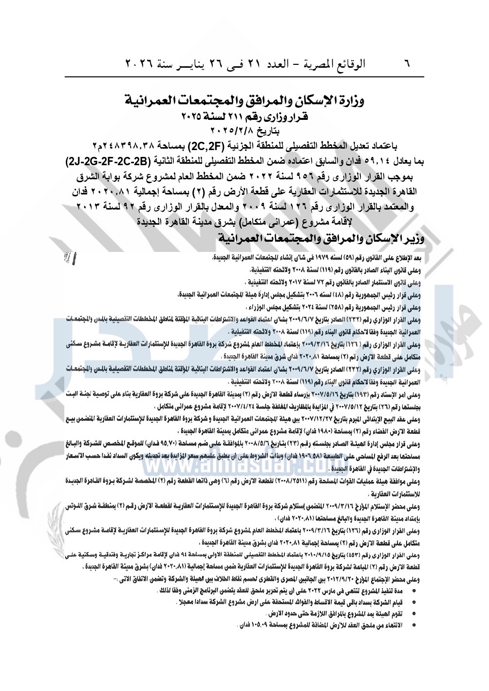 نشرت الوقائع المصرية، في العدد 21، الصادر في 26 يناير سنة 2026، قرار وزارة الإسكان والمرافق والمجتمعات العمرانية، قرار وزاري رقم 211 لسنة 2025، بتاريخ 8-2-2025، بشأن اعتماد تعديل المخطط التفصيلي للمنطقة الجزئية "2C, 2F" بمساحة 248398.38م2 بما يعادل 59.14 فدان والسابق اعتماده ضمن المخطط التفصيلي للمنطقة الثانية "2J-2G-2F-2C-2B" بموجب القرار الوزارى رقم 956 لسنة 2022 ضمن المخطط العام لمشروع شركة بوابة الشرق القاهرة الجديدة للاستثمارات العقارية على قطعة الأرض رقم "2" بمساحة إجمالية 2020.81 فدان والمعتمد بالقرار الوزارى رقم 126 لسنة 2009 والمعدل بالقرار الوزارى رقم 92 لسنة 2013 لإقامة مشروع "عمرانى متكامل" بشرق مدينة القاهرة الجديدة.
