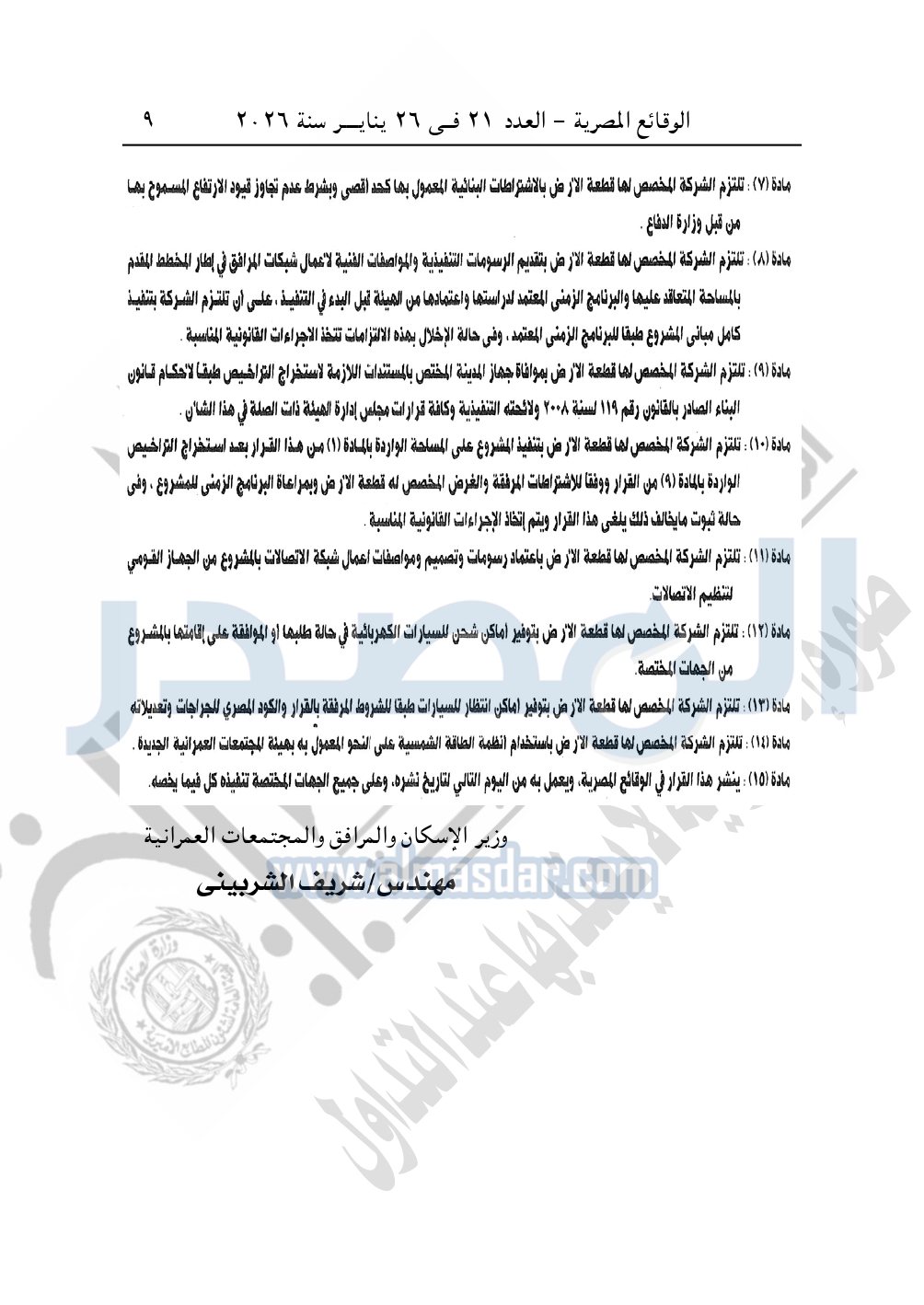 تلتزم الشركة المخصص لها قطعة الأرض بعدم عرض وحدات المشروع للحجز أو البيع أو الإعلان عن المشروع إلا بعد موافقة الهيئة ووفقا للقواعد والضوابط المتبعة فى هذا الشأن، مع الإلتزام بقرار رئيس مجلس الوزراء رقم "2184" لسنة 2022 الخاص بإدراج ضوابط بيع وحدات مشروعات التطوير العقارى وإعداد ملحق للعقد المبرم يتضمن هذه الضوابط، وفى حالة مخالفة ذلك يتم إلغاء هذا القرار واتخاذ الإجراءات القانونية المناسبة في هذا الشأن.