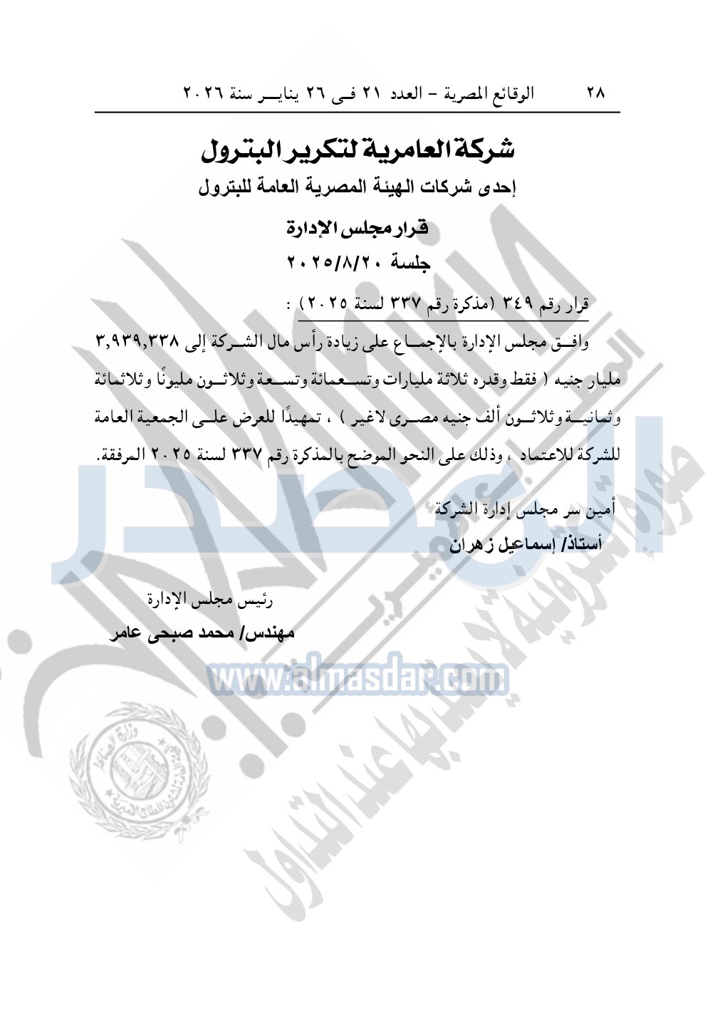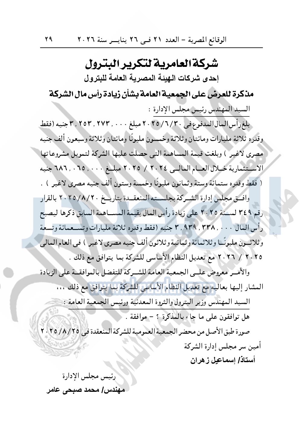 كما نشرت الوقائع المصرية، في العدد 21، الصادر في 26 يناير سنة 2026، قرار شركة العامرية لتكرير البترول، إحدى شركات الهيئة المصرية العامة للبترول، مذكرة للعرض على الجمعية العامة بشأن زيادة رأس مال الشركة.