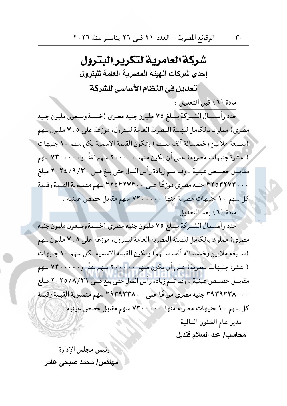 ونشرت الوقائع المصرية، في العدد 21، الصادر في 26 يناير سنة 2026، قرار شركة العامرية لتكرير البترول، إحدى شركات الهيئة المصرية العامة للبترول، تعديل في النظام الأساسي للشركة.