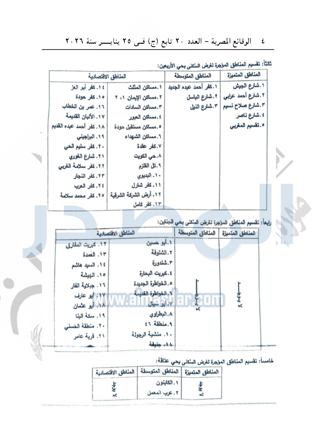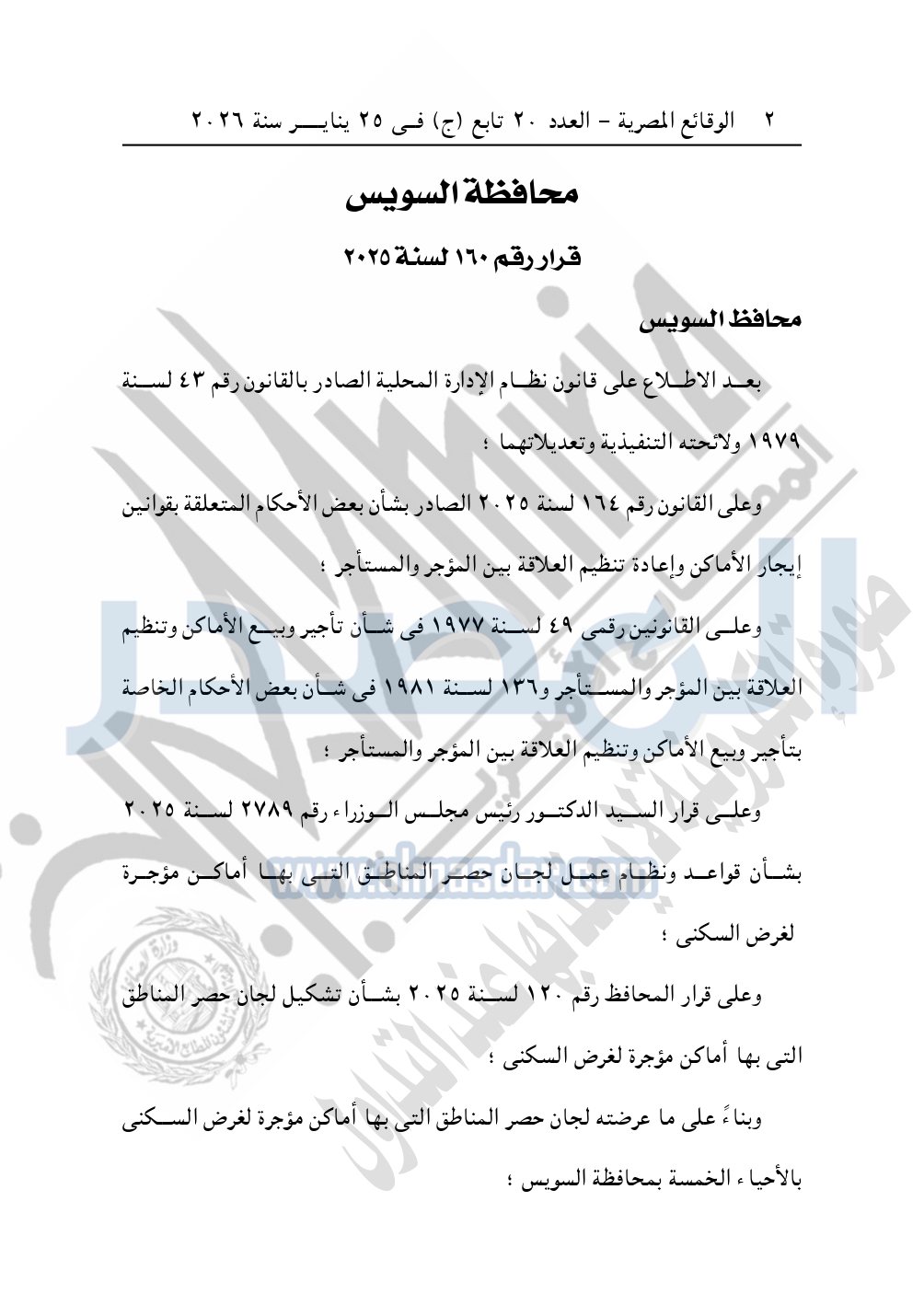 نشرت الوقائع المصرية، في العدد 20 تابع "ج"، الصادر في 25 يناير سنة 2026، قرار محافظة السويس، رقم 160 لسنة 2025، بشأن تقسيم المناطق التي بها أماكن مؤجرة لغرض السكني بمحافظة السويس.