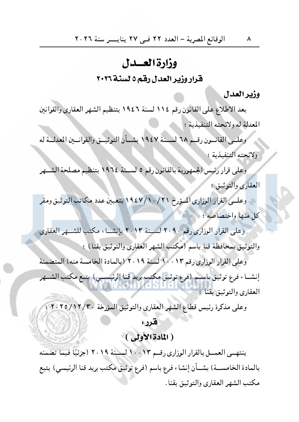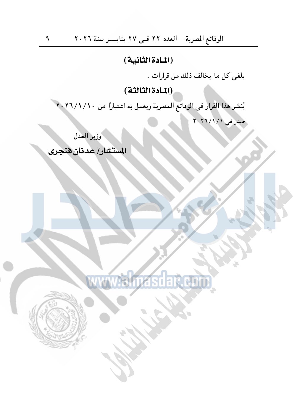 كما نشرت الوقائع المصرية، في العدد 22، الصادر في 27 يناير سنة 2026، قرار وزارة العدل، رقم 6 لسنة 2026، بشأن إنهاء العمل بالقرار الوزارى رقم 1178 لسنة 2014.