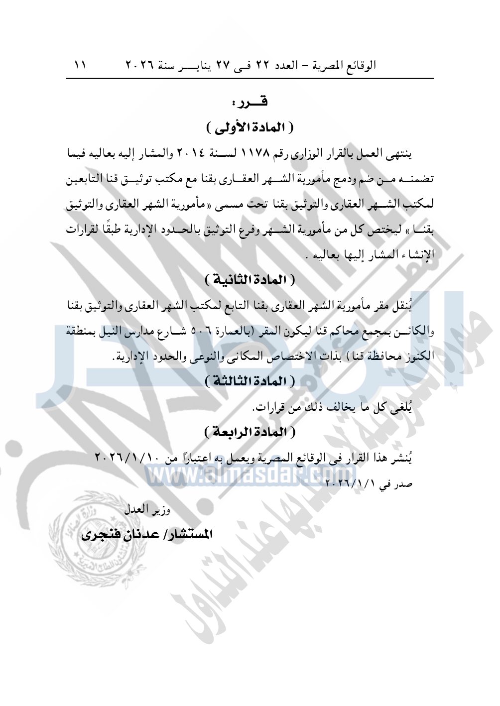 ينتهى العمل بالقرار الوزارى رقم 1178 لسنة 2014 والمشار إليه بعاليه فيما تضمنه من ضم ودمج مأمورية الشهر العقارى بقنا مع مكتب توثيق قنا التابعين لمكتب الشهر العقارى والتوثيق بقنا تحت مسمى «مأمورية الشهر العقارى والتوثيق بقنا» ليختص كل من مأمورية الشهر وفرع التوثيق بالحدود الإدارية طبقا لقرارات الإنشاء المشار إليها بعاليه.