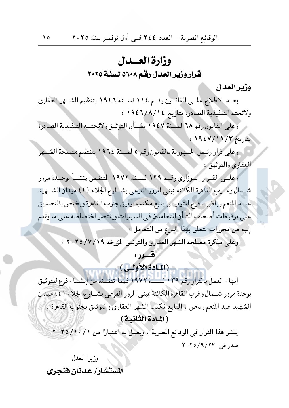 وأيضا نشرت الوقائع المصرية، في العدد 244، الصادر في أول نوفمبر 2025، قرار وزارة العدل، رقم 5608 لسنة 2025، بشأن إنهاء العمل بالقرار الوزارى رقم 139 لسنة 1972.