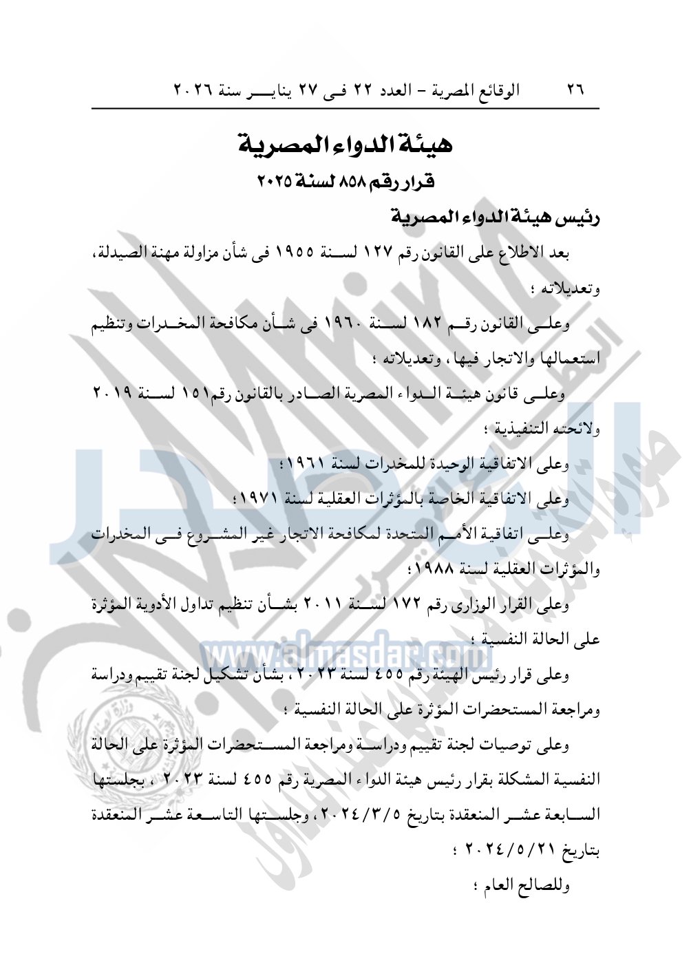 نشرت الوقائع المصرية، في العدد 22، الصادر في 27 يناير سنة 2026، قرار هيئة الدواء المصرية، رقم 858 لسنة 2025، بشأن تعديل وضع المستحضرات المحتوية على المادتين Phenobarbitone & Phenobarbitone Sodium وادراجها بدون تركيز.