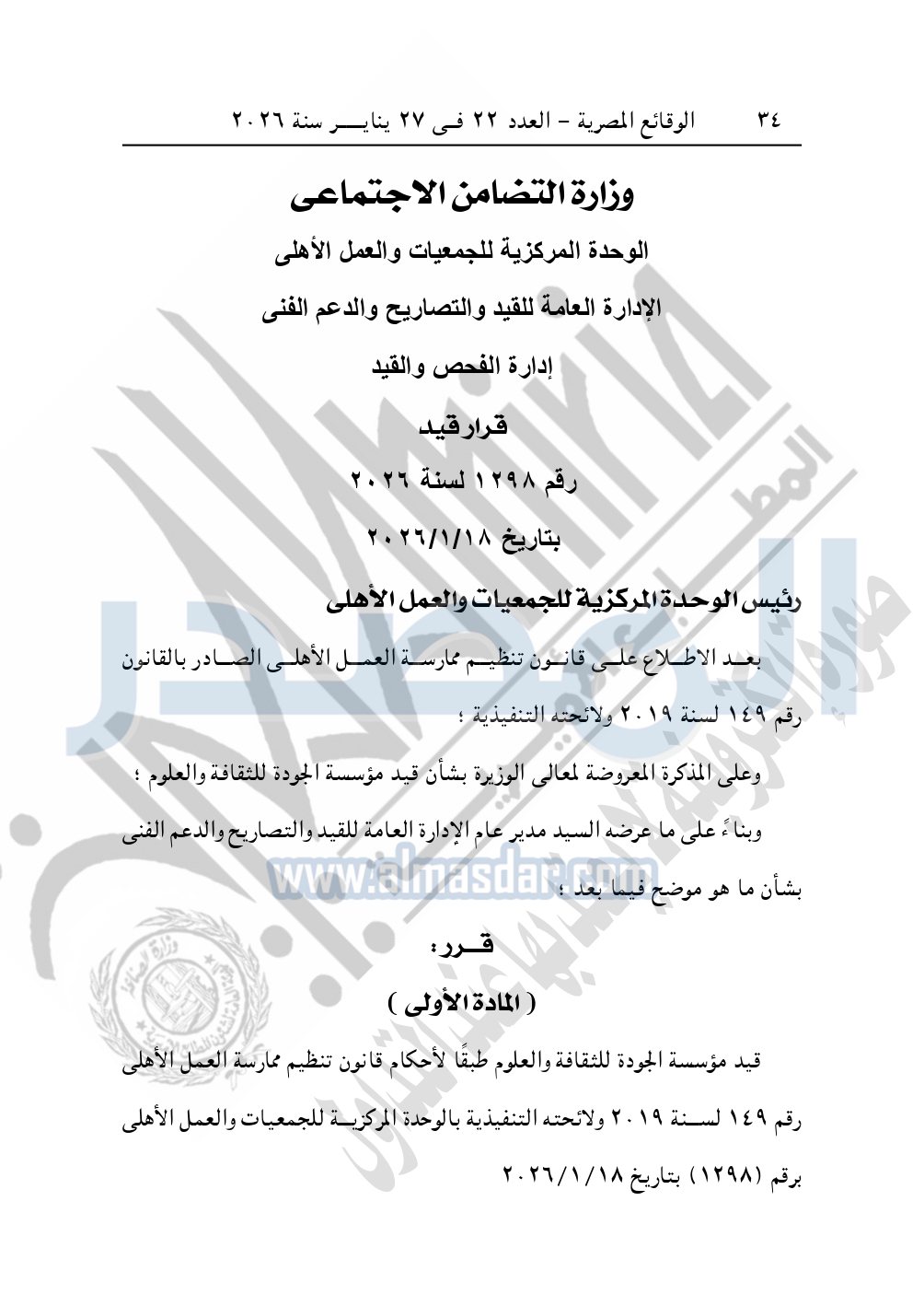 نشرت الوقائع المصرية في العدد 22، الصادر في 27 يناير 2026، قرار وزارة التضامن الاجتماعي، قيد رقم 1298 لسنة 2026، بتاريخ 18-1-2026، بشأن قيد مؤسسة الجودة للثقافة والعلوم.