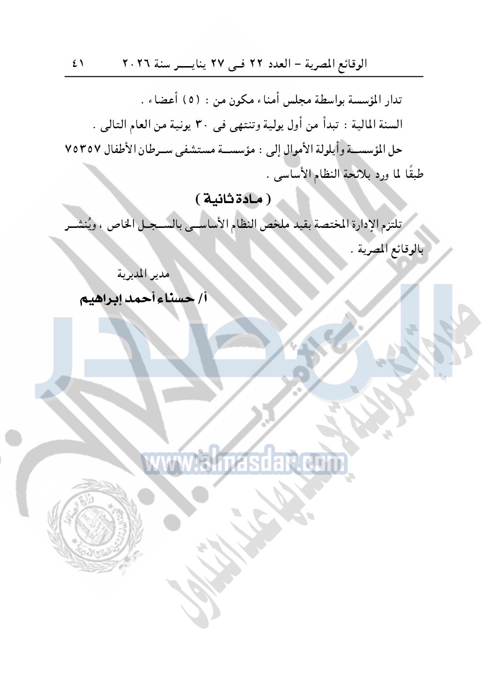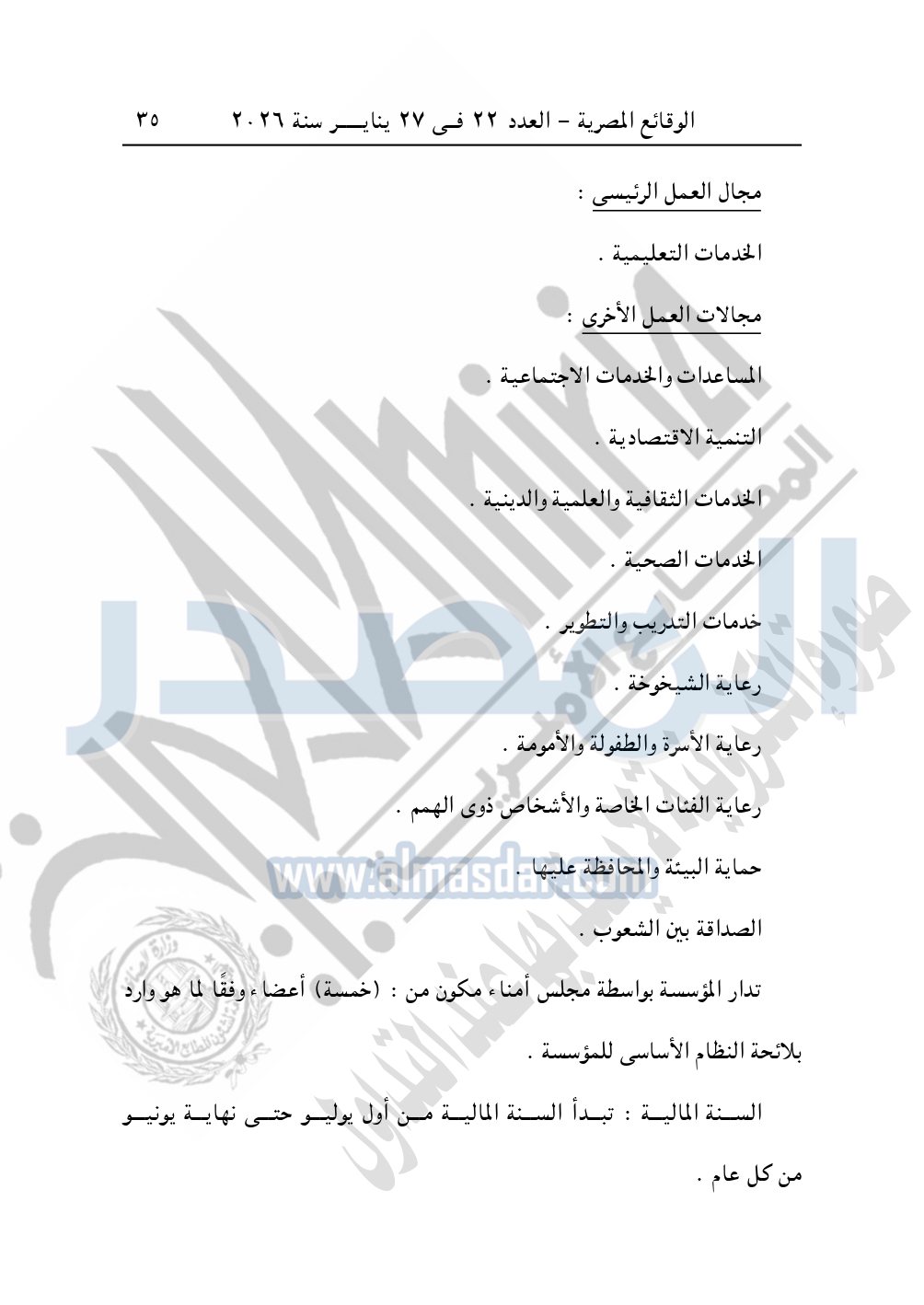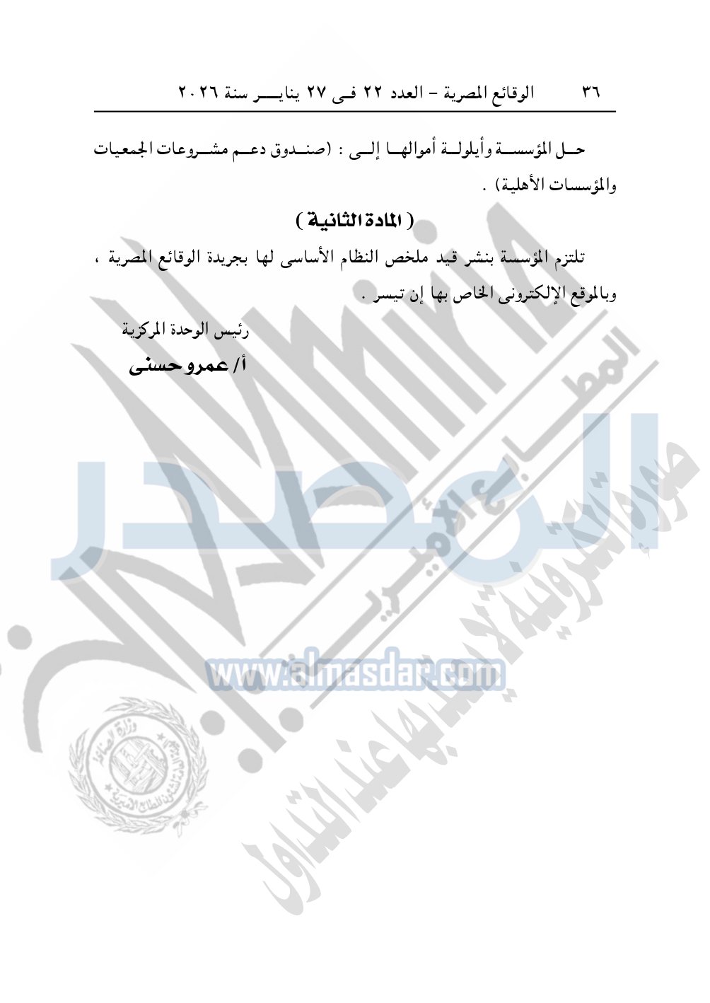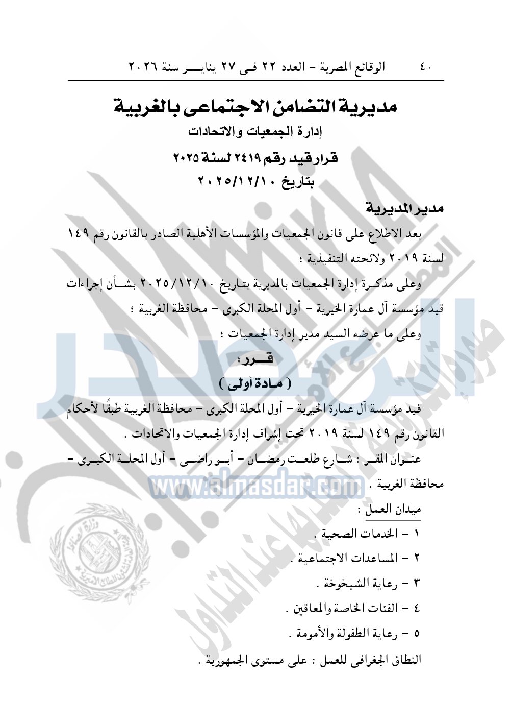 كما نشرت الوقائع المصرية في العدد 22، الصادر في 27 يناير 2026، قرار مديرية التضامن الاجتماعي بالغربية، قيد رقم 2419 لسنة 2025، بتاريخ 10-12-2025، بشأن قيد مؤسسة آل عمارة الخيرية – أول المحلة الكبرى – محافظة الغربية.