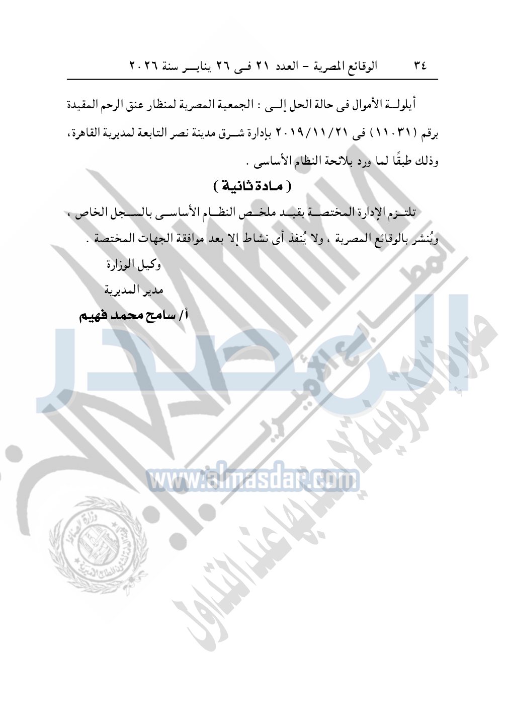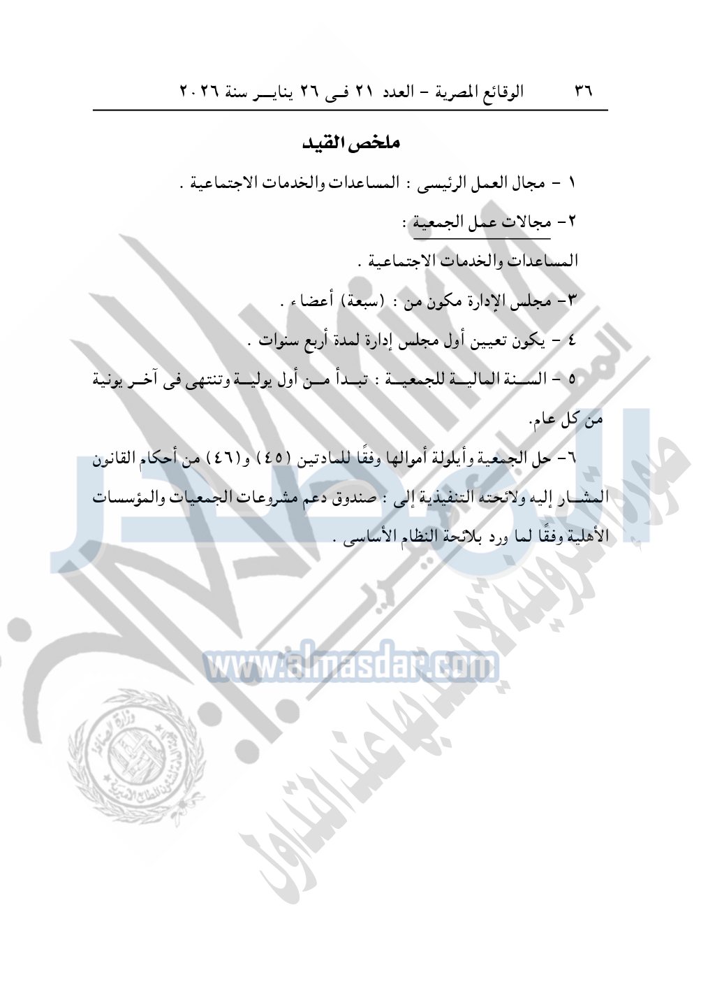 كما نشرت الوقائع المصرية في العدد 21، الصادر في 26 يناير 2026، قرار مديرية التضامن الاجتماعي بالقاهرة، قيد رقم 12586 لسنة 2025، بتاريخ 9-12-2025، بشأن قيد جمعية جراحات الحوض النسائية والسلس البولى.