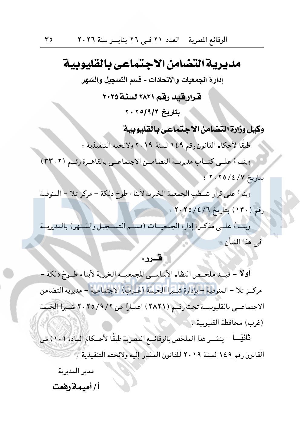 ونشرت الوقائع المصرية في العدد 21، الصادر في 26 يناير 2026، قرار مديرية التضامن الاجتماعي بالقليوبية، قيد رقم 2821 لسنة 2025، بتاريخ 2-9-2025، بشأن قيد الجمعية الخيرية لأبناء طوخ دلكة – مركز تلا - المنوفية.