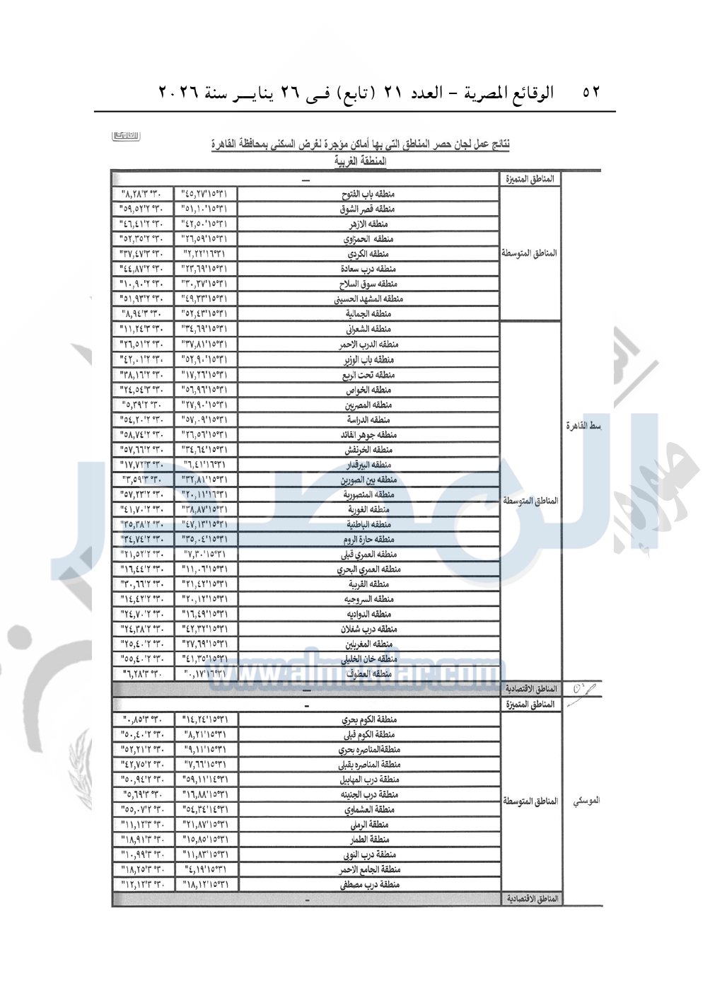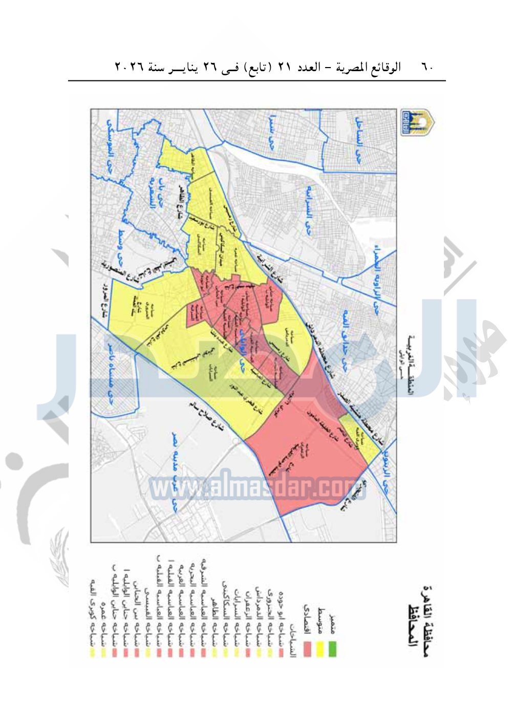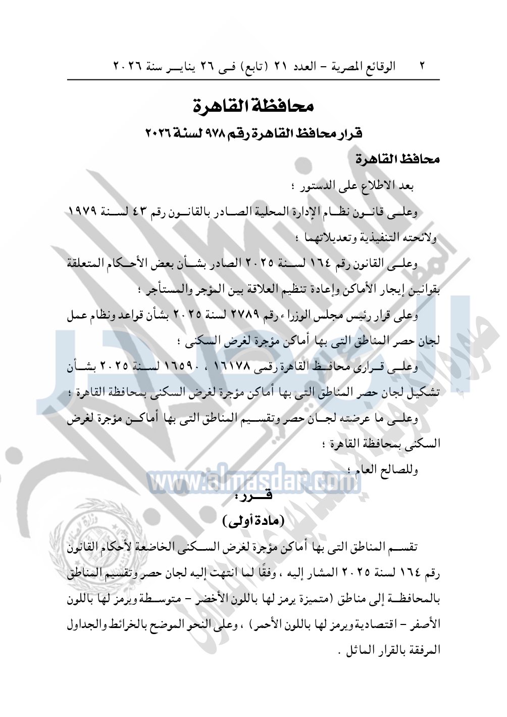 نشرت الوقائع المصرية في العدد 21 "تابع" الصادر في 26 يناير سنة 2026، محافظة القاهرة، قرار محافظ القاهرة رقم 978 لسنة 2026، بشأن تقسيم المناطق التي بها أماكن مؤجرة لغرض السكني بمحافظة القاهرة.