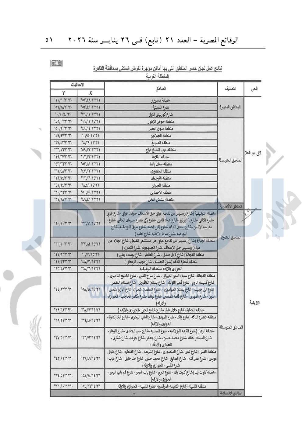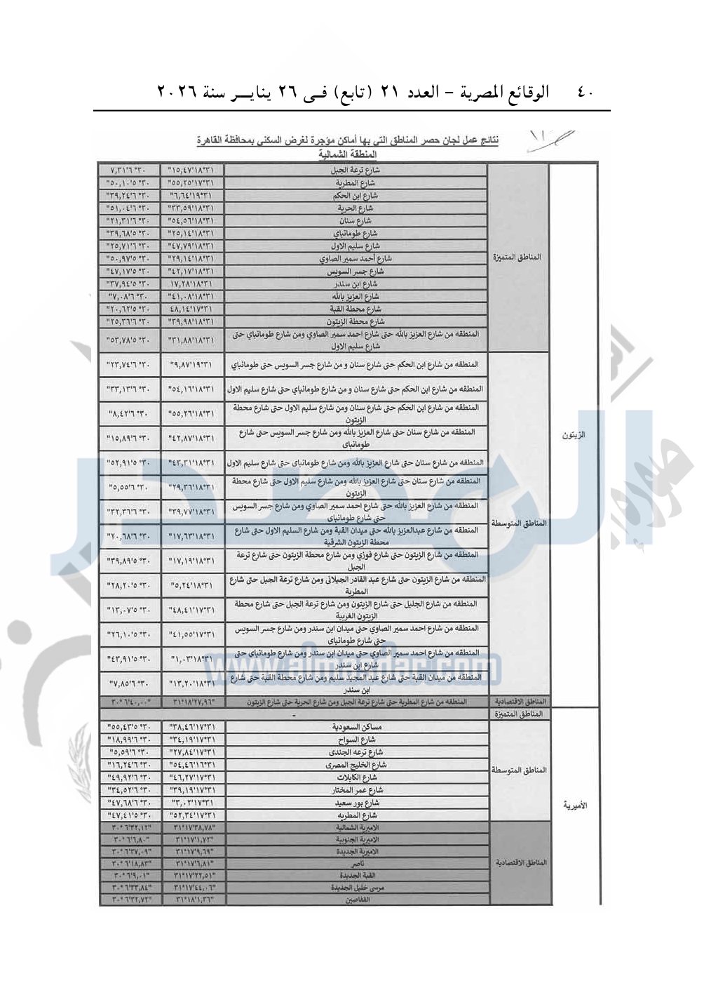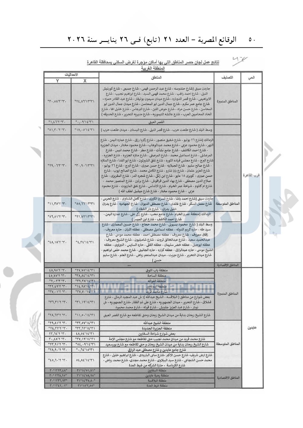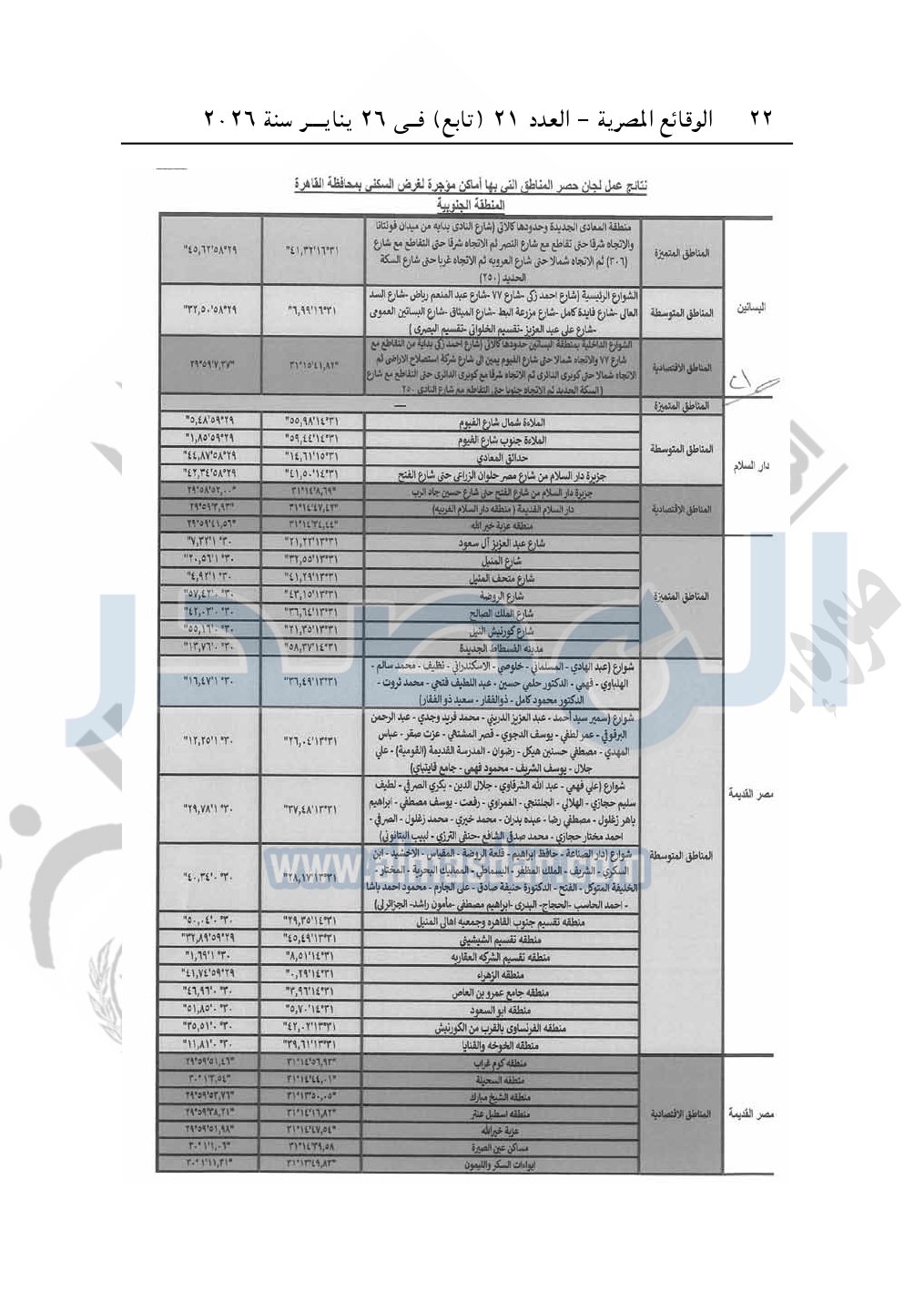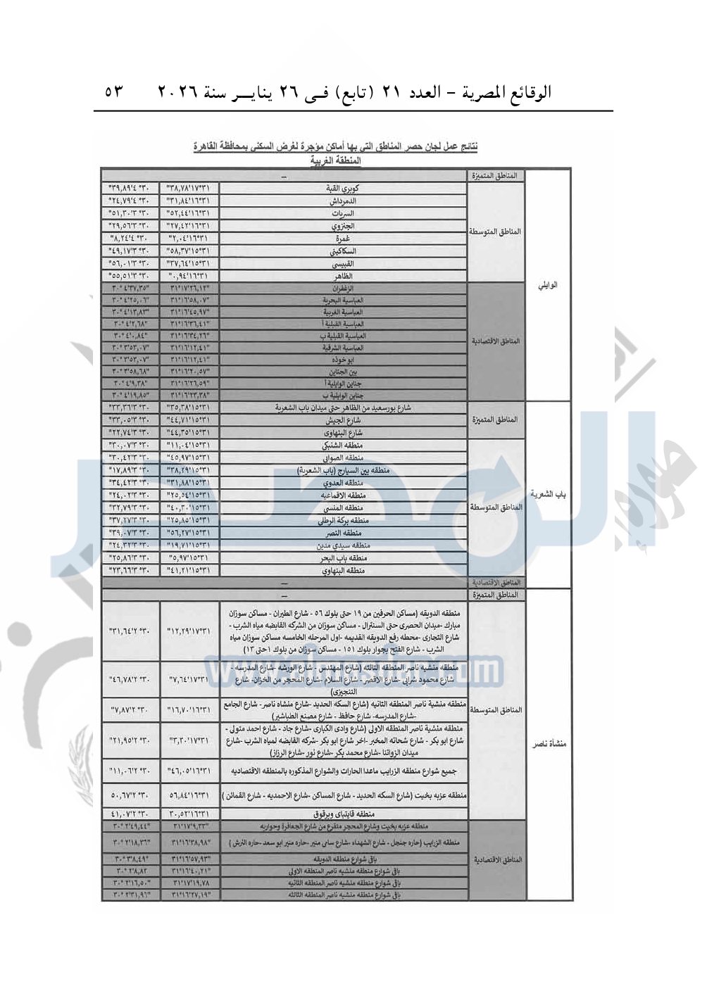 وعلى قرار رئيس مجلس الوزراء رقم 2789 لسنة 2025 بشأن قواعد ونظام عمل لجان حصر المناطق التي بها أماكن مؤجرة لغرض السكني، وعلى قرارى محافظ القاهرة رقمى 16178، 16590 لسنة 2025 بشأن تشكيل لجان حصر المناطق التي بها أماكن مؤجرة لغرض السكنى بمحافظة القاهرة؛ وعلى ما عرضته لجان حصر وتقسيم المناطق التي بها أماكن مؤجرة لغرض السكنى بمحافظة القاهرة؛ وللصالح العام.