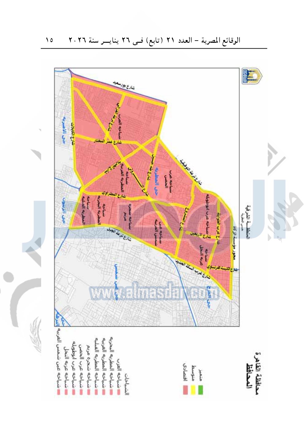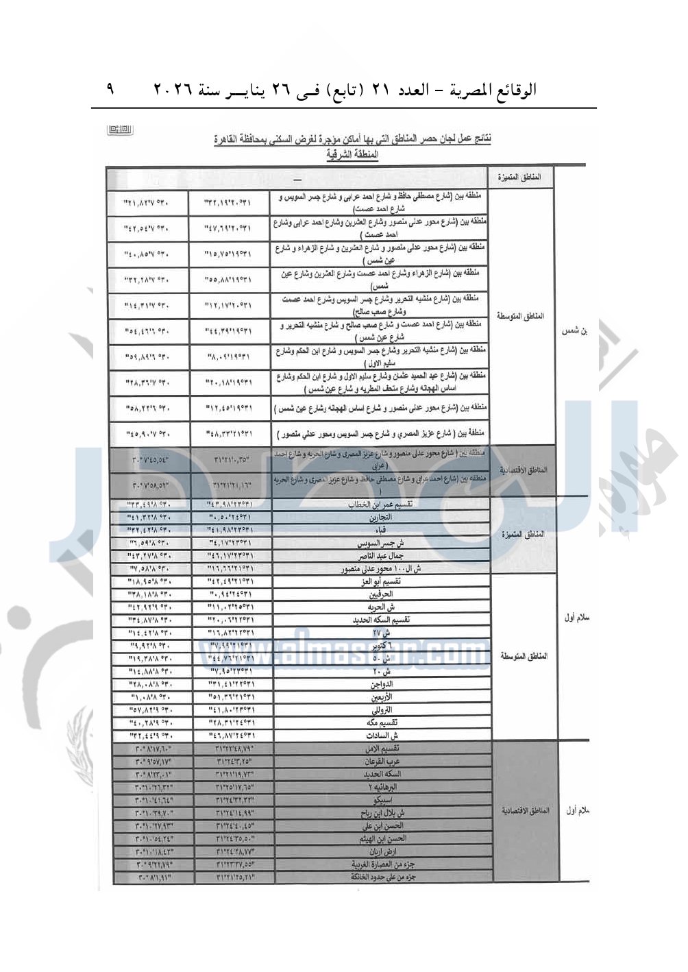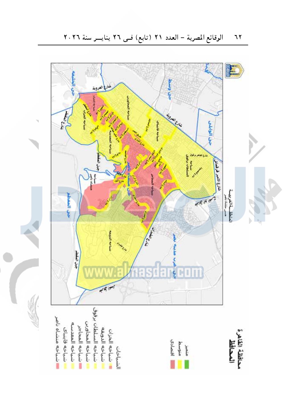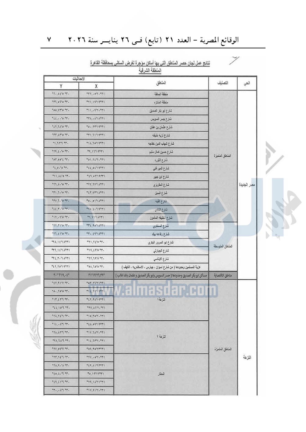 وعلى قرار رئيس مجلس الوزراء رقم 2789 لسنة 2025 بشأن قواعد ونظام عمل لجان حصر المناطق التي بها أماكن مؤجرة لغرض السكني، وعلى قرارى محافظ القاهرة رقمى 16178، 16590 لسنة 2025 بشأن تشكيل لجان حصر المناطق التي بها أماكن مؤجرة لغرض السكنى بمحافظة القاهرة؛ وعلى ما عرضته لجان حصر وتقسيم المناطق التي بها أماكن مؤجرة لغرض السكنى بمحافظة القاهرة؛ وللصالح العام.