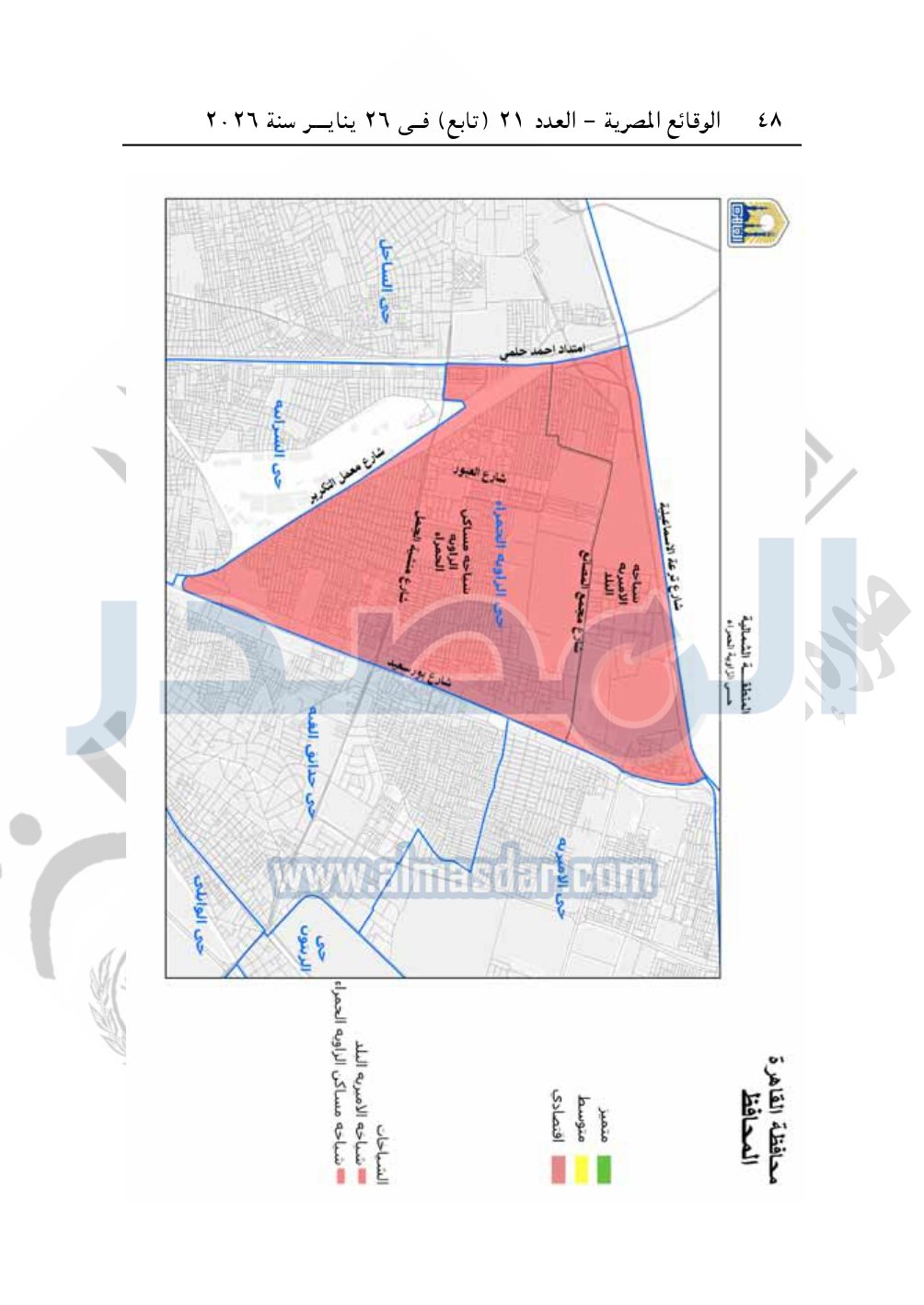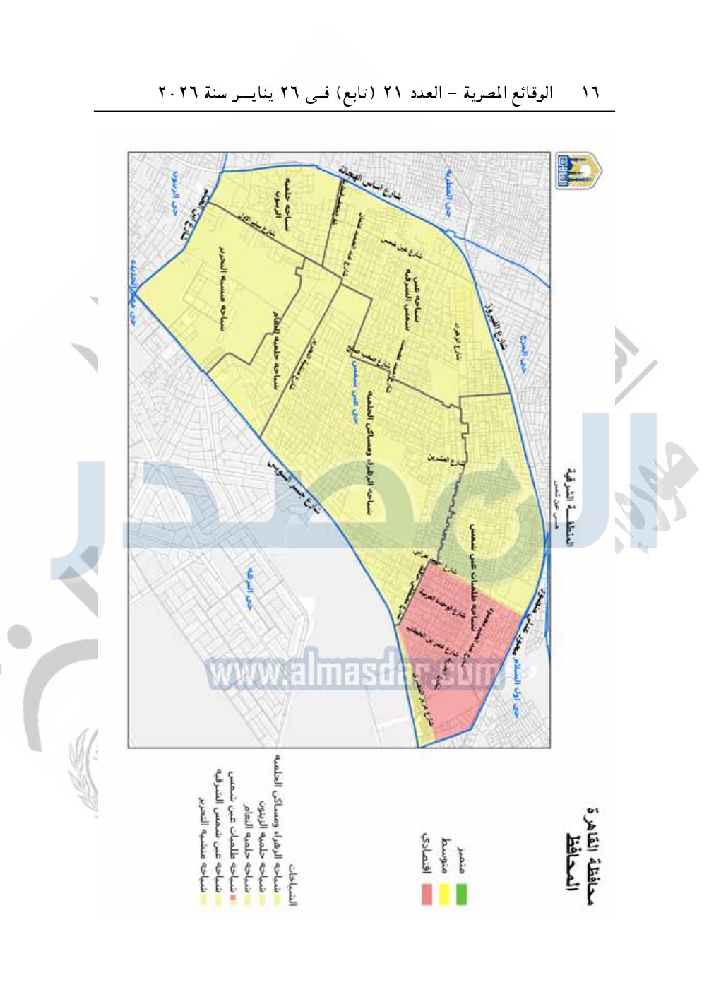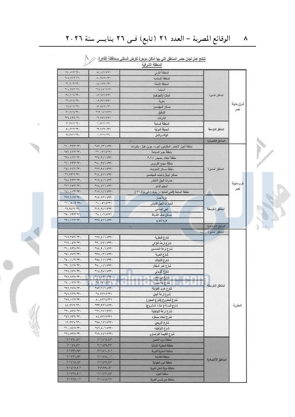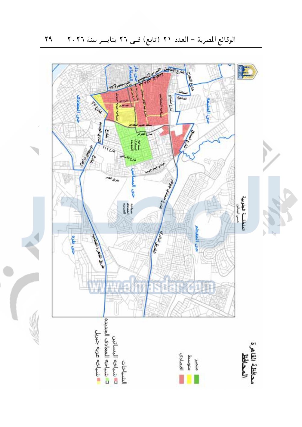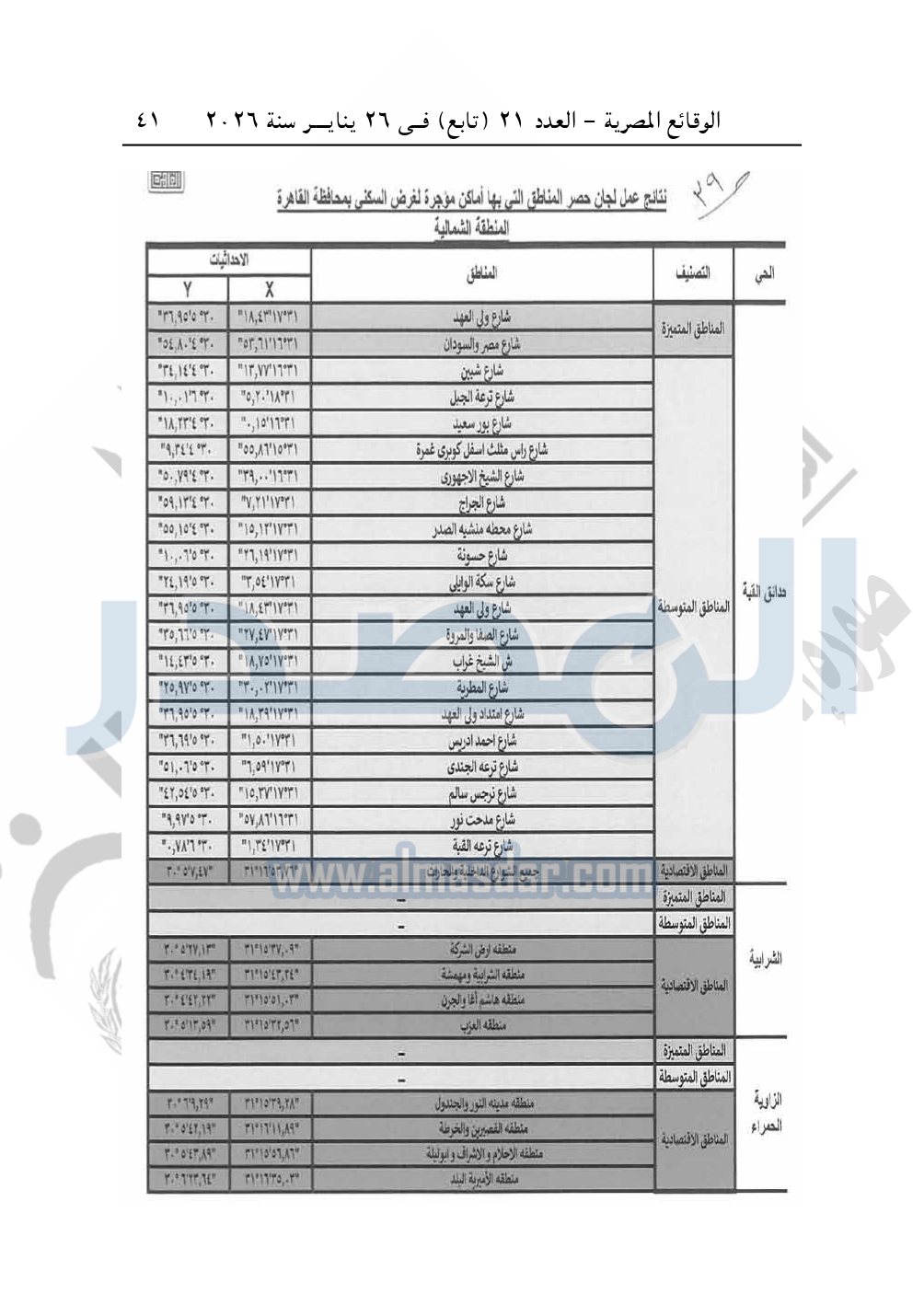 وعلى قرار رئيس مجلس الوزراء رقم 2789 لسنة 2025 بشأن قواعد ونظام عمل لجان حصر المناطق التي بها أماكن مؤجرة لغرض السكني، وعلى قرارى محافظ القاهرة رقمى 16178، 16590 لسنة 2025 بشأن تشكيل لجان حصر المناطق التي بها أماكن مؤجرة لغرض السكنى بمحافظة القاهرة؛ وعلى ما عرضته لجان حصر وتقسيم المناطق التي بها أماكن مؤجرة لغرض السكنى بمحافظة القاهرة؛ وللصالح العام.