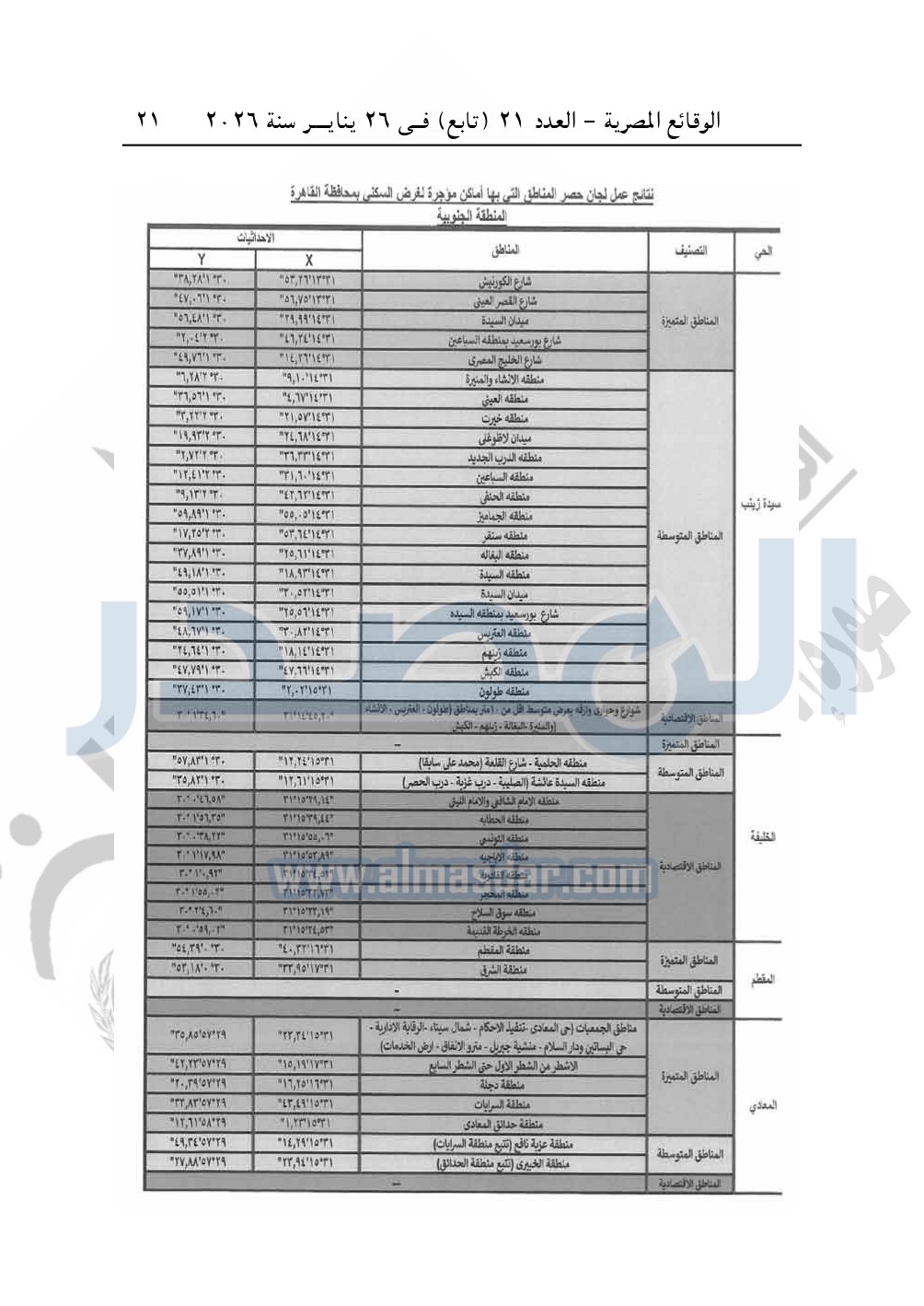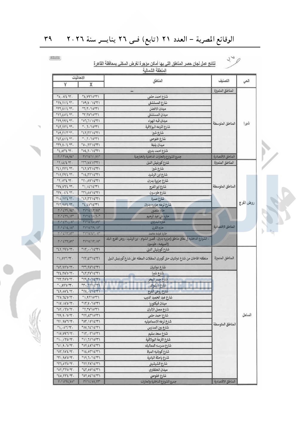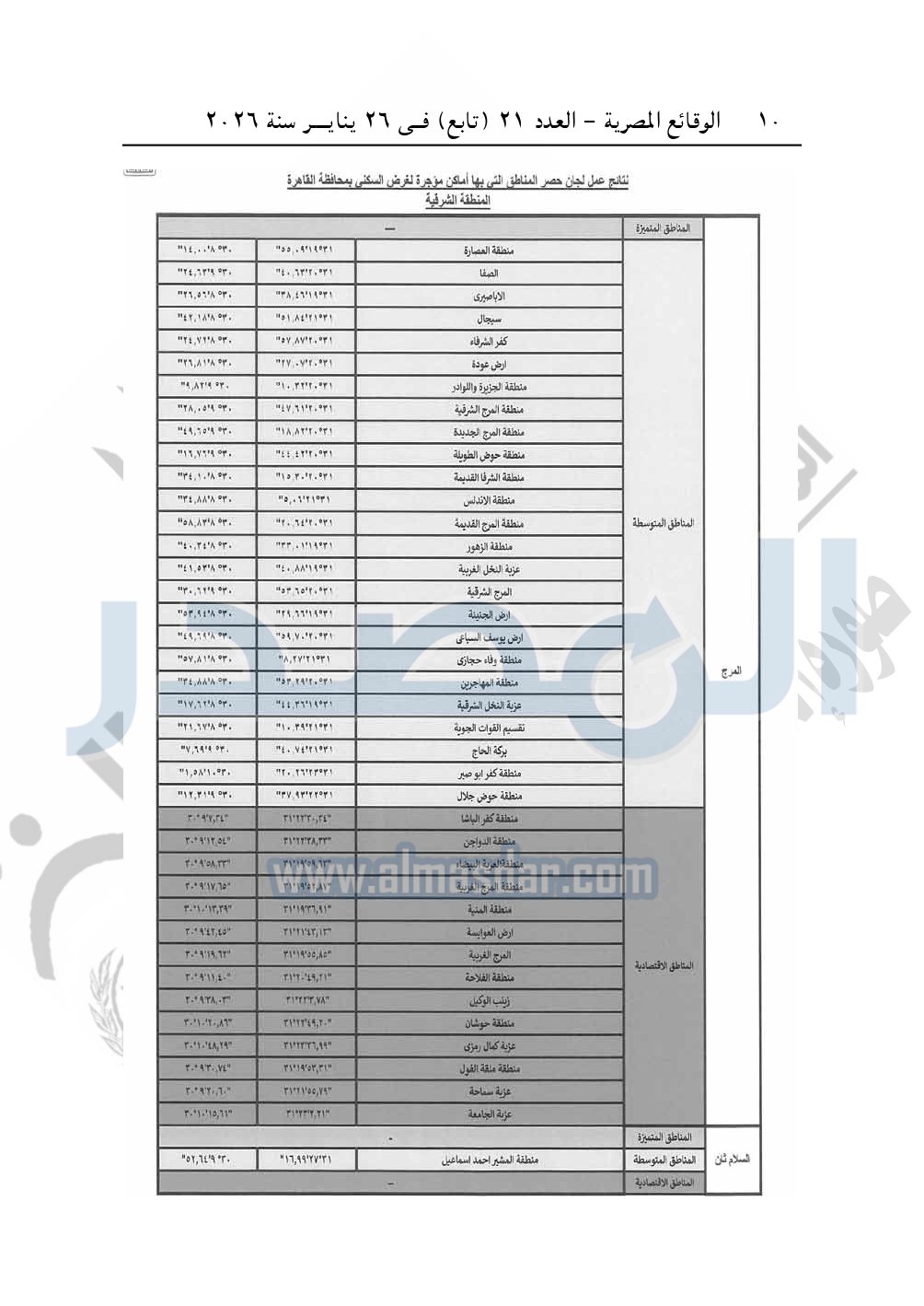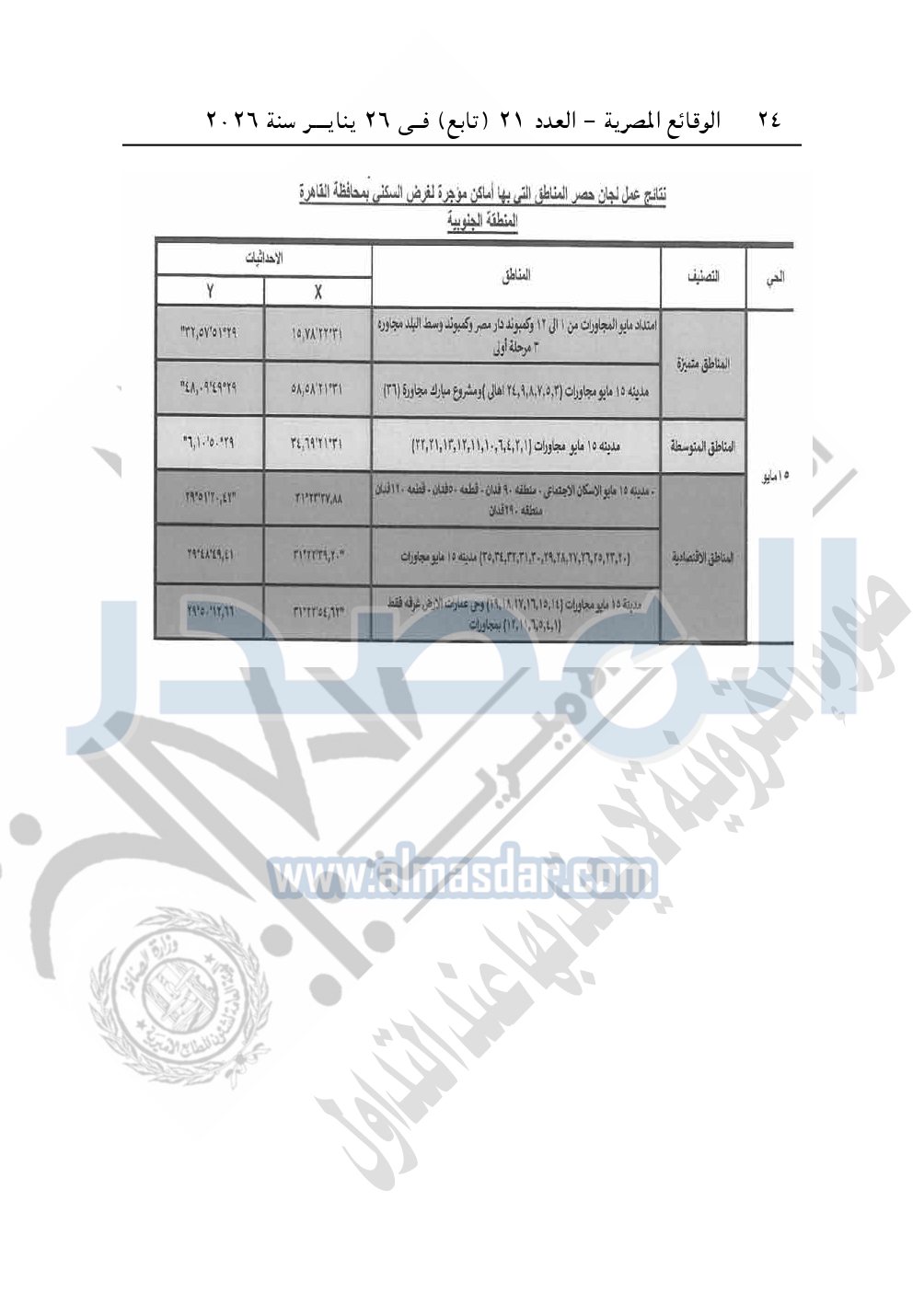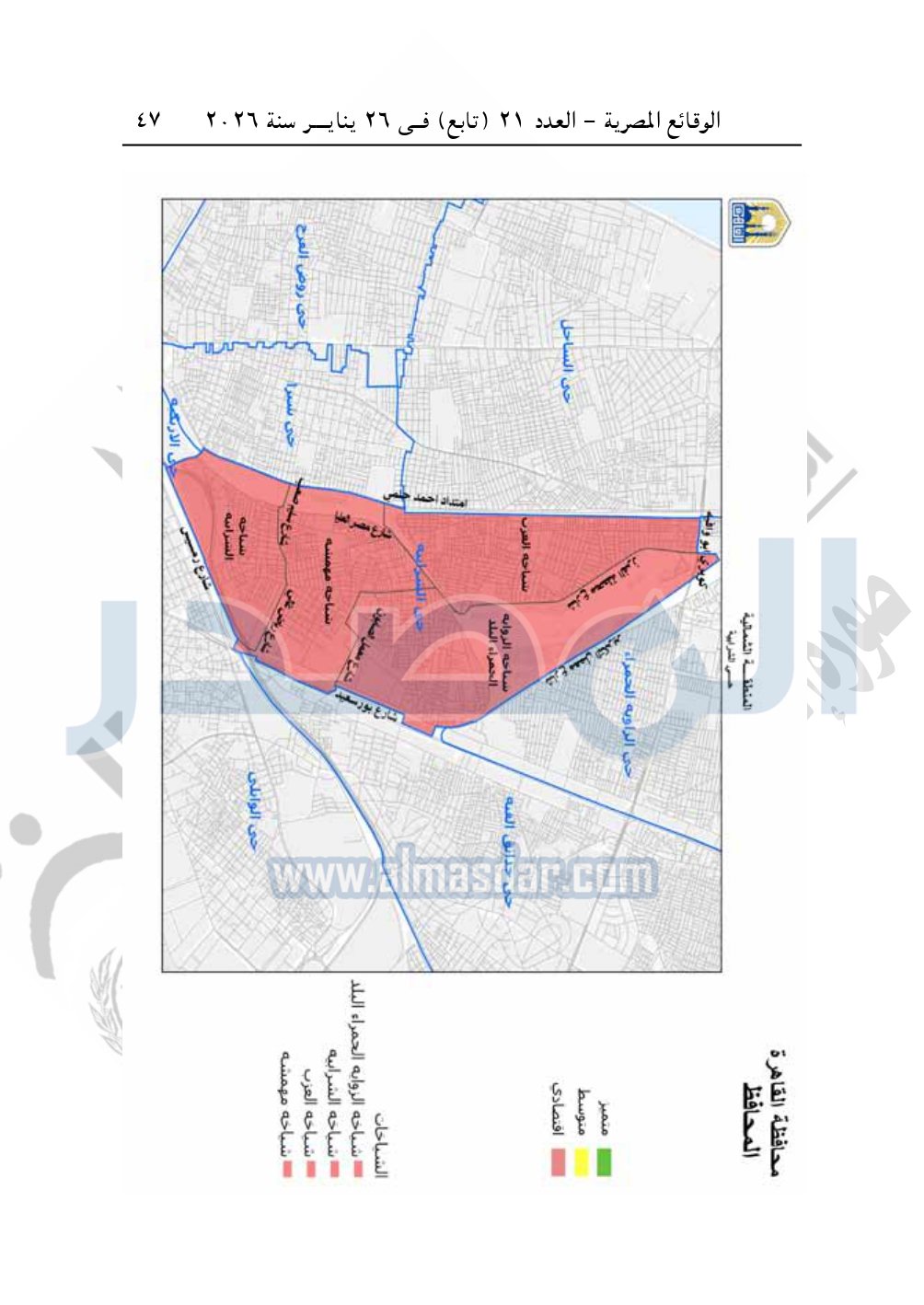 وعلى قرار رئيس مجلس الوزراء رقم 2789 لسنة 2025 بشأن قواعد ونظام عمل لجان حصر المناطق التي بها أماكن مؤجرة لغرض السكني، وعلى قرارى محافظ القاهرة رقمى 16178، 16590 لسنة 2025 بشأن تشكيل لجان حصر المناطق التي بها أماكن مؤجرة لغرض السكنى بمحافظة القاهرة؛ وعلى ما عرضته لجان حصر وتقسيم المناطق التي بها أماكن مؤجرة لغرض السكنى بمحافظة القاهرة؛ وللصالح العام.