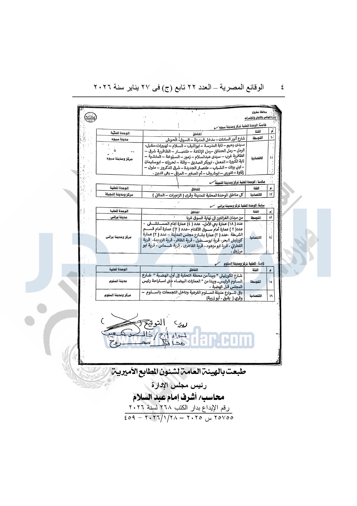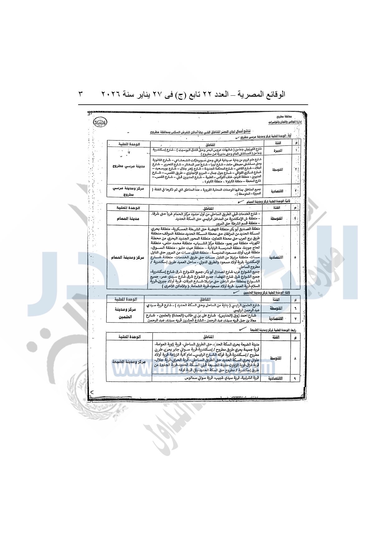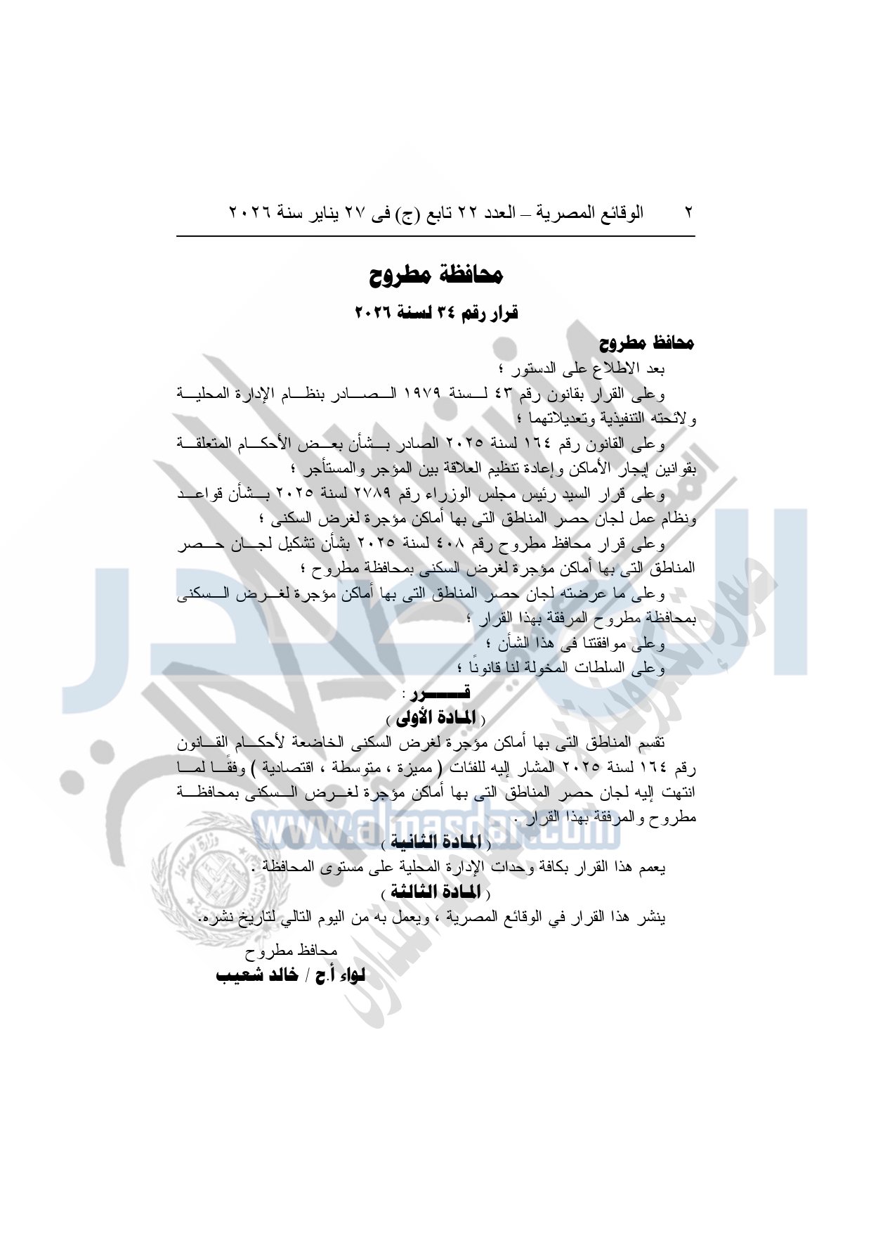 نشرت الوقائع المصرية في العدد 22 تابع "ج" الصادر في 27 يناير سنة 2026، محافظة مطروح قرار رقم 34 لسنة 2026، بشأن تقسيم المناطق التي بها أماكن مؤجرة لغرض السكني بمحافظة مطروح.
