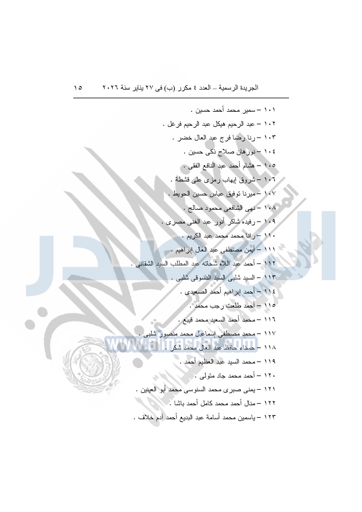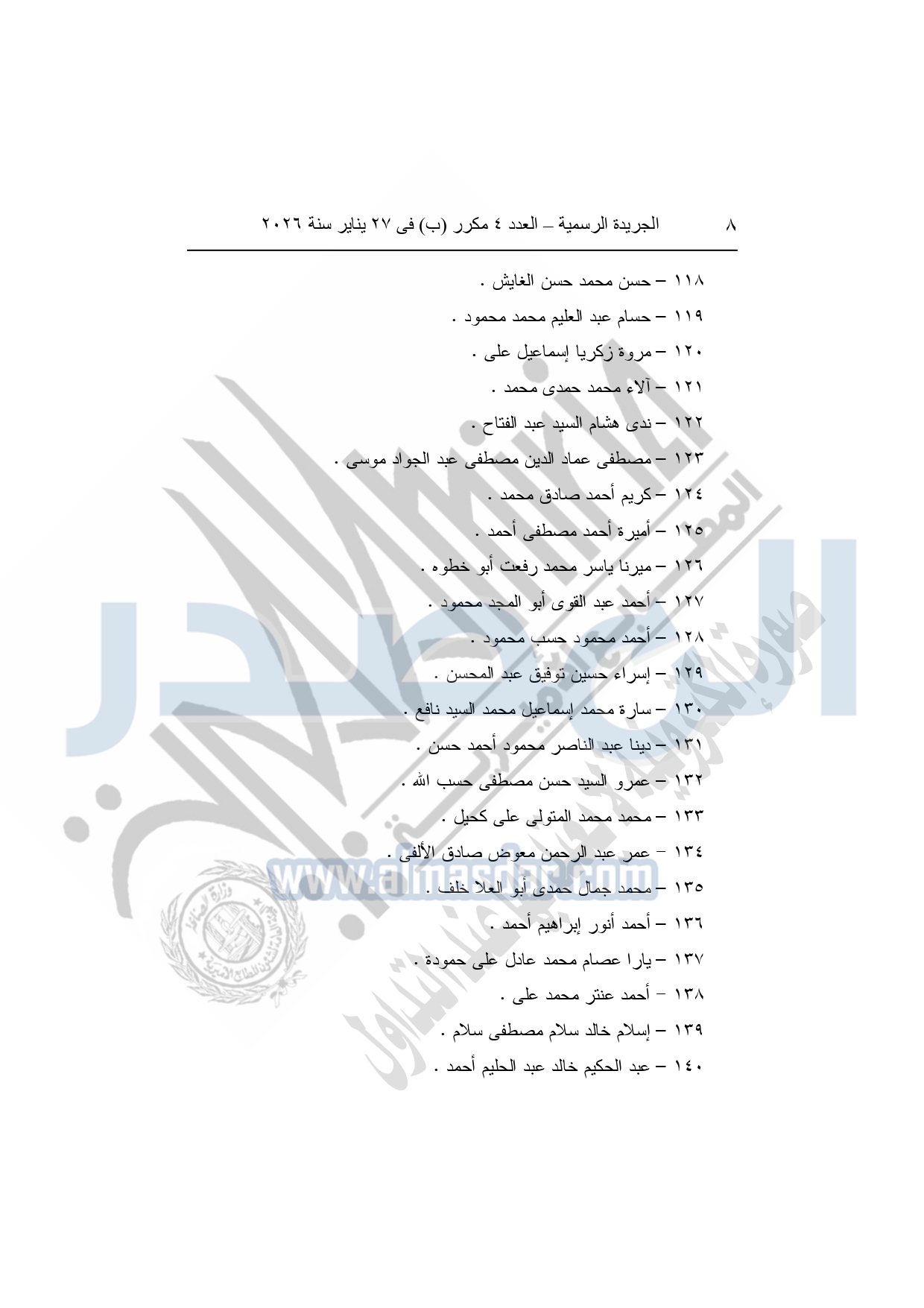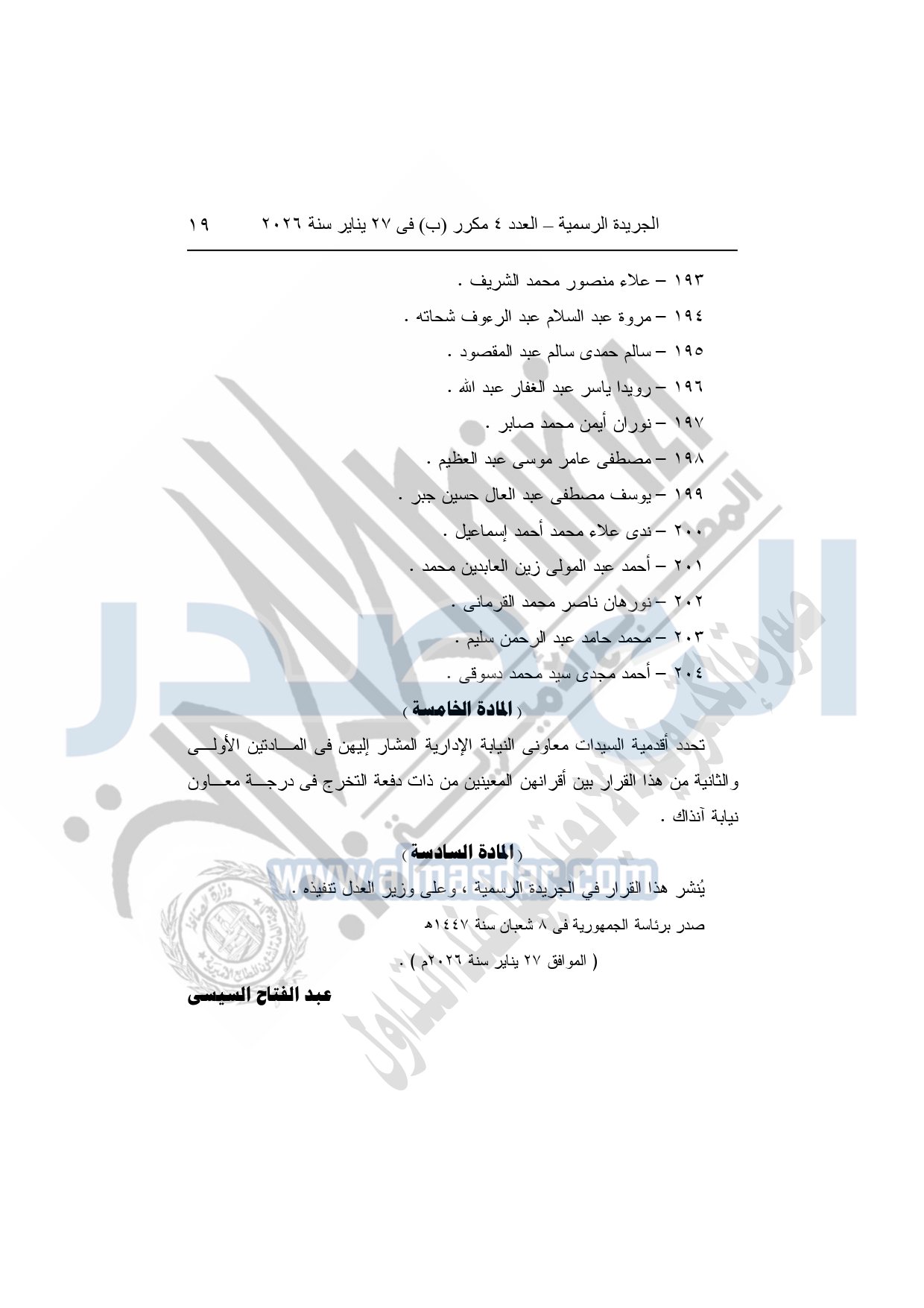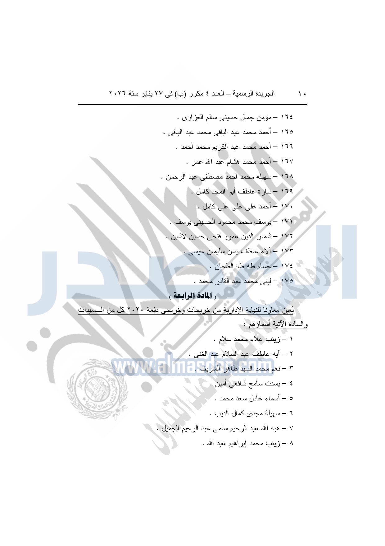 يعين معاونا للنيابة الإدارية من خريجات وخريجي دفعة 2020 كل من السيدات والسادة الآتية أسماؤهم: