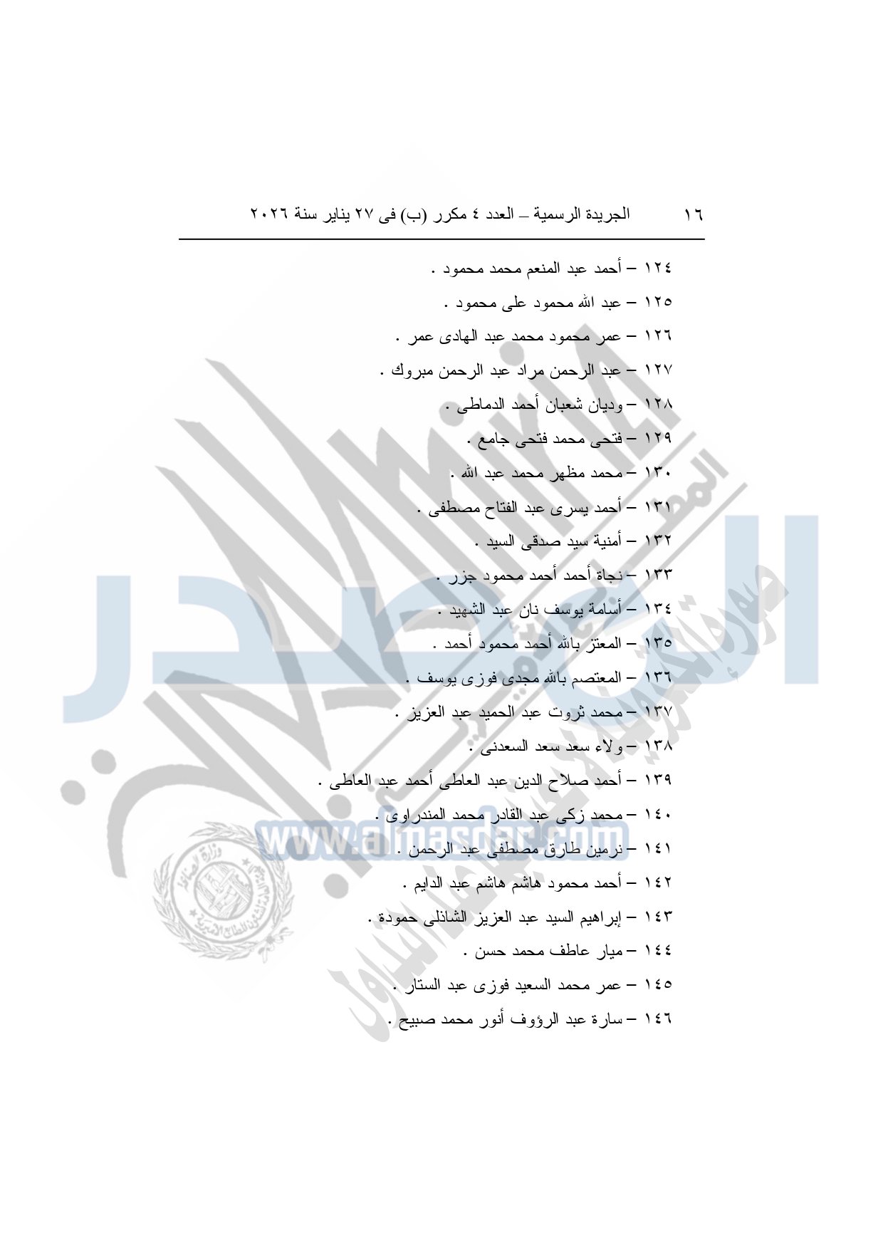نشرت الجريدة الرسمية، في العدد 4 مكرر "ب"، الصادر في 27 يناير سنة 2026، قرار رئيس جمهورية مصر العربية، رقم 51 لسنة 2026، بشأن تعيين 383 معاونا للنيابة الإدارية.