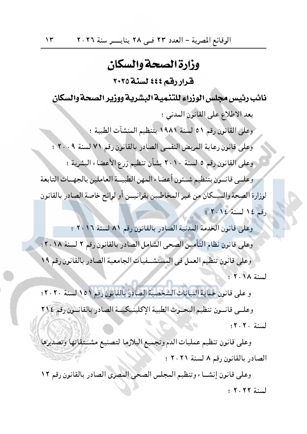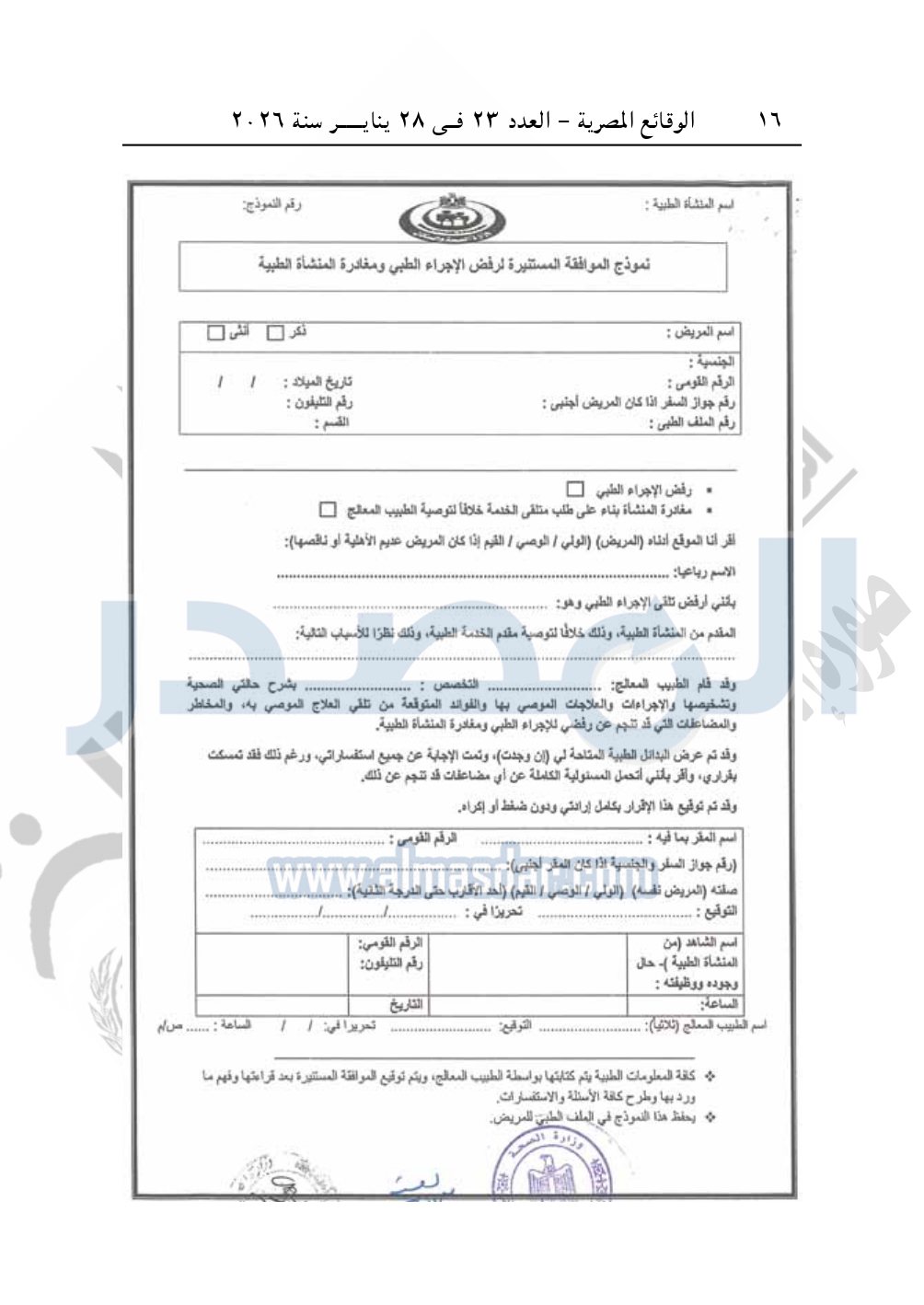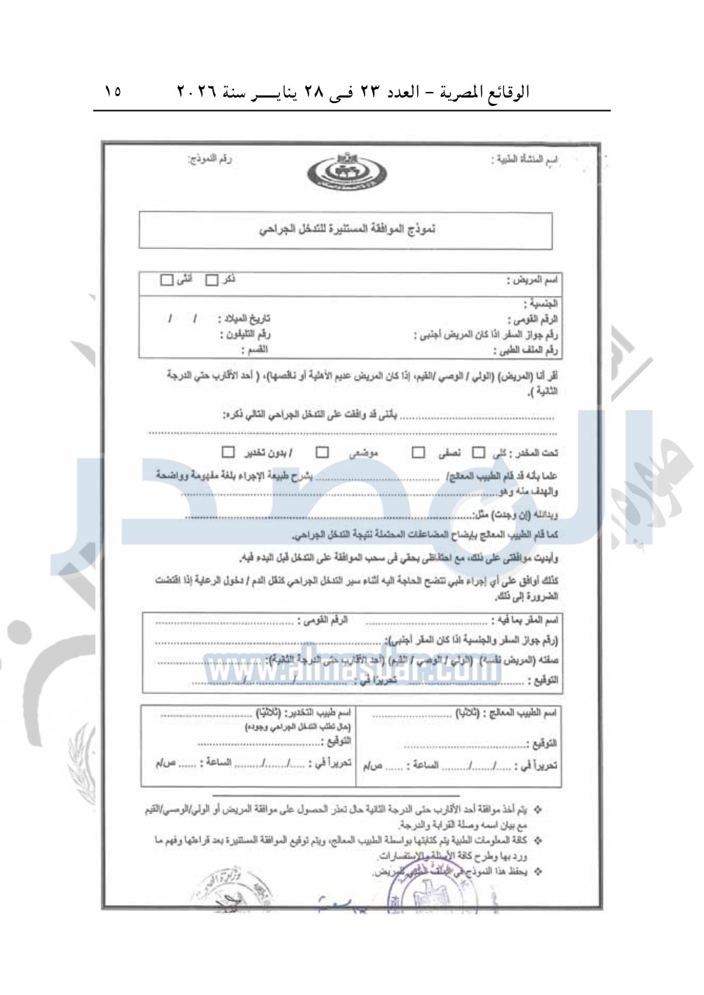 نشرت الوقائع المصرية في العدد 23 الصادر في 28 يناير سنة 2026، قرار وزارة الصحة والسكان، رقم 444 لسنة 2025، بشأن تنظيم الموافقة المستنيرة للتدخلات الجراحية.