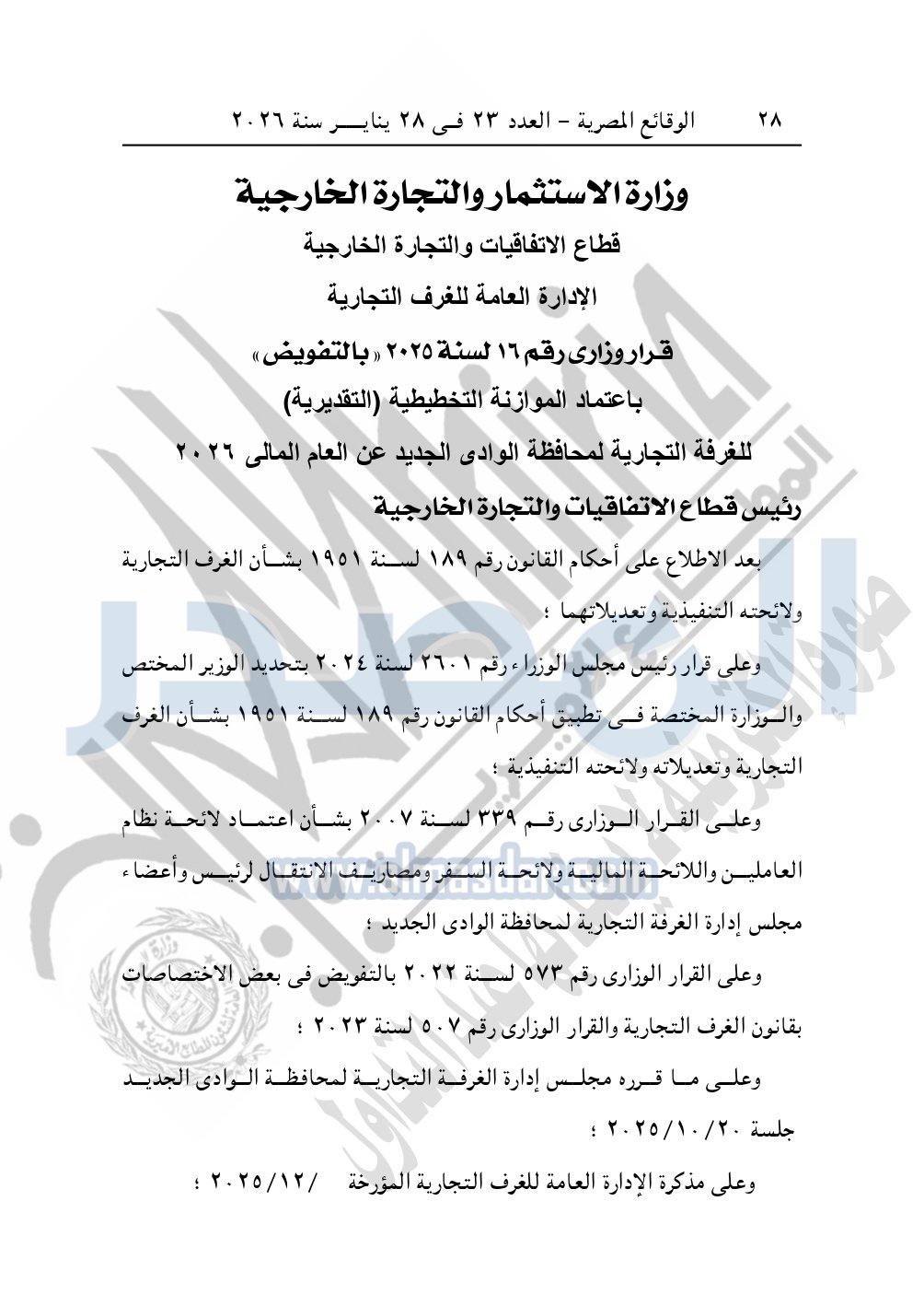 نشرت الوقائع المصرية، في العدد 23، الصادر في 28 يناير 2026، قرار وزارة الاستثمار والتجارة الخارجية، الإدارة العامة لشئون الغرف التجارية، قرار وزاري رقم 16 لسنة 2025 بالتفويض، بشأن اعتماد الموازنة التخطيطية "التقديرية" للغرفة التجارية لمحافظة الوادي الجديد عن العام المالي 2026.