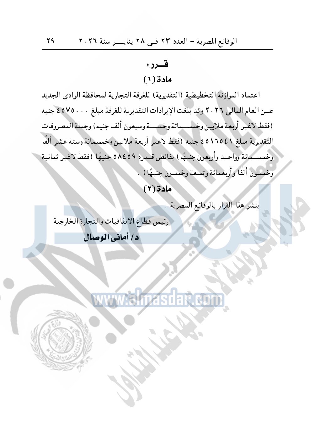 اعتماد الموازنة التخطيطية "التقديرية" للغرفة التجارية لمحافظة الوادي الجديد عن العام المالي 2026 وقد بلغت الإيرادات التقديرية للغرفة مبلغ 4575000 جنيها "فقط لاغير أربعة ملايين وخمسمائة وخمسة وسبعون ألف جنيه" وجملة المصروفات التقديرية مبلغ 4516541 جنيهًا "فقط لاغير أربعة ملايين وخمسمائة وستة عشر ألفاً وخمسمائة وواحد واربعون جنيهاً" بفائض قدره 58459 جنيها "فقط لاغير ثمانية وخمسون ألفاً وأربعمائة وتسعة وخمسون جنيها".