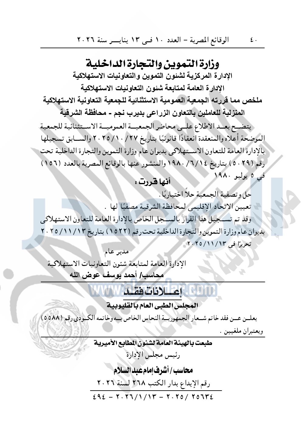 نشرت الوقائع المصرية في العدد 10 الصادر في 13 يناير سنة 2026، وزارة التموين والتجارة الداخلية الإدارة المركزية لشئون التموين والتعاونيات الاستهلاكية الإدارة العامة لمتابعة شئون التعاونيات الاستهلاكية، ملخص مما قررته الجمعية العمومية الاستثنائية للجمعية التعاونية الاستهلاكية المنزلية للعاملين بالتعاون الزراعى بديرب نجم – محافظة الشرقية.