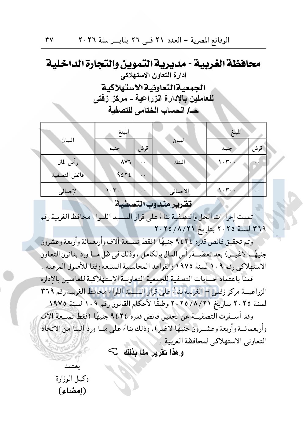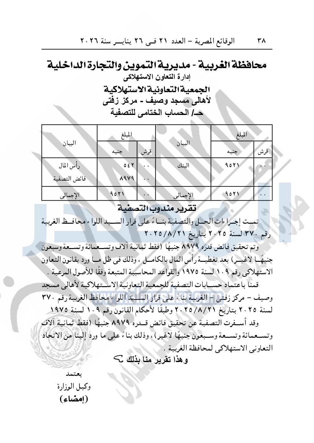 نشرت الوقائع المصرية في العدد 21 الصادر في 26 يناير سنة 2026، محافظة الغربية – مديرية التموين والتجارة الداخلية إدارة التعاون الاستهلاكي الجمعية التعاونية الاستهلاكية لأهالي مسجد وصيف – مركز زفتى حـ/ الحساب الختامي للتصفية