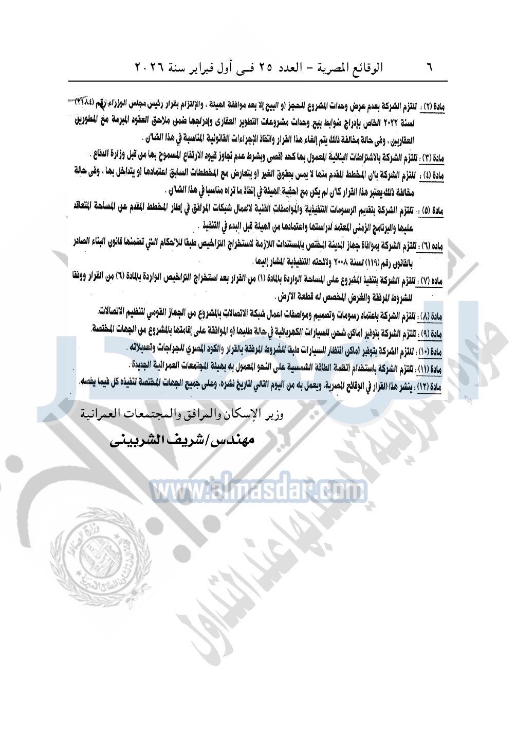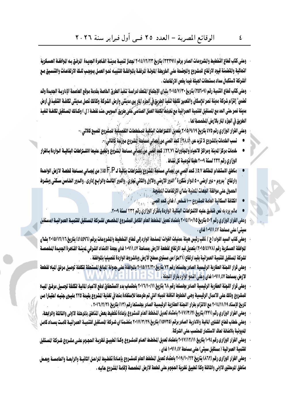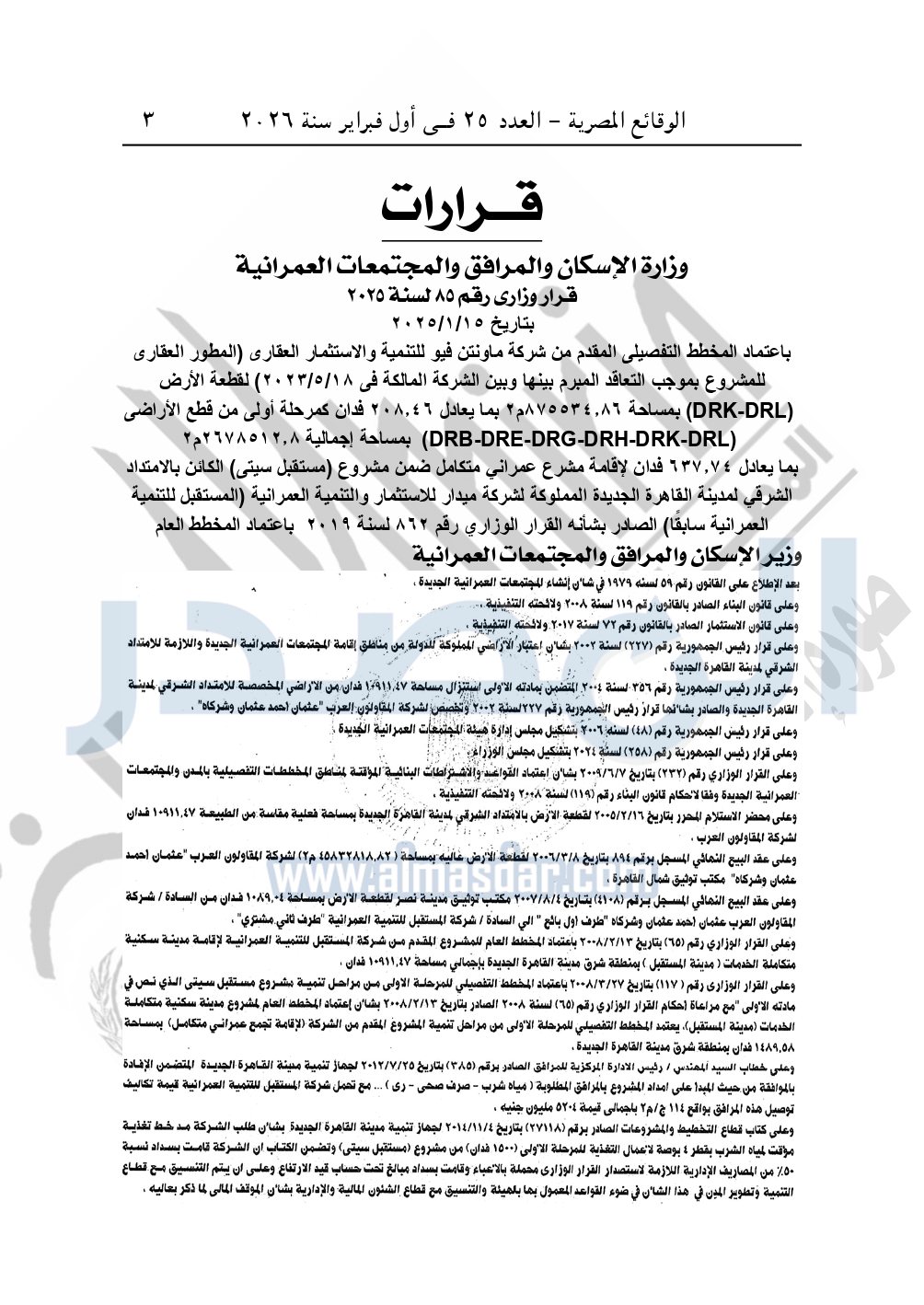 نشرت الوقائع المصرية، في العدد 25، الصادر في أول فبراير سنة 2026، قرار وزارة الإسكان والمرافق والمجتمعات العمرانية، رقم 85 لسنة 2025، بتاريخ 15-1-2025، بشأن اعتماد المخطط التفصيلي المقدم من شركة ماونتن فيو للتنمية والاستثمار العقارى "المطور العقارى للمشروع بموجب التعاقد المبرم بينها وبين الشركة المالكة" لقطعة أرض بمساحة 875534.86م2 بما يعادل 208.46 فدان لإقامة مشرع عمراني متكامل ضمن مشروع "مستقبل سيتى" الكائن بالامتداد الشرقي لمدينة القاهرة الجديدة المملوكة لشركة ميدار للاستثمار والتنمية العمرانية "المستقبل للتنمية العمرانية سابقا".