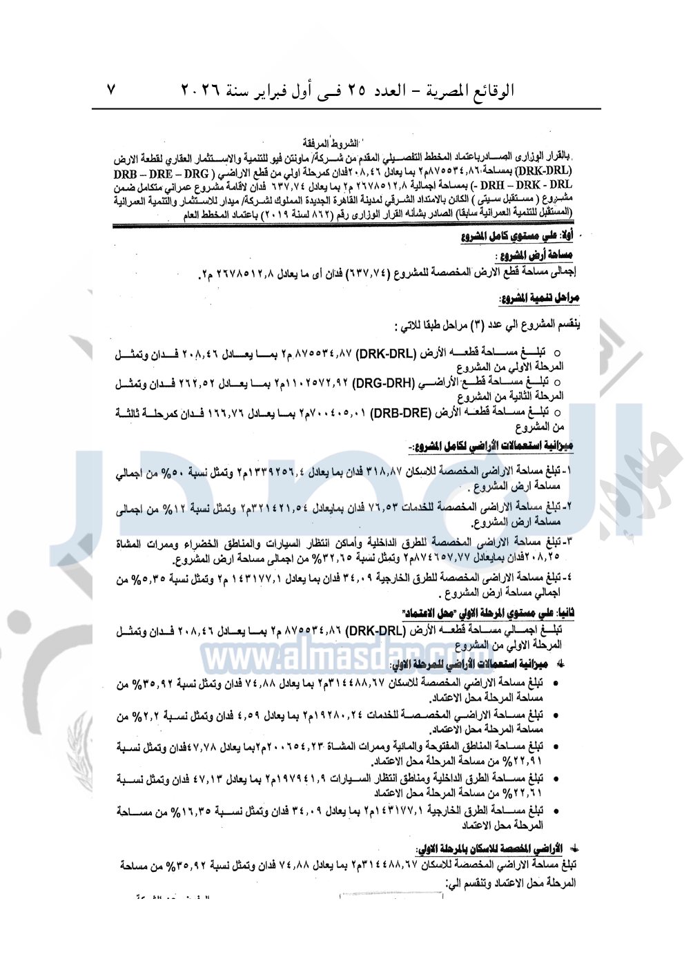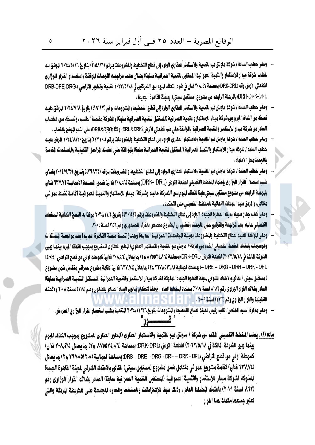 يعتمد المخطط التفصيلي المقدم من شركة ماونتن فيو للتنمية والاستثمار العقارى "المطور العقارى للمشروع بموجب التعاقد المبرم بينها وبين الشركة المالكة فى 18-5-2023" لقطعة الأرض "DRK-DRL" بمساحة 875534.86م2 بما يعادل 208.46 فدان كمرحلة أولى من قطع الأراضي "DRB-DRE-DRG-DRH-DRK-DRL" بمساحة إجمالية 2678512.8م2 بما يعادل 637.74 فدان لإقامة مشرع عمراني متكامل ضمن مشروع "مستقبل سيتى" الكائن بالامتداد الشرقي لمدينة القاهرة الجديدة المملوكة لشركة ميدار للاستثمار والتنمية العمرانية "المستقبل للتنمية العمرانية سابقا" الصادر بشأنه القرار الوزاري رقم 862 لسنة 2019 باعتماد المخطط العام، وذلك طبقا للإشتراطات وللمخطط والحدود الموضحة على الخريطة المرفقة والتي تعتبر جميعها مكملة لهذا القرار.