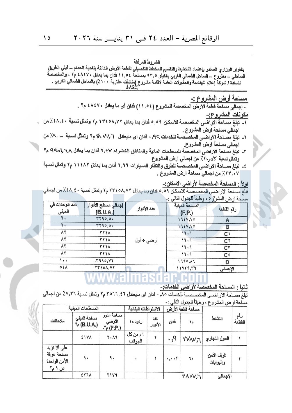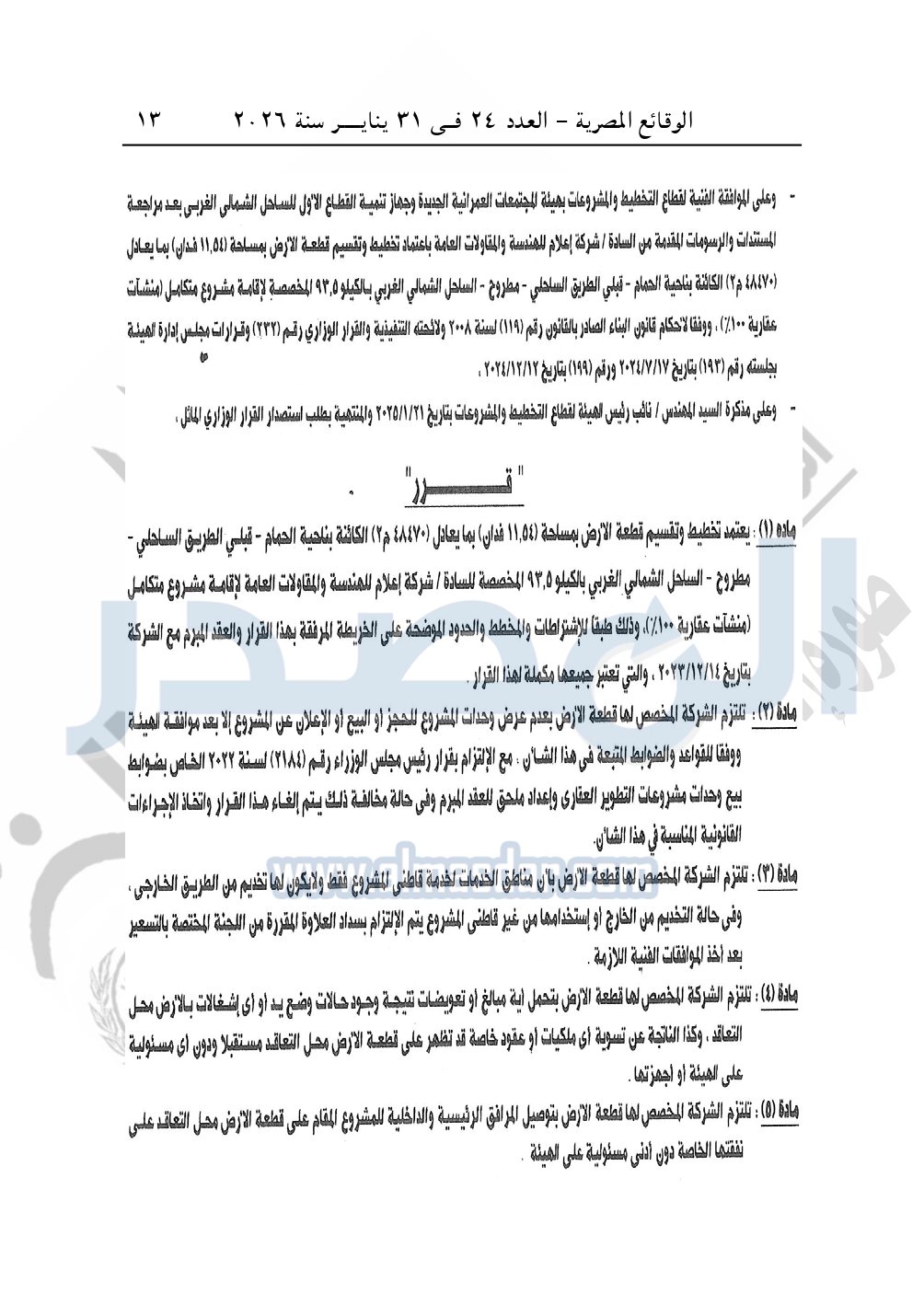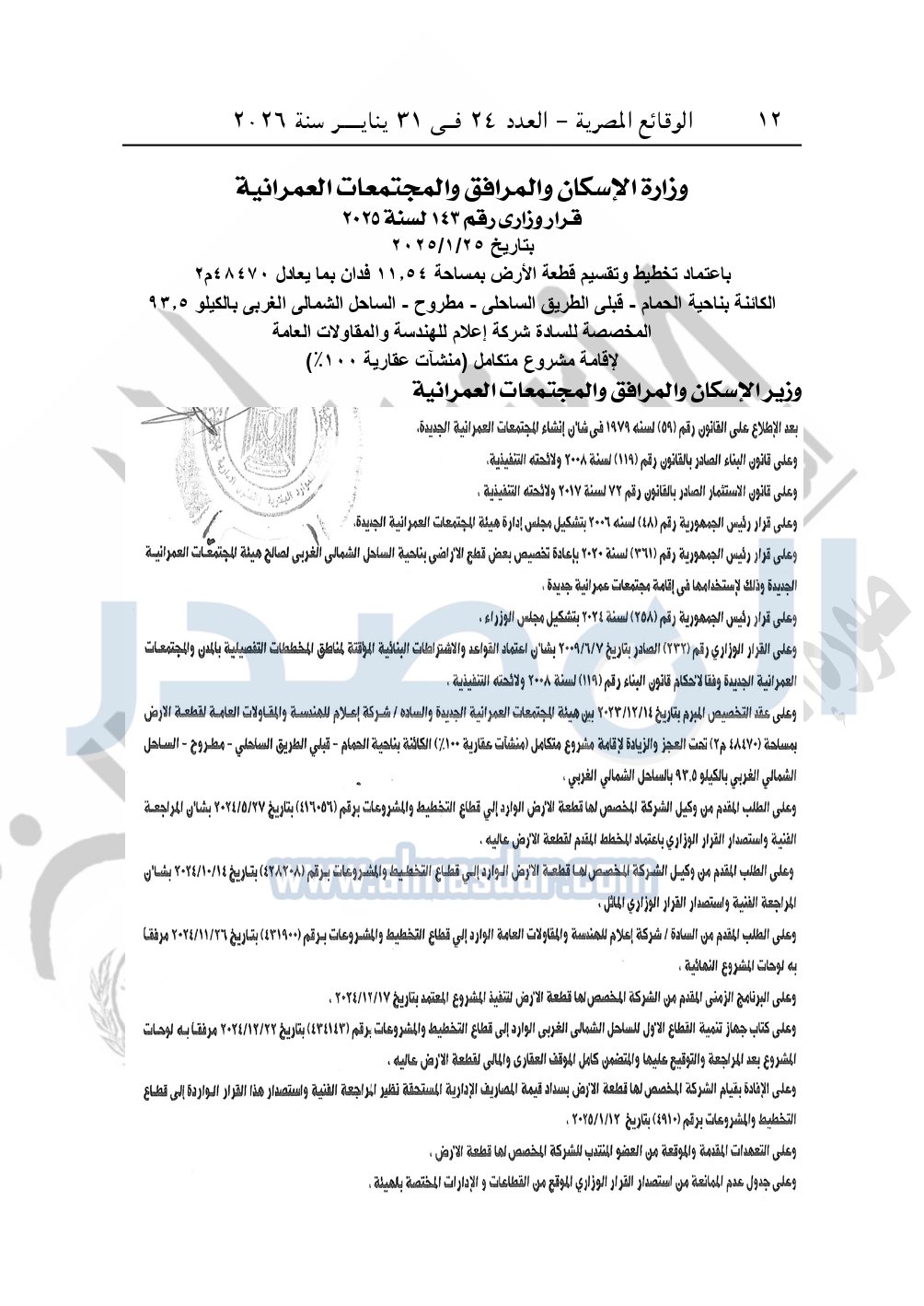 نشرت الوقائع المصرية، في العدد 24، الصادر في 31 يناير سنة 2026، قرار وزارة الإسكان والمرافق والمجتمعات العمرانية، رقم 143 لسنة 2025، بتاريخ 25-1-2025، بشأن اعتماد تخطيط وتقسيم قطعة الأرض بمساحة 11.54 فدان بما يعادل 48470م2 الكائنة بناحية الحمام - قبلى الطريق الساحلى - مطروح - الساحل الشمالي الغربي بالكيلو 93.5 المخصصة لشركة إعلام للهندسة والمقاولات العامة لإقامة مشروع متكامل "منشآت عقارية 100%".