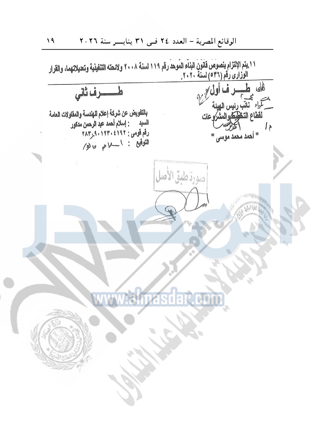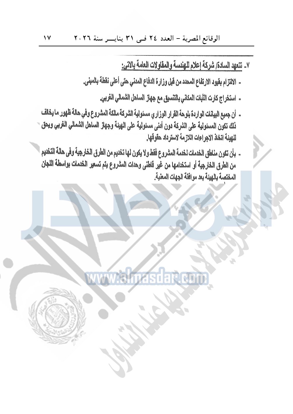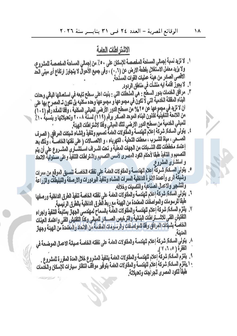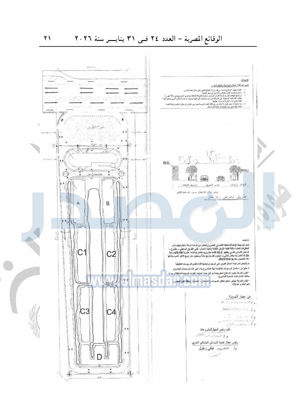نشرت الوقائع المصرية، في العدد 24، الصادر في 31 يناير سنة 2026، قرار وزارة الإسكان والمرافق والمجتمعات العمرانية، رقم 143 لسنة 2025، بتاريخ 25-1-2025، بشأن اعتماد تخطيط وتقسيم قطعة الأرض بمساحة 11.54 فدان بما يعادل 48470م2 الكائنة بناحية الحمام - قبلى الطريق الساحلى - مطروح - الساحل الشمالي الغربي بالكيلو 93.5 المخصصة لشركة إعلام للهندسة والمقاولات العامة لإقامة مشروع متكامل "منشآت عقارية 100%".