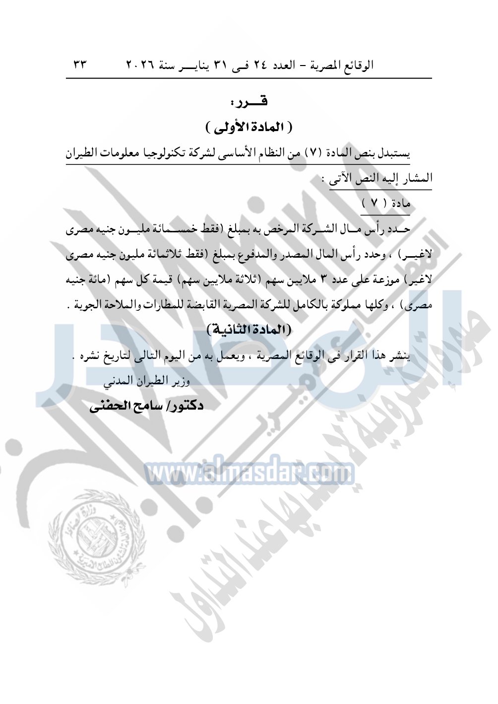 نشرت الوقائع المصرية، في العدد 24، الصادر في 31 يناير سنة 2026، قرار وزارة الطيران المدنى، رقم 1626 لسنة 2025، بتاريخ 10-12-2025، بشأن زيادة رأس مال شركة تكنولوجيا معلومات الطيران.