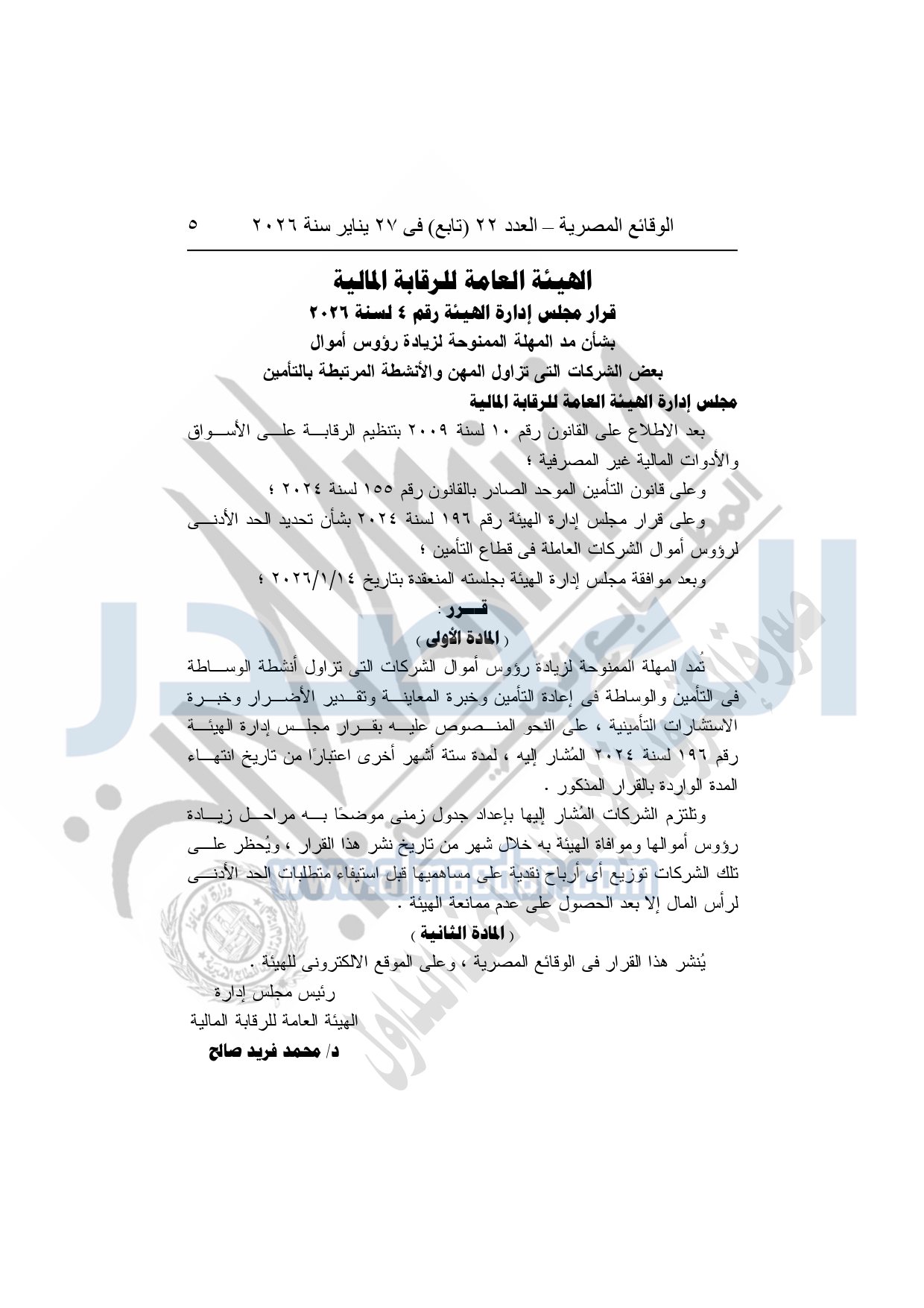 نشرت الوقائع المصرية، في العدد 22 "تابع"، الصادر في 27 يناير سنة 2026، قرار الهيئة العامة للرقابة المالية، رقم 4 لسنة 2026، بشأن مد المهلة الممنوحة لزيادة رؤوس أموال بعض الشركات التى تزاول المهن والأنشطة المرتبطة بالتأمين.