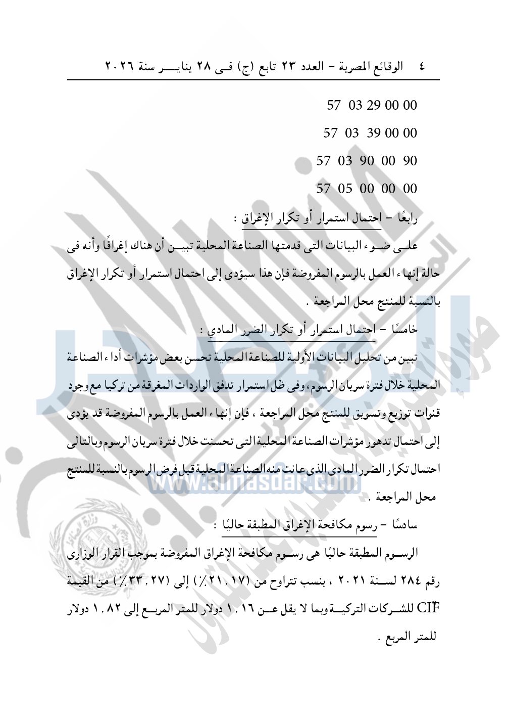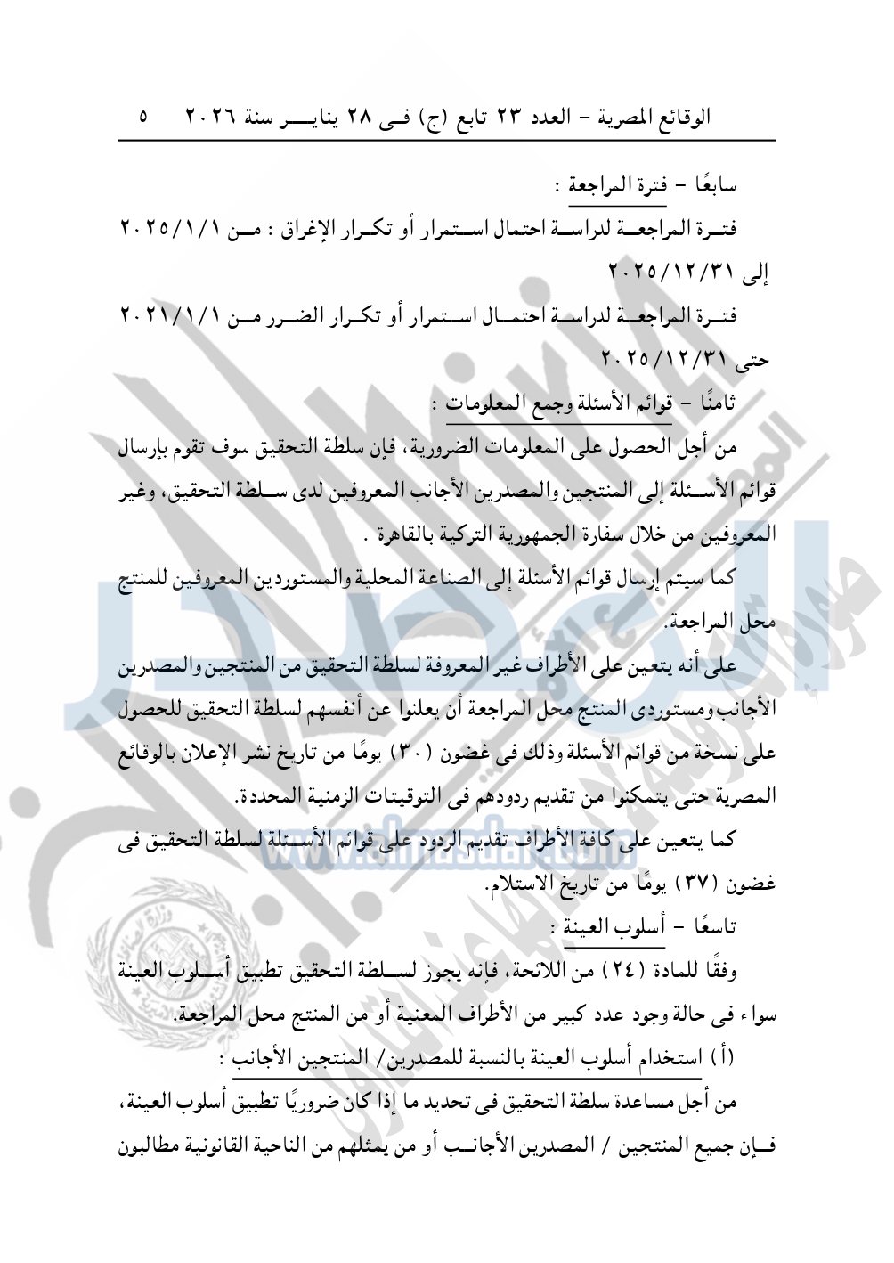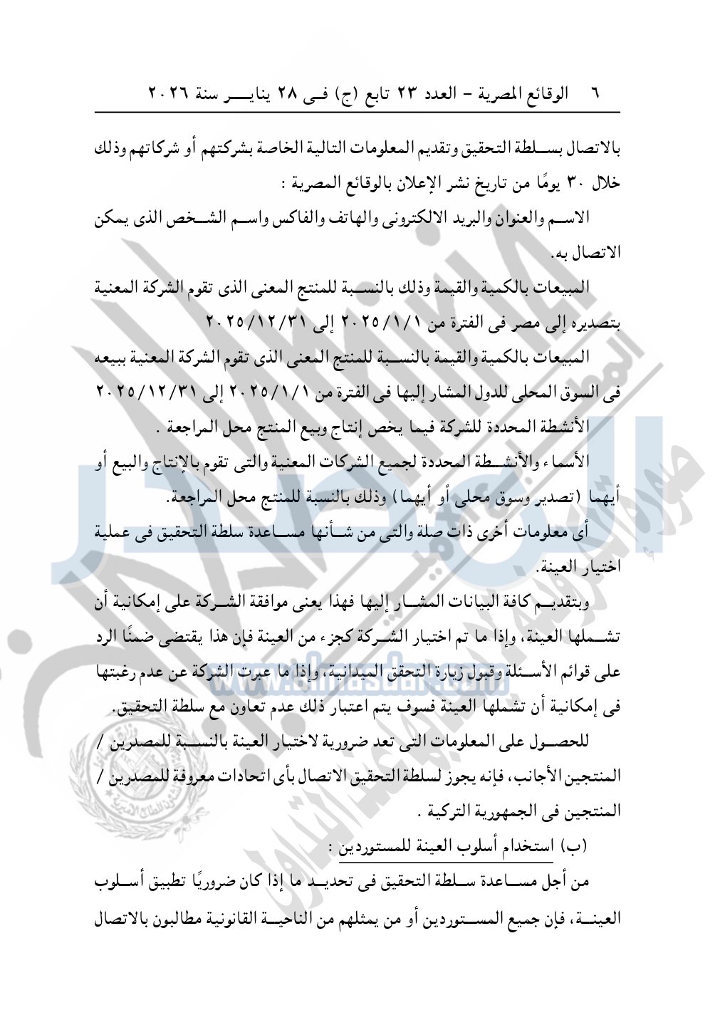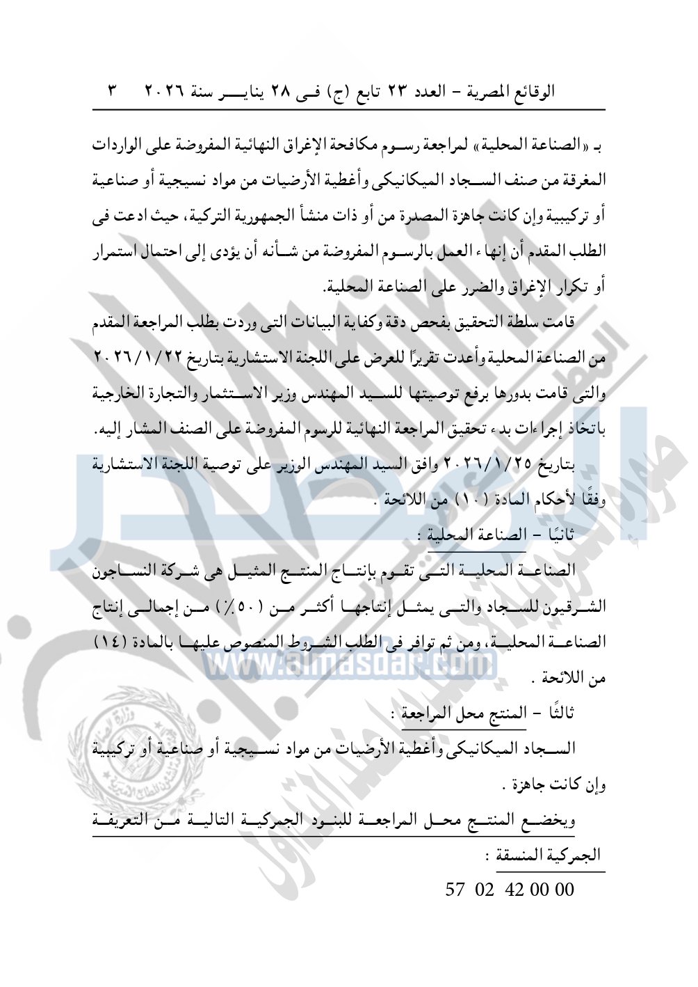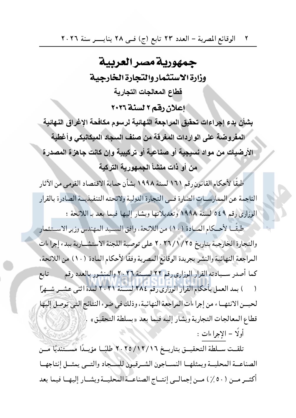 نشرت الوقائع المصرية، في العدد 23 تابع "ج"، الصادر في 28 يناير سنة 2026، قرار وزارة الاستثمار والتجارة الخارجية، رقم 2 لسنة 2026، بشأن بدء إجراءات تحقيق المراجعة النهائية لرسوم مكافحة الإغراق النهائية المفروضة على الواردات المغرقة من صنف السجاد الميكانيكي وأغطية الأرضيات من مواد نسيجية أو صناعية أو تركيبية وإن كانت جاهزة المصدرة من أو ذات منشأ الجمهورية التركية.